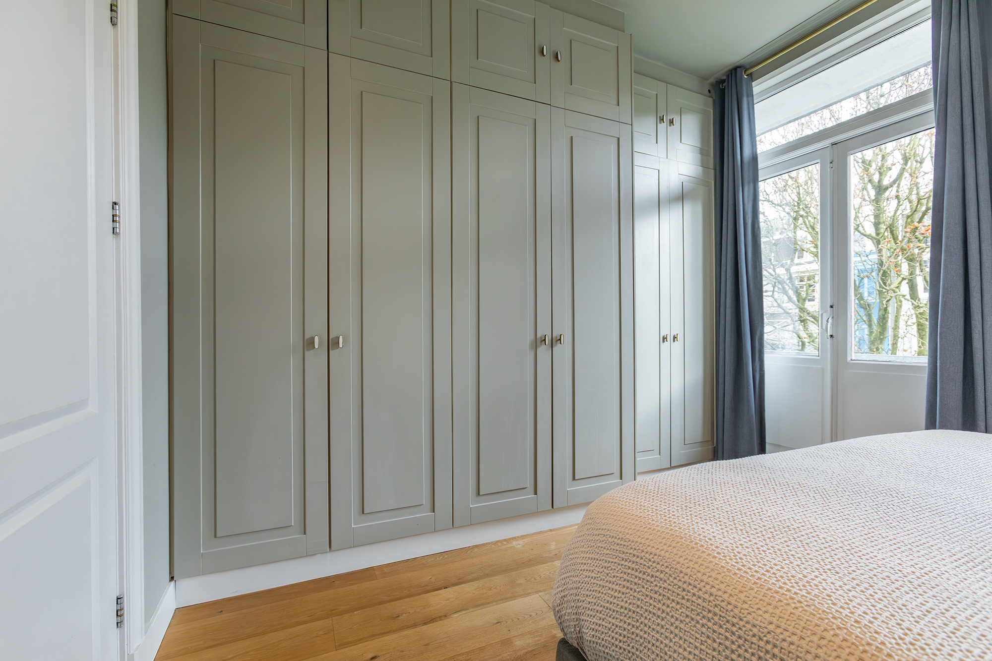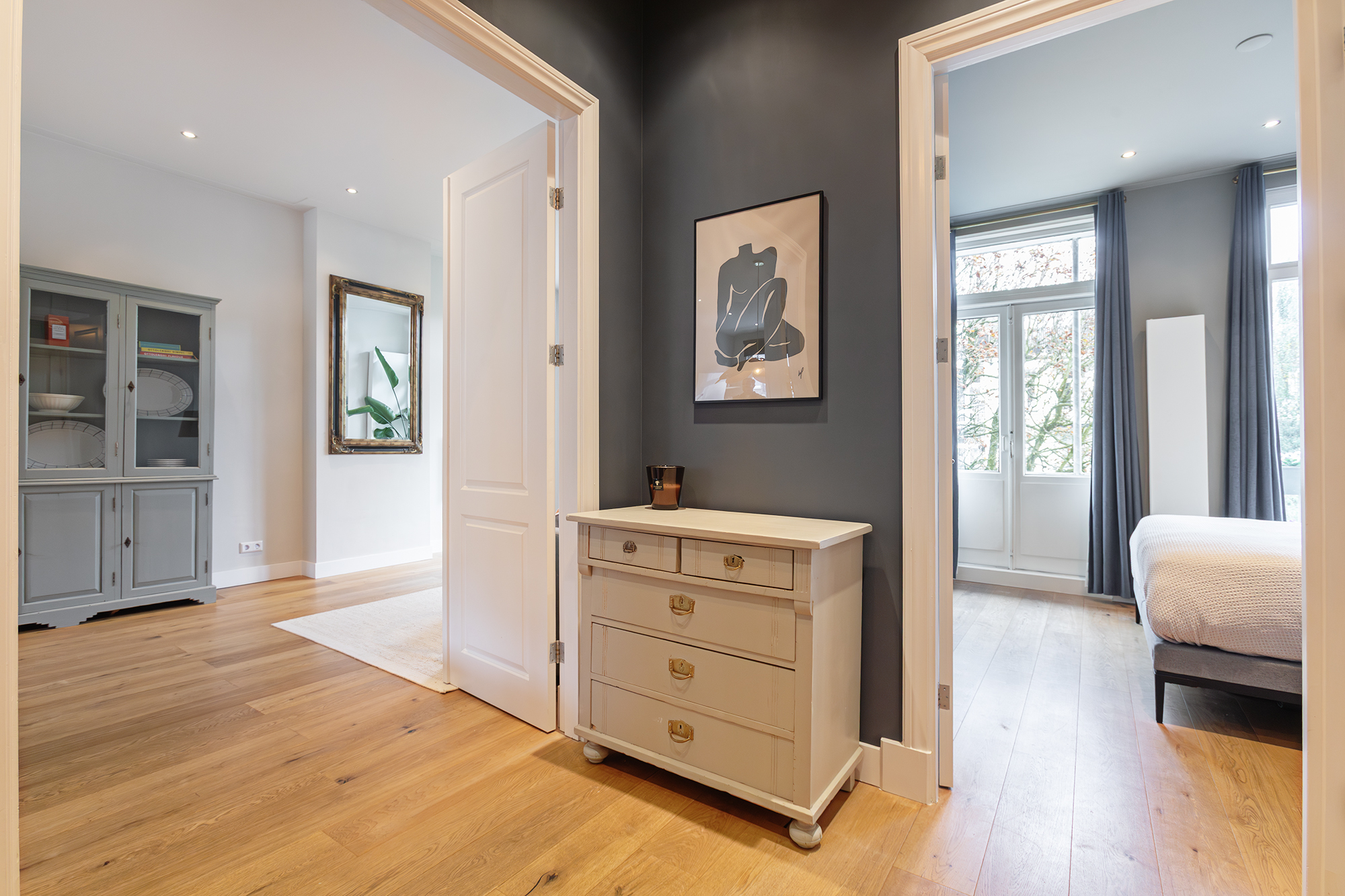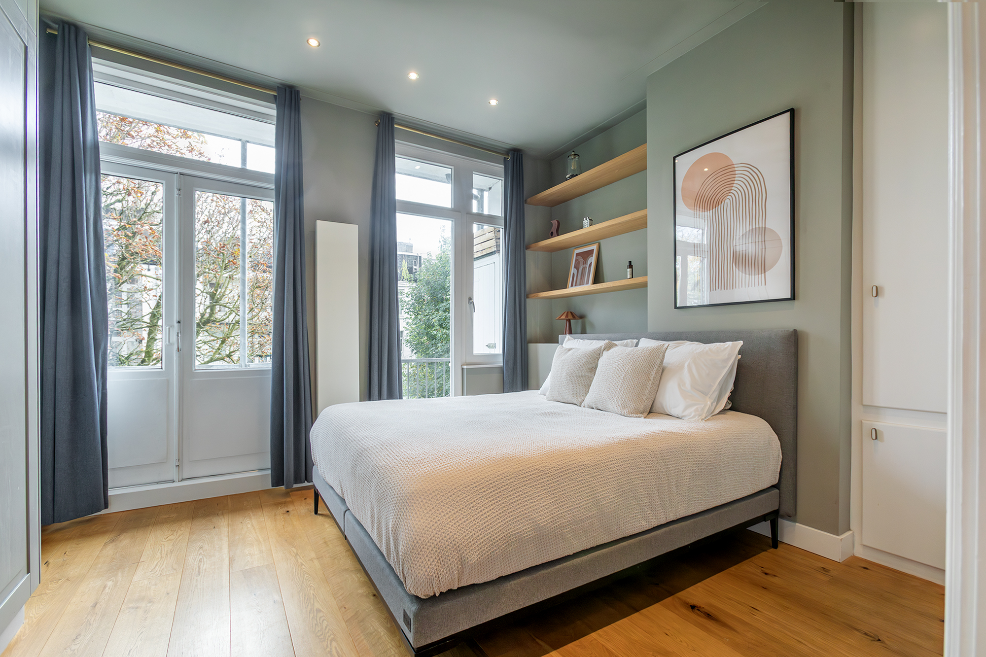 Aan de achterzijde ligt de royale hoofdslaapkamer, voorzien van grote ramen, openslaande deuren naar het balkon en op maat gemaakte inbouwkasten. De tweede slaapkamer ligt aan de voorzijde en is verbonden met een derde kamer, ideaal als werkkamer, kinderkamer of inloopkast. De badkamer is in 2021 vernieuwd en heeft een luxe uitstraling met een moderne inloopdouche met regendouchekop, strak wastafelmeubel, glazen douchewand en handdoekradiator. Separaat toilet met fonteintje aanwezig.