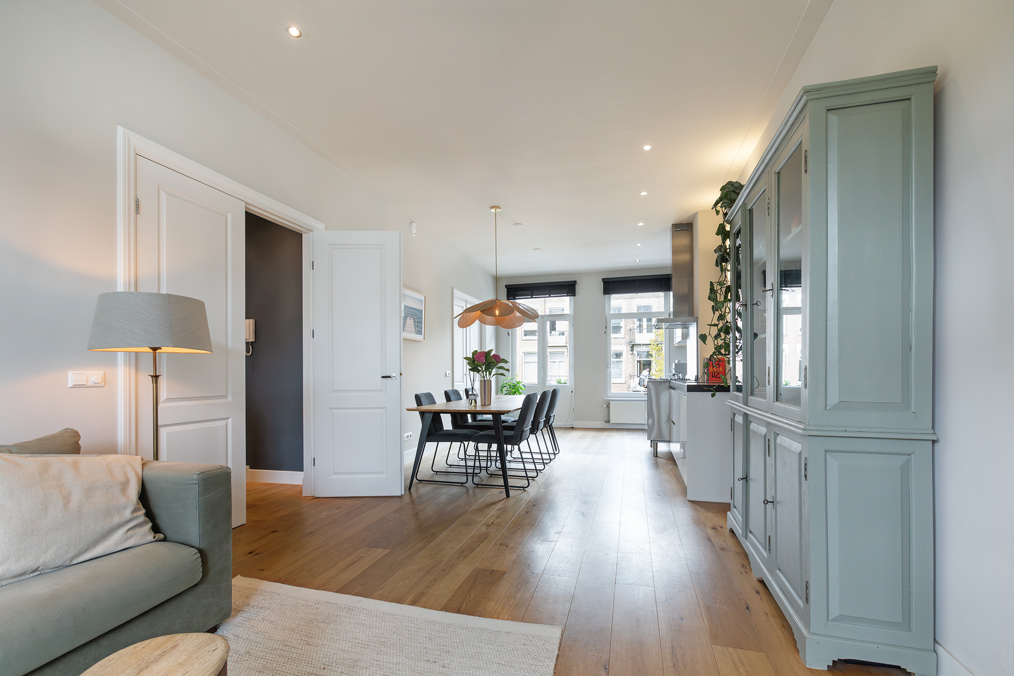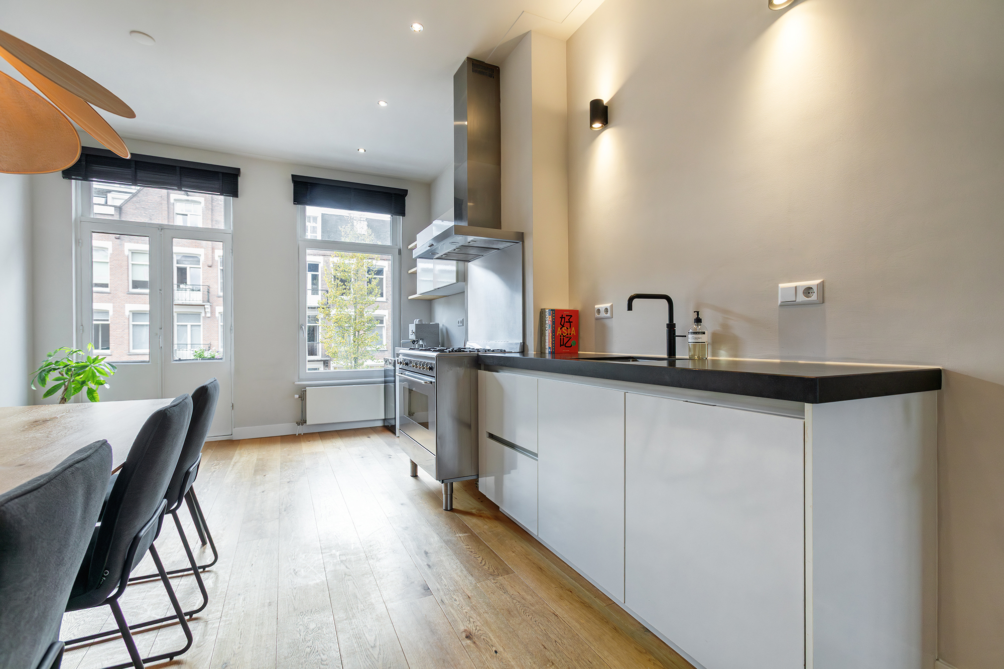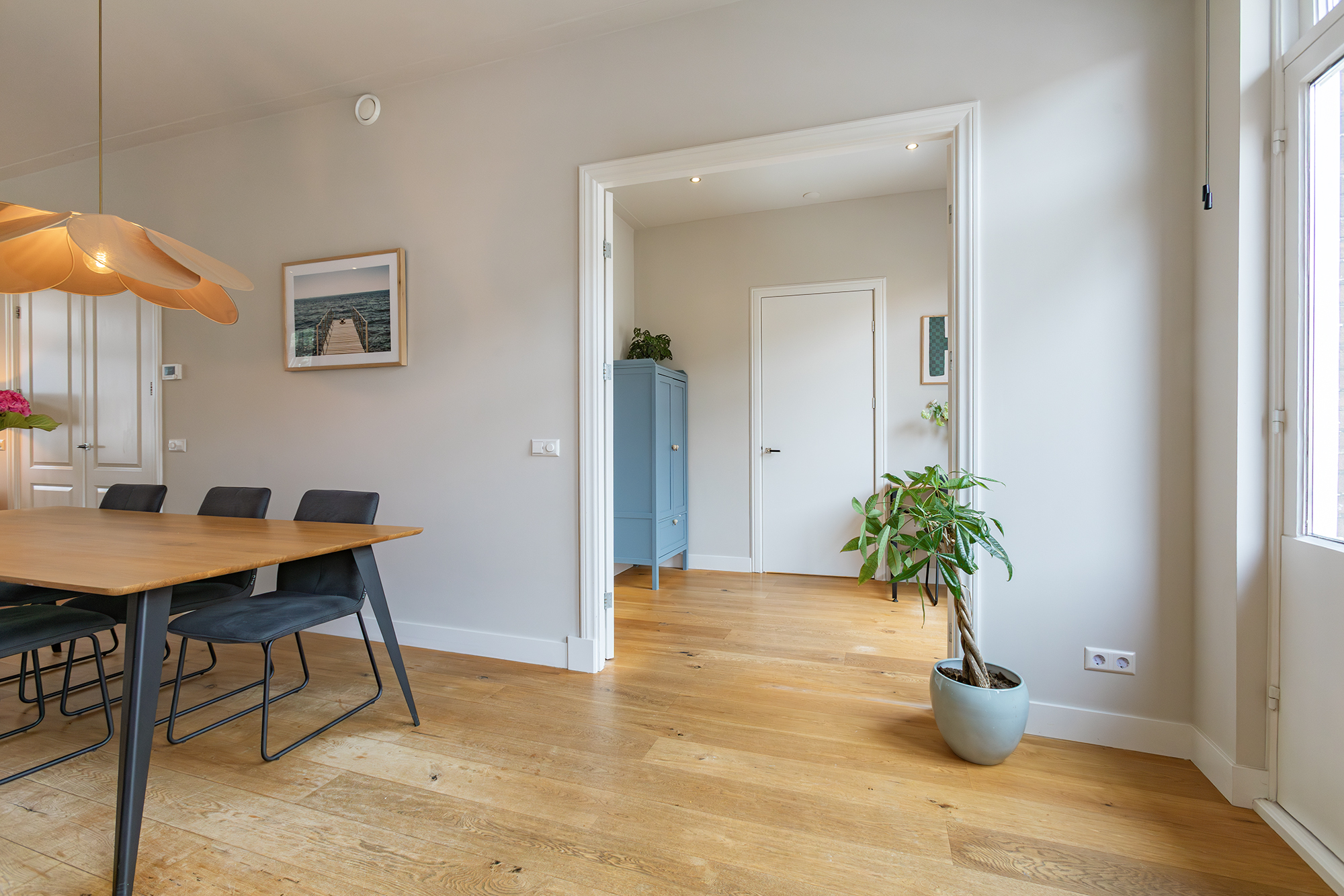 De woonkamer is heerlijk ruim en licht. Door de ligging van voor naar achter en de plafondhoogte van 3 meter voelt het hier bijzonder ruimtelijk aan. Aan de achterzijde vind je de zitkamer met openslaande deuren naar het brede balkon op het oosten: hier drink je je koffie in de ochtendzon. Aan de voorzijde bevindt zich de open keuken met toegang tot het Franse balkon op het westen – perfect voor de avondzon. De stijl van de woning is strak en warm tegelijk, met een mooie eikenhouten vloer, sfeervolle inbouwspots en nette afwerking. De indeling is doordacht, waardoor elke ruimte optimaal benut wordt.