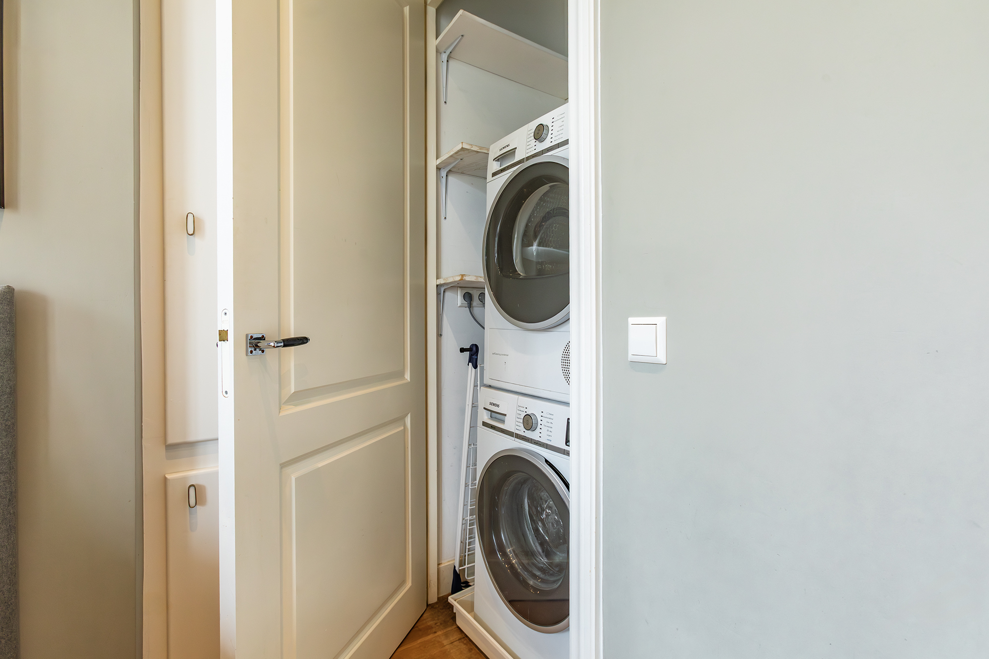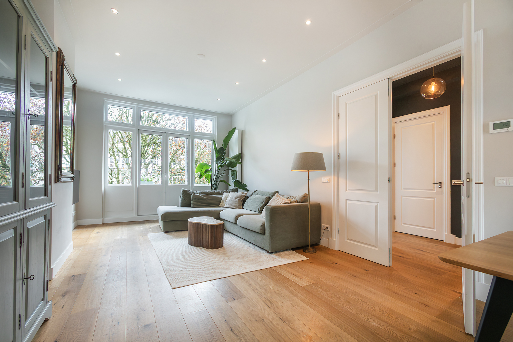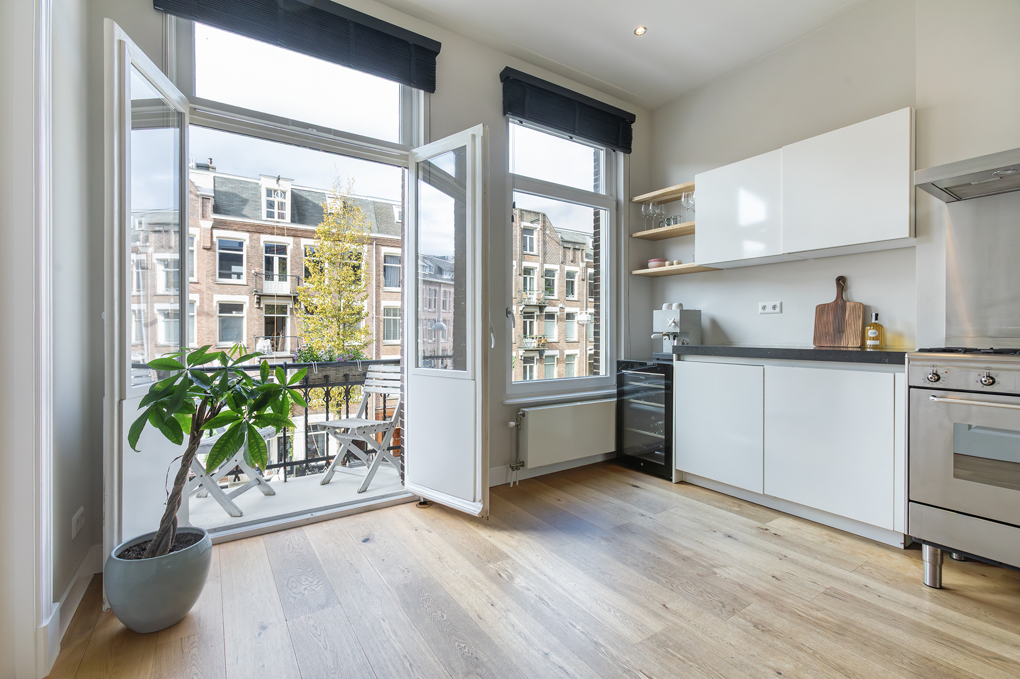 De woonkamer is heerlijk ruim en licht. Door de ligging van voor naar achter en de plafondhoogte van 3 meter voelt het hier bijzonder ruimtelijk aan. Aan de achterzijde vind je de zitkamer met openslaande deuren naar het brede balkon op het oosten: hier drink je je koffie in de ochtendzon. Aan de voorzijde bevindt zich de open keuken met toegang tot het Franse balkon op het westen – perfect voor de avondzon. De stijl van de woning is strak en warm tegelijk, met een mooie eikenhouten vloer, sfeervolle inbouwspots en nette afwerking. De indeling is doordacht, waardoor elke ruimte optimaal benut wordt.