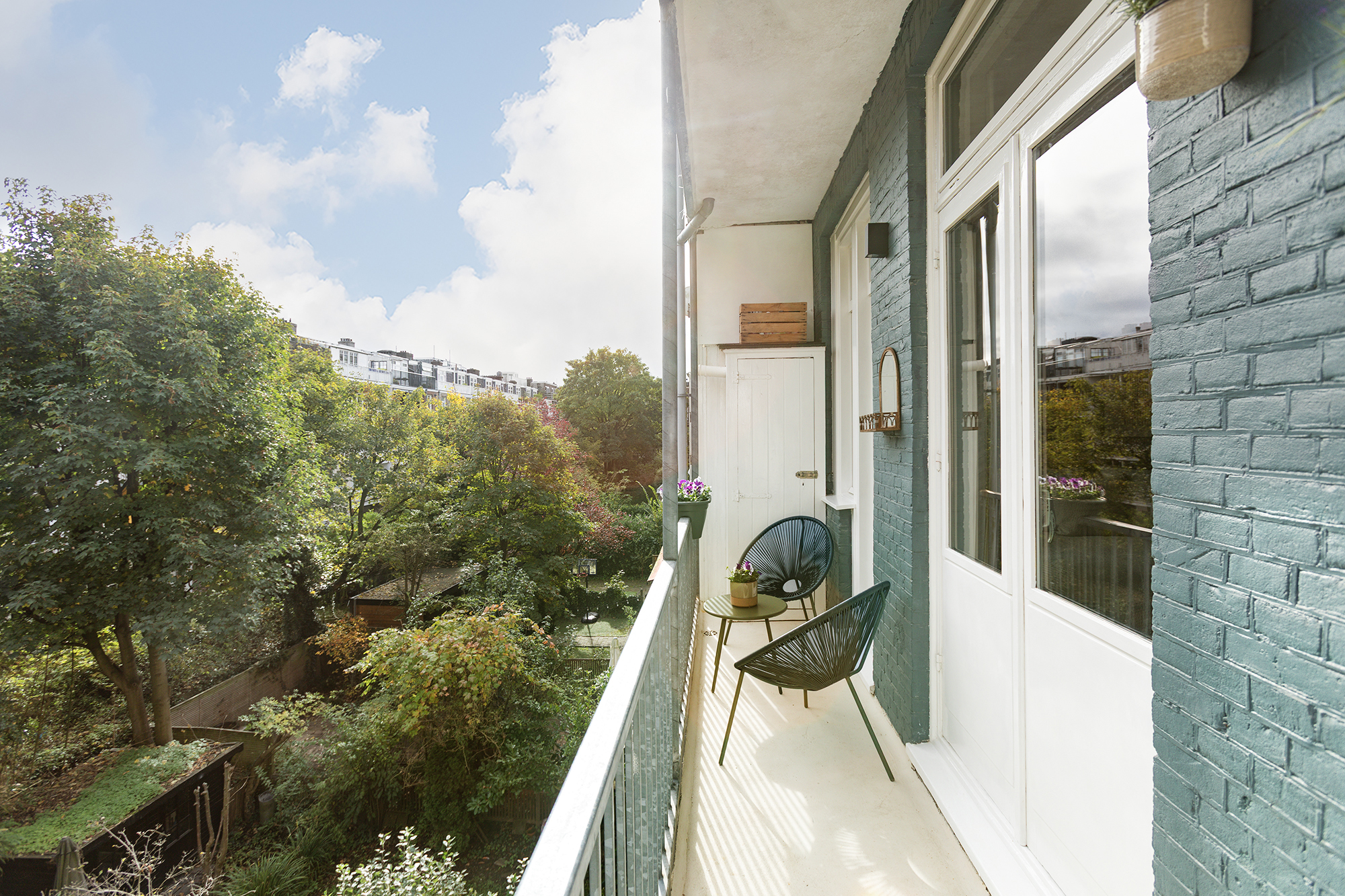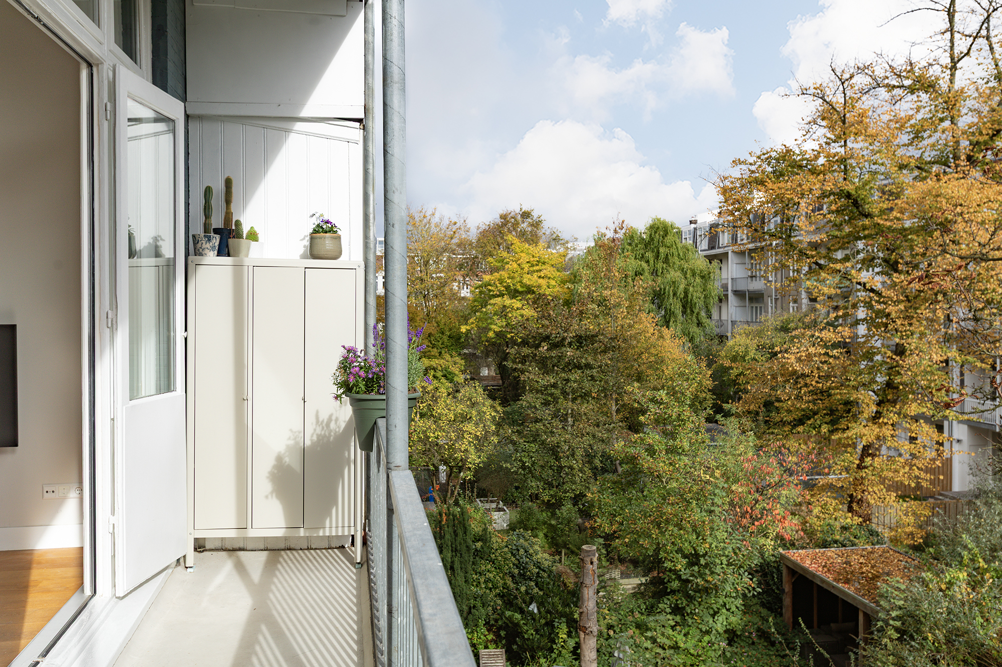 The rear balcony spans the full width of the apartment, with space for seating or plants and sun until around 2 p.m. At the front, a small but charming balcony catches the afternoon and evening sun — a perfect spot for two. The rear view overlooks deep, green gardens, and in summer a large tree blooms beautifully. Lighting has been installed for long summer evenings outdoors.