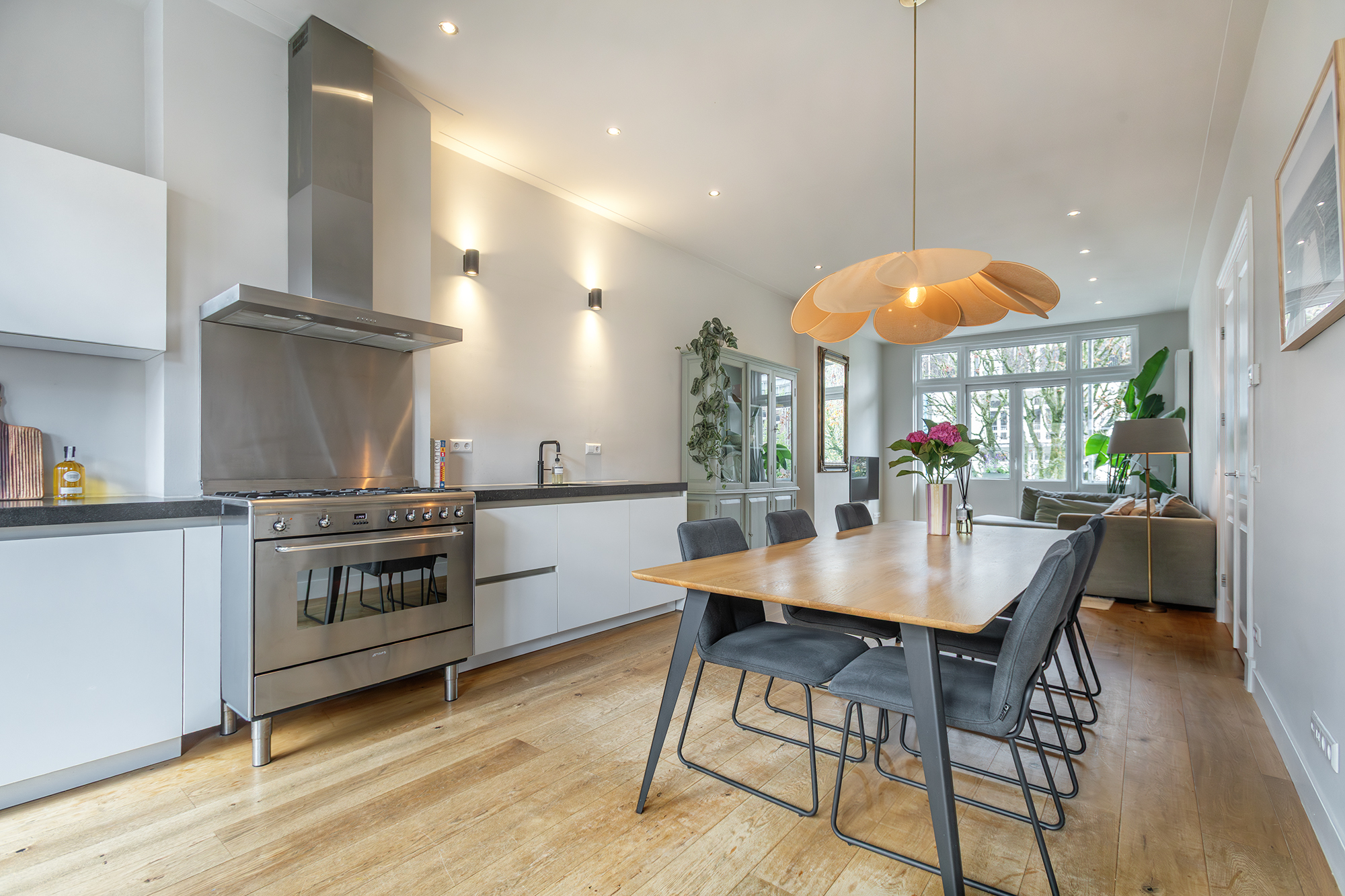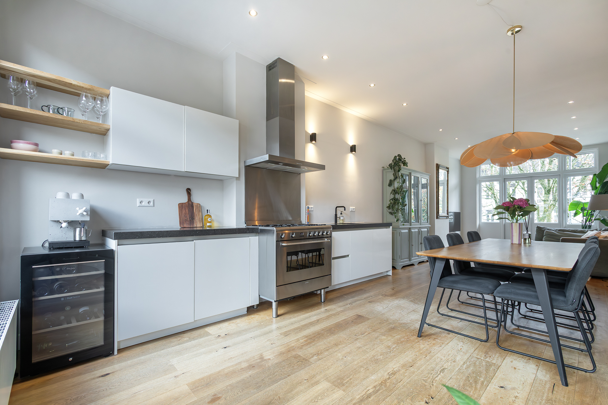 De open keuken ligt aan de voorzijde van het huis. Je kookt hier op een groot gasfornuis van Smeg met bijpassende oven, en hebt de luxe van een Quookermet kokend en bruisend water. Vaatwasser en koelkast zijn vernieuwd in 2024. De lichte kastjes, het stenen werkblad en moderne afzuigkap maken het geheel af. Er is genoeg ruimte voor potten, pannen en voorraad.