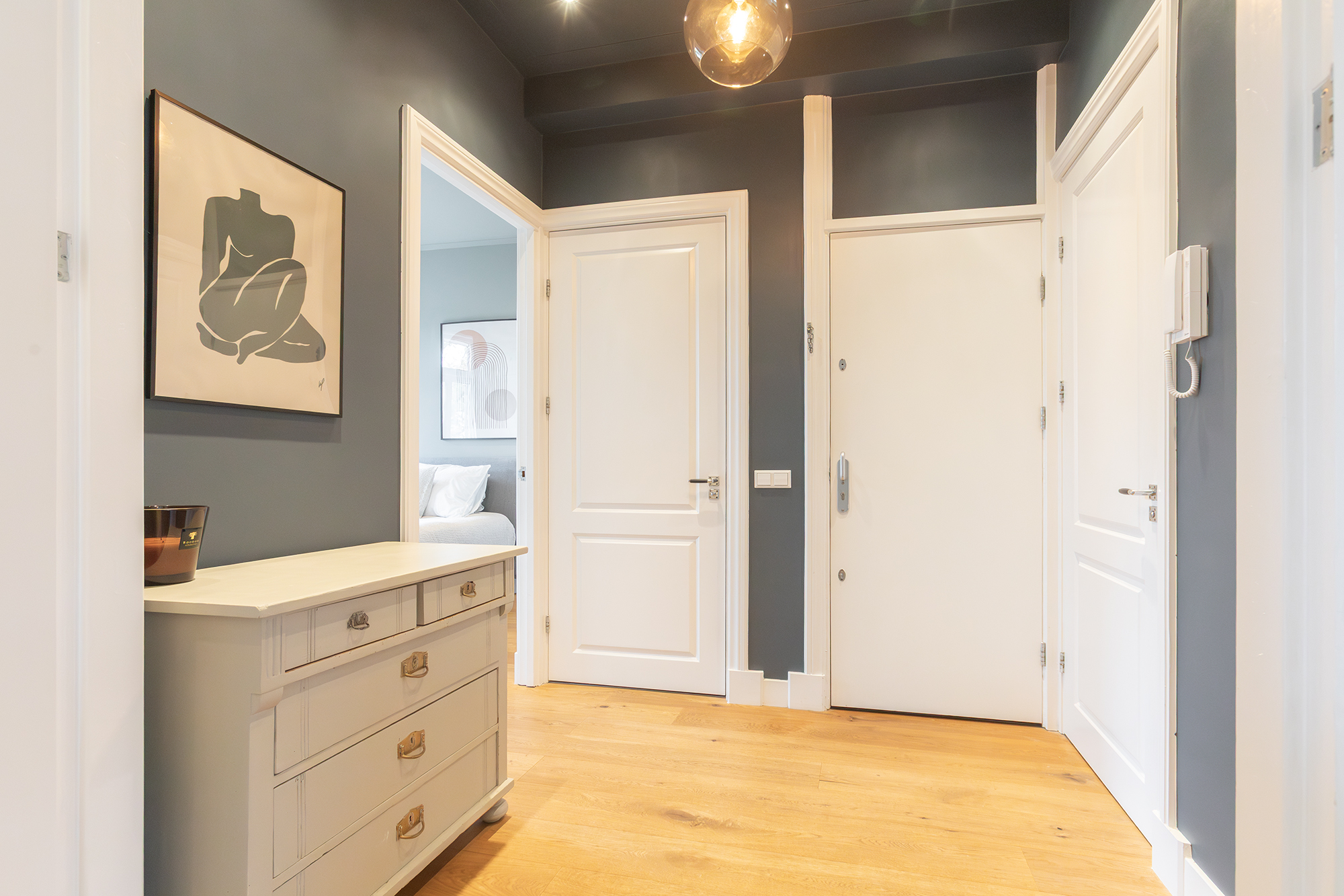 The apartment combines clean lines with warmth and atmosphere, featuring a beautiful oak floor, recessed lighting, and neat finishes. The floor plan is well thought-out, making optimal use of every space.
