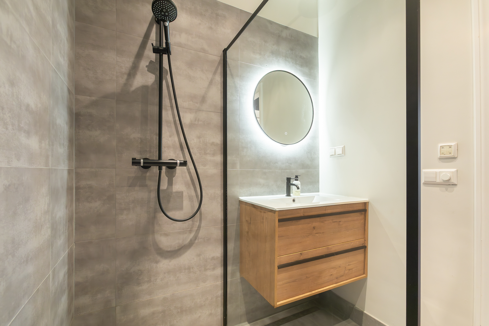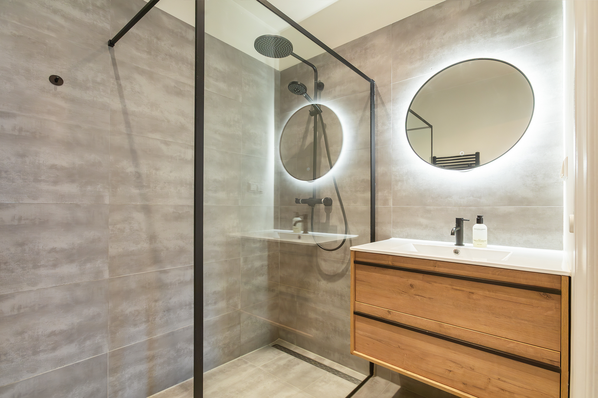 The bathroom, renovated in 2021, has a luxurious, modern feel with a walk-in rain shower, sleek vanity, glass shower wall, and heated towel radiator. A separate toilet with small sink is also provided.