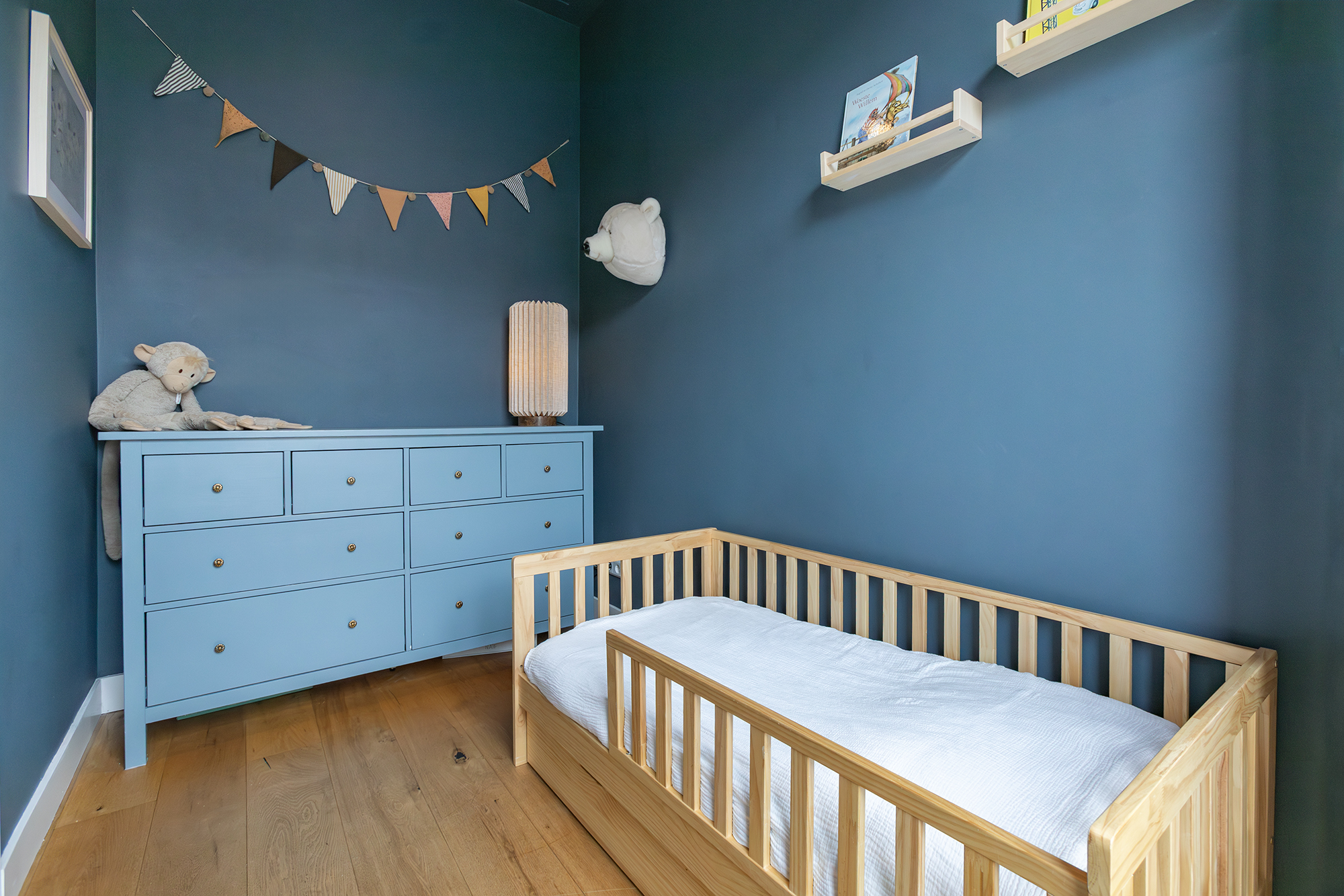 The second bedroom is located at the front and adjoins a third room — ideal as a study, child’s room, or walk-in closet.