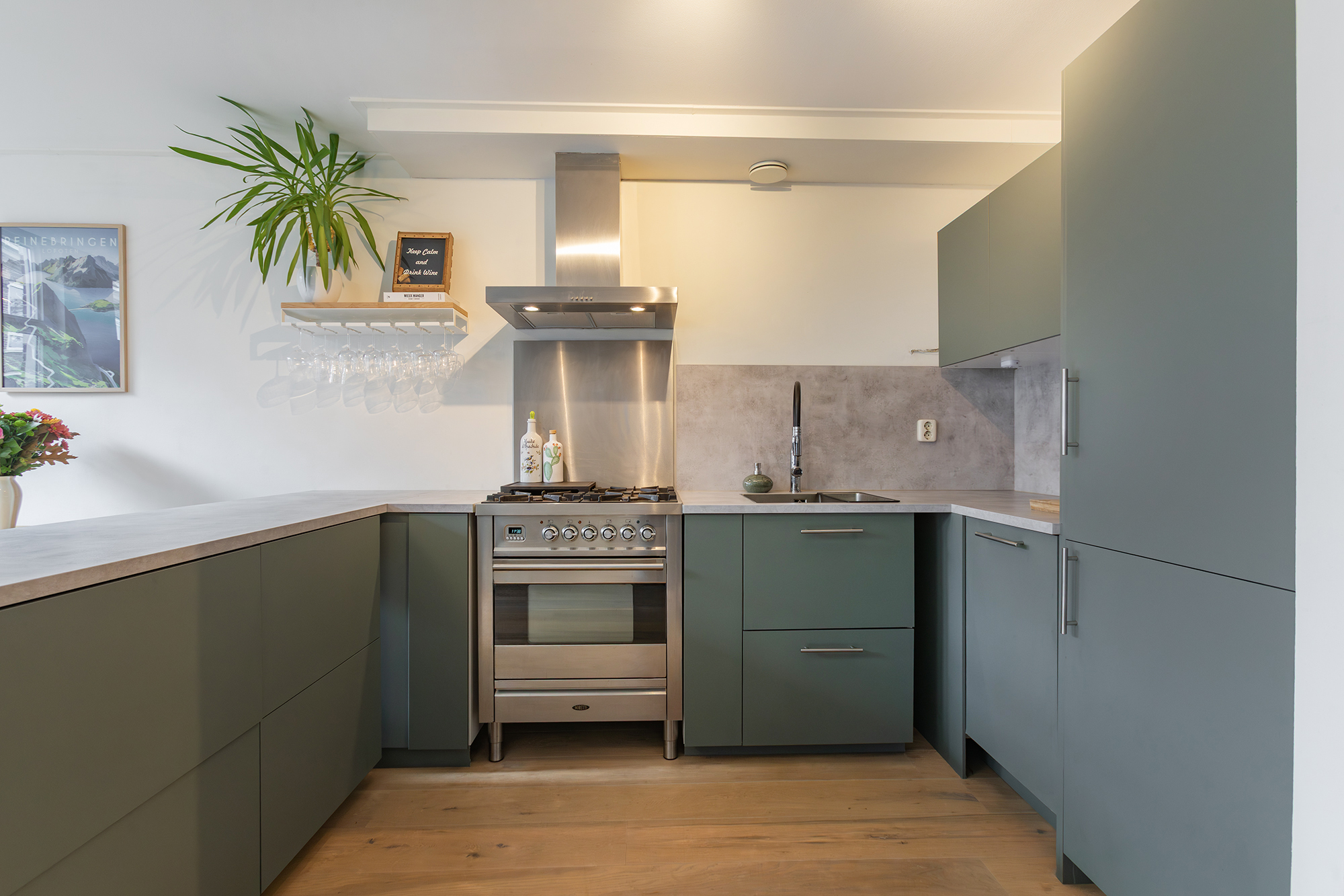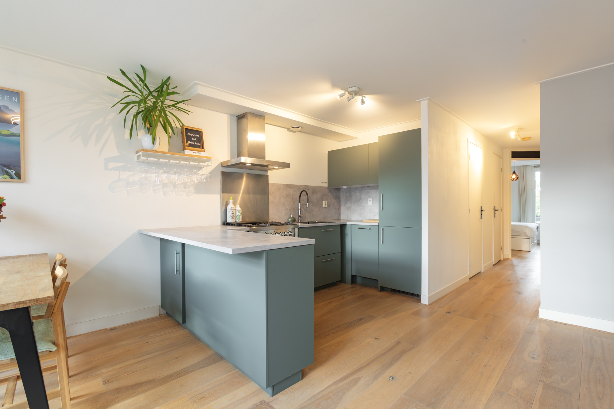 De lichte woonkamer ligt aan de voorzijde en heeft een moderne open keuken (2021) voorzien van inbouwapparatuur. De ruimte is smaakvol afgewerkt met een fraaie lamelparketvloer en een prettige lichtinval dankzij de grote raampartijen.