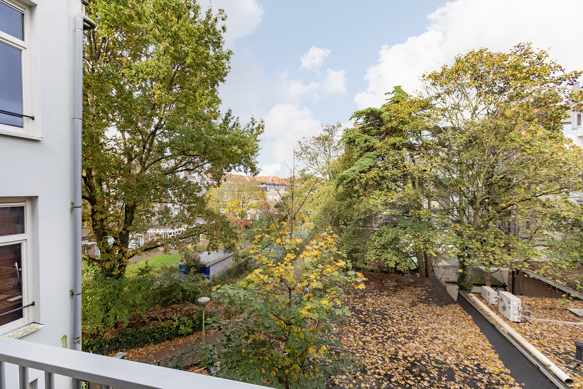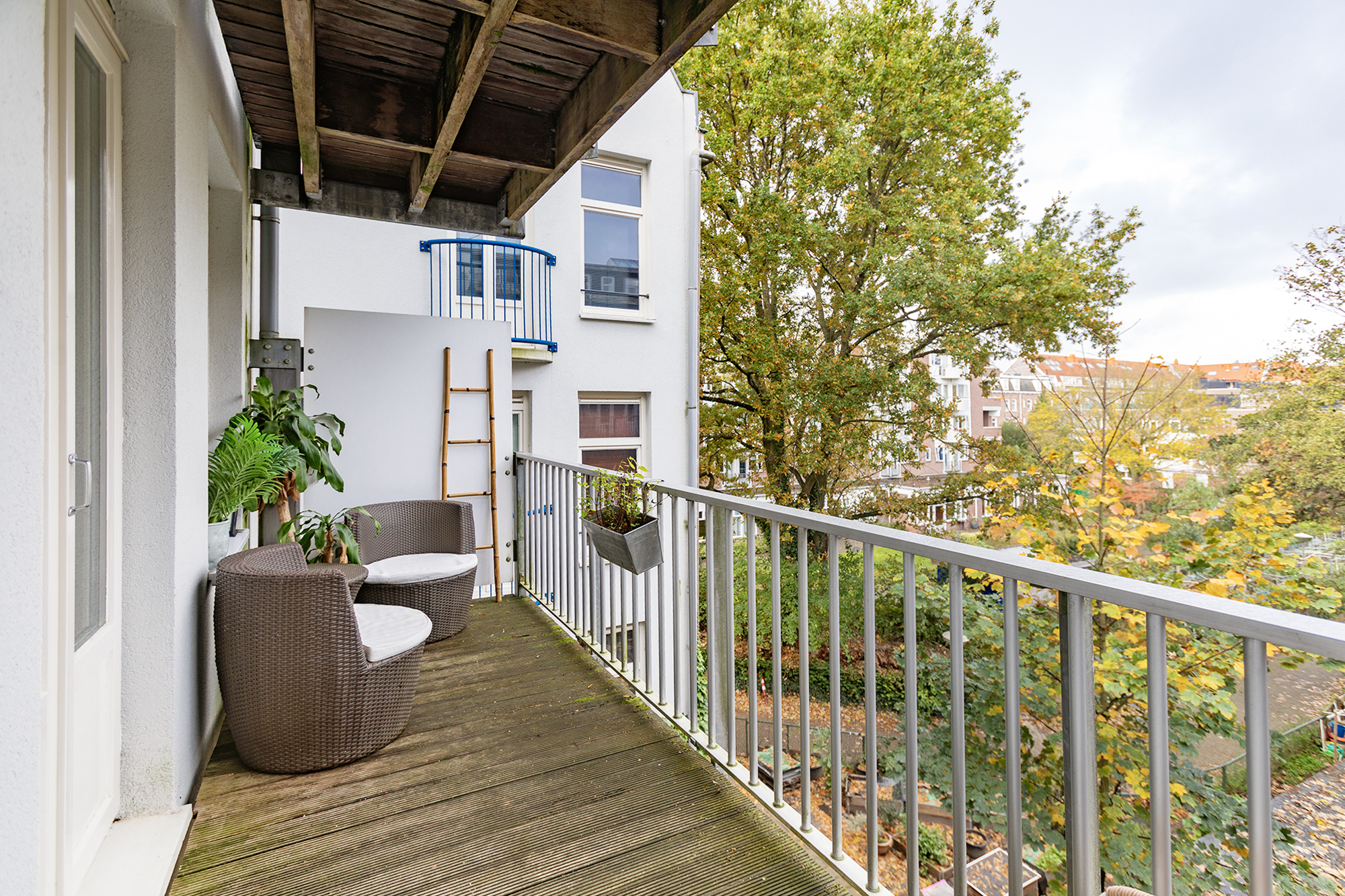 The deep balcony (8 m2) at the quiet rear overlooks lush greenery, a delightful spot for your morning coffee or an evening drink in peace.