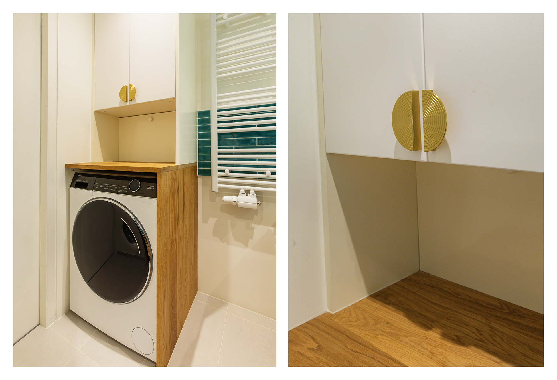 The modern bathroom includes a shower, washbasin unit and connection for a washing machine. There is also a separate toilet with a small sink and a built-in cupboard housing the central heating system. The current owner has combined colour and design beautifully, resulting in a warm and inviting interior.