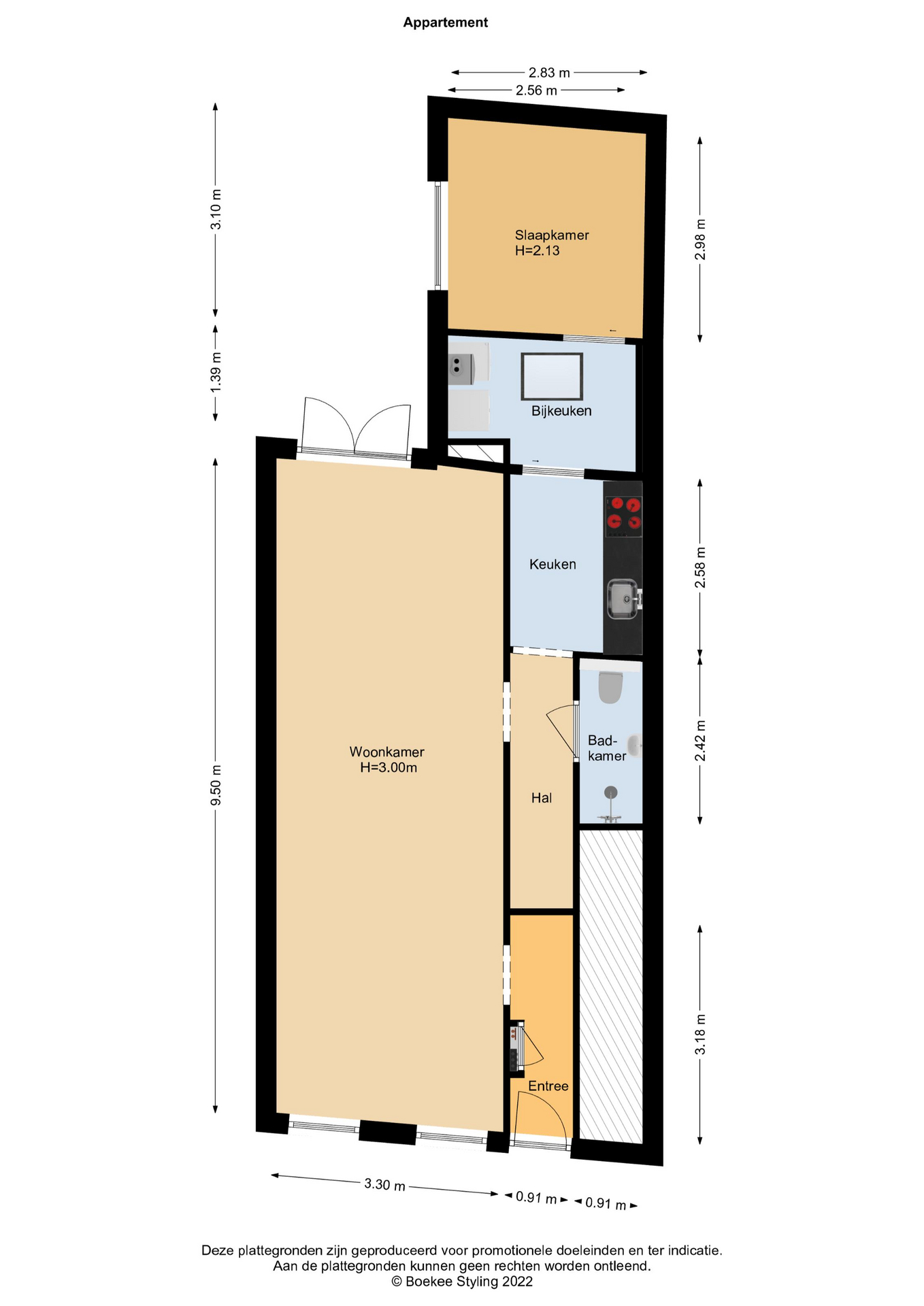 Het woonoppervlak bedraagt circa 60 m², exclusief de patio. Meetrapport conform NEN2580 is beschikbaar.