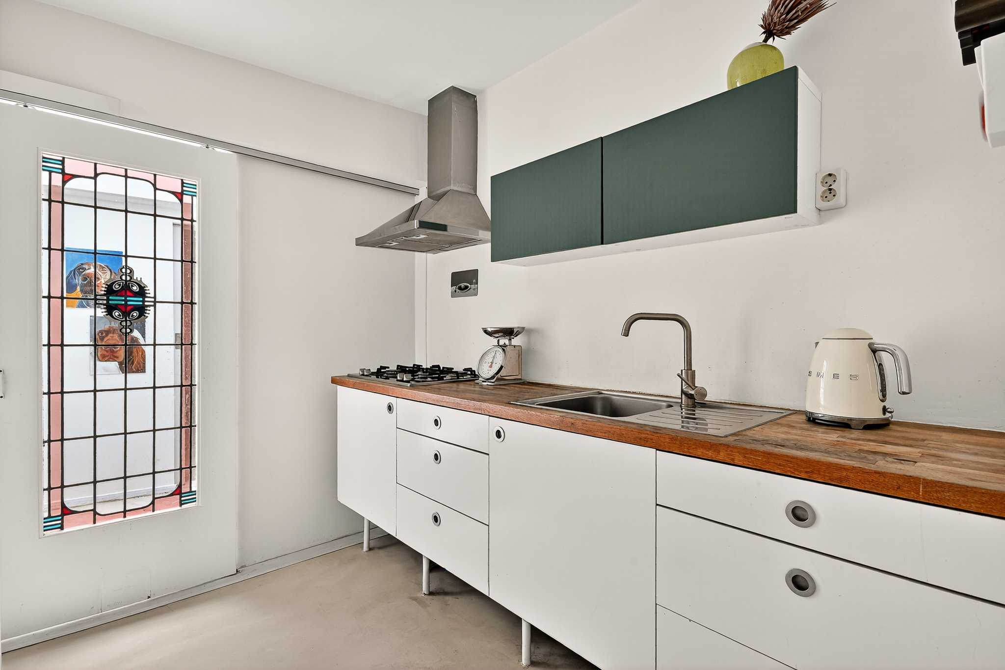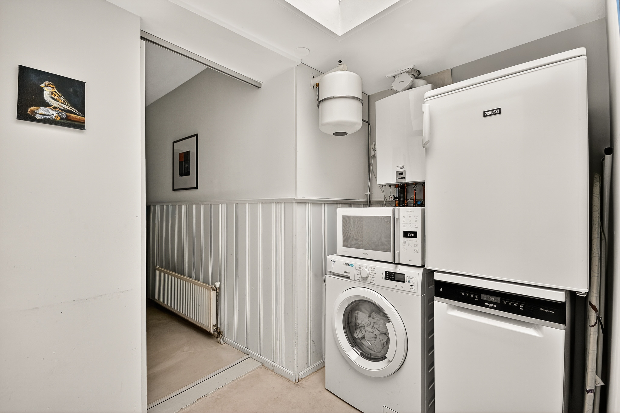 De dichte keuken is netjes en praktisch ingericht met een 4-pits gasfornuis en afzuigkap. In de aangrenzende bijkeuken met dakraam vind je de wasmachine-/drogeropstelling, de vaatwasser, de koel- vriescombinatie en de CV-ketel.