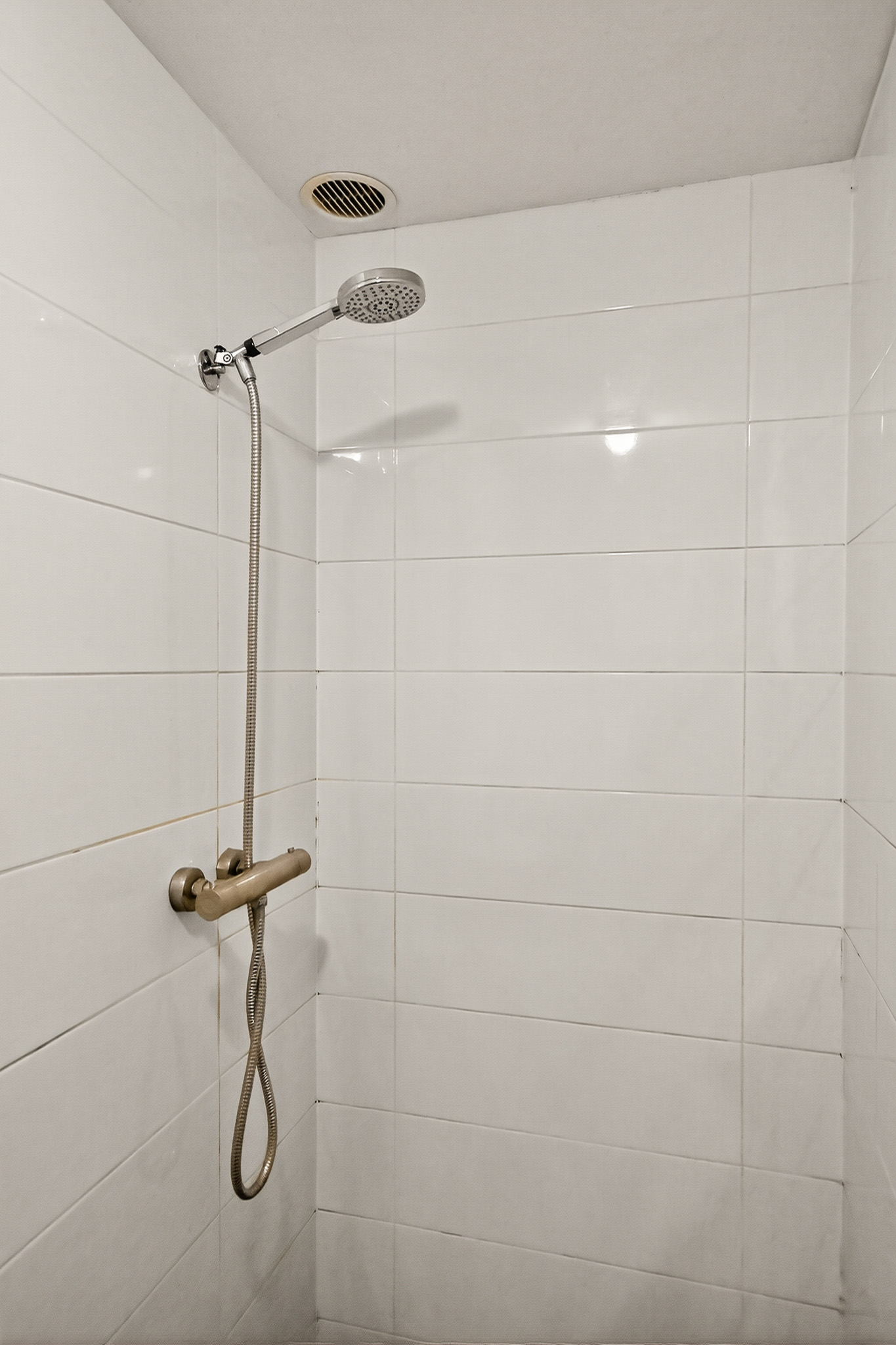 De badkamer is compact maar functioneel, voorzien van een douche, toilet, wastafel en vloerverwarming.