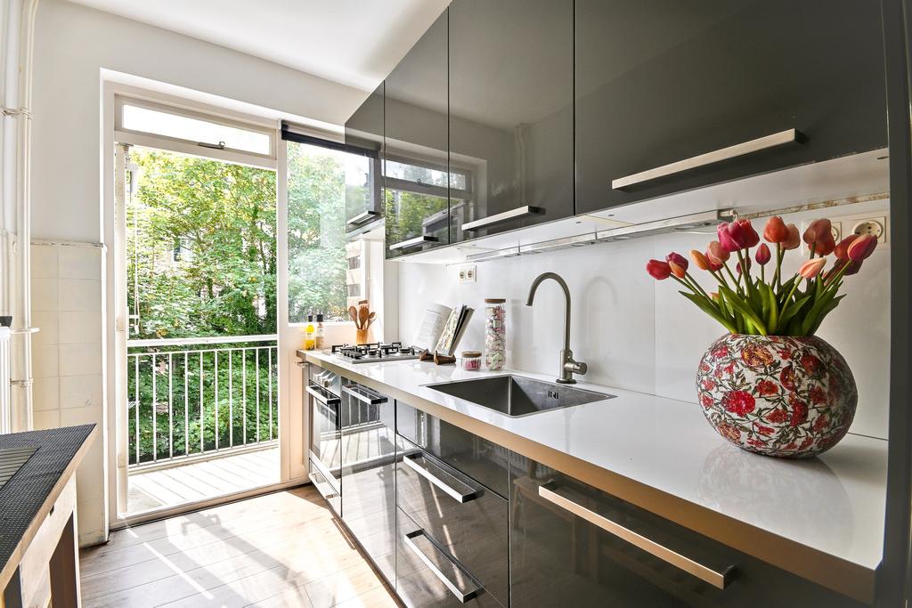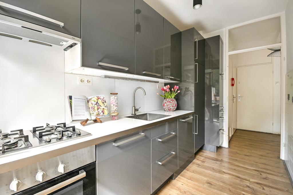 De lichte ruime woonkamer ligt aan de straatzijde. De moderne grijze keuken ligt aan de achterzijde en heeft toegang tot het balkon.