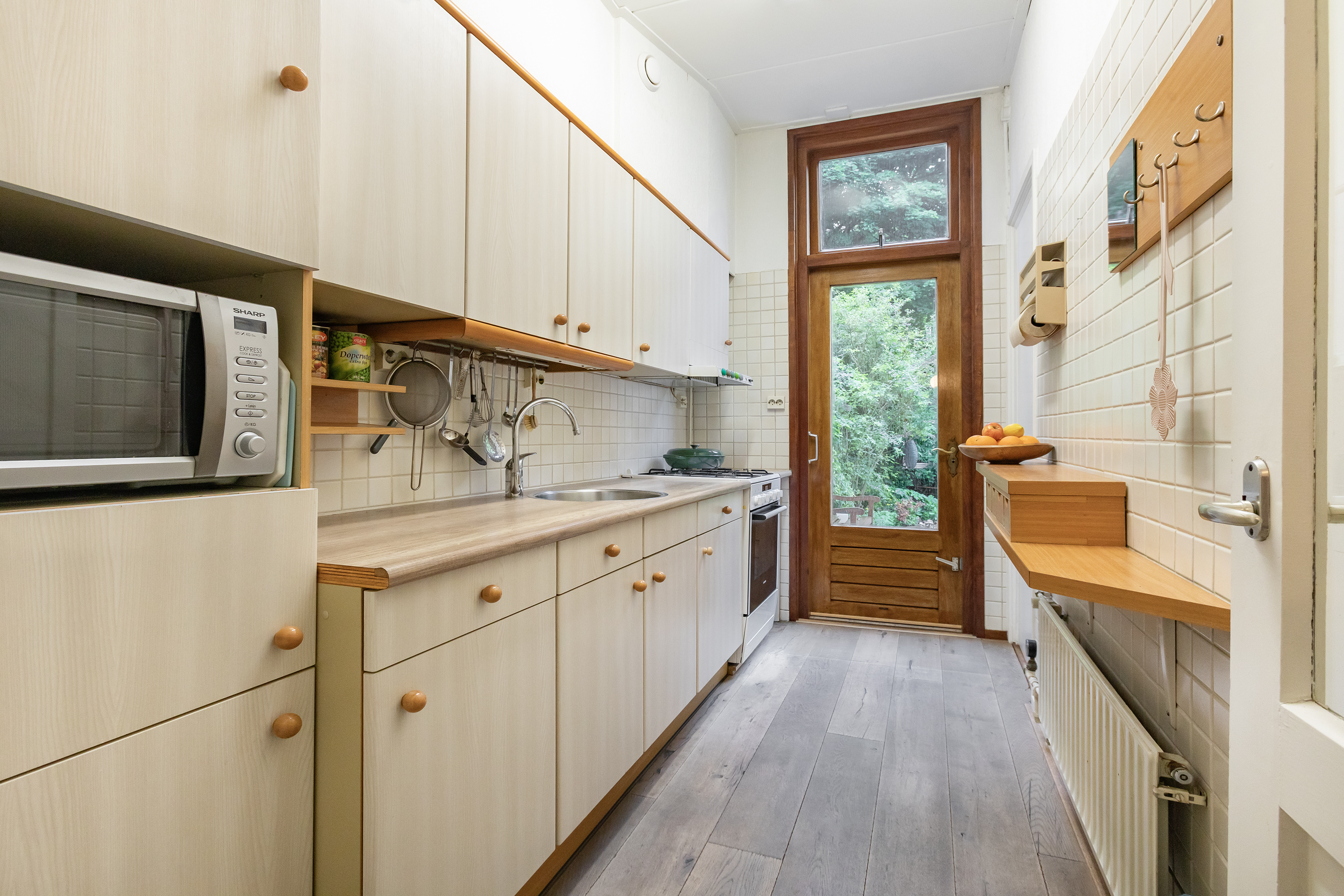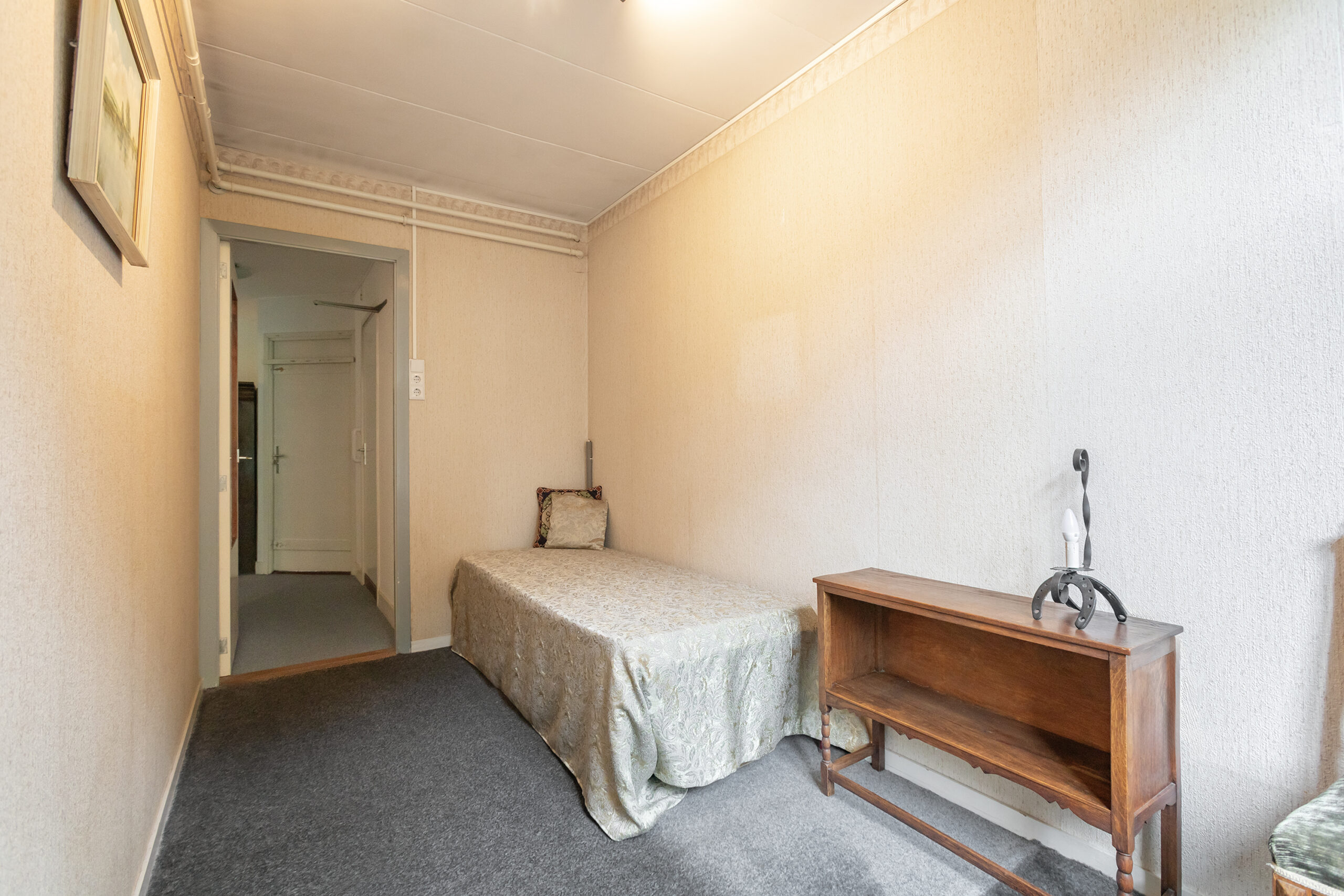 The ground floor consists of a private entrance with access to the milk shop, which is currently used as a cloakroom/hall. You then walk through to the living room with a partially open kitchen, toilet, built-in storage cupboard and access to the 20-metre deep garden. In the garden there is a very spacious shed on a concrete foundation. There is an internal staircase to the first floor, which consists of three bedrooms and a simple bathroom.