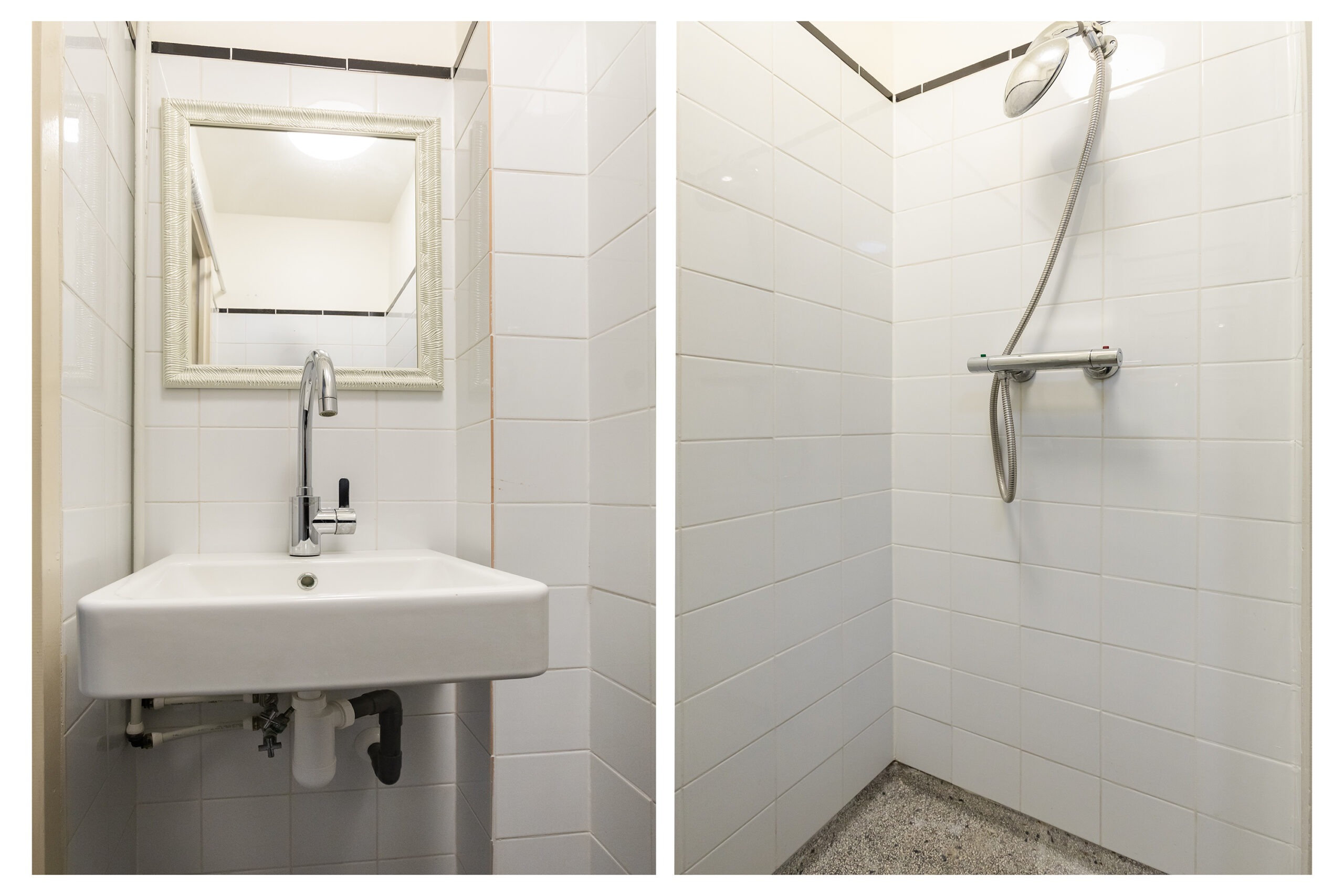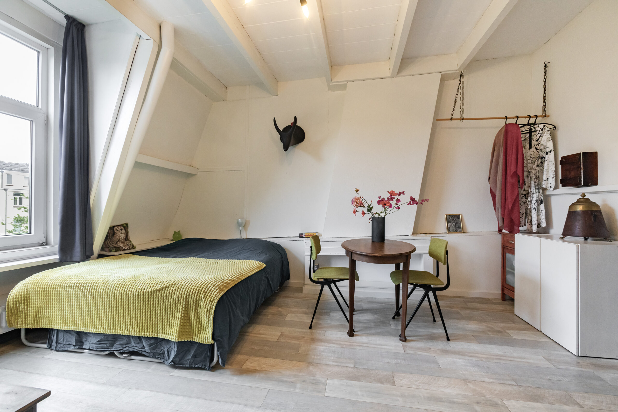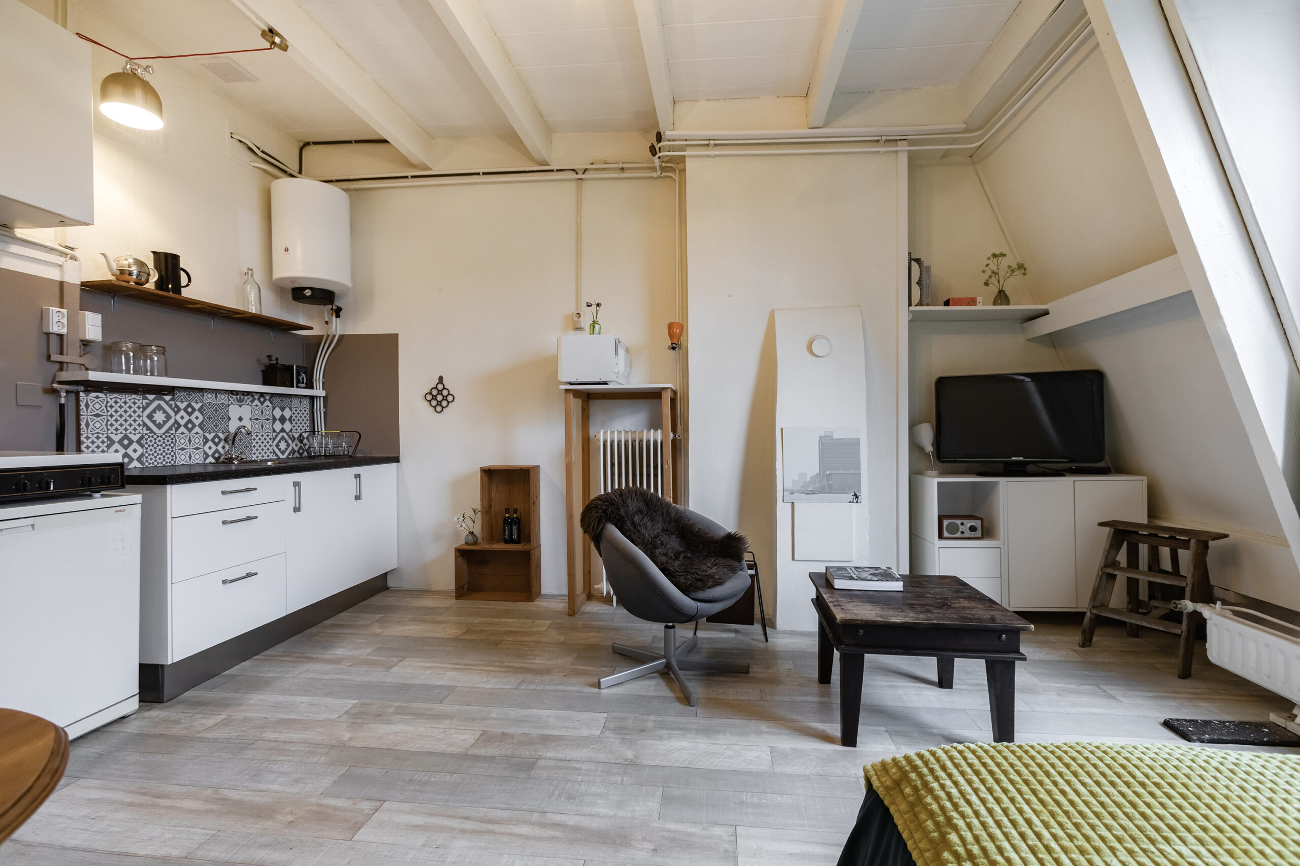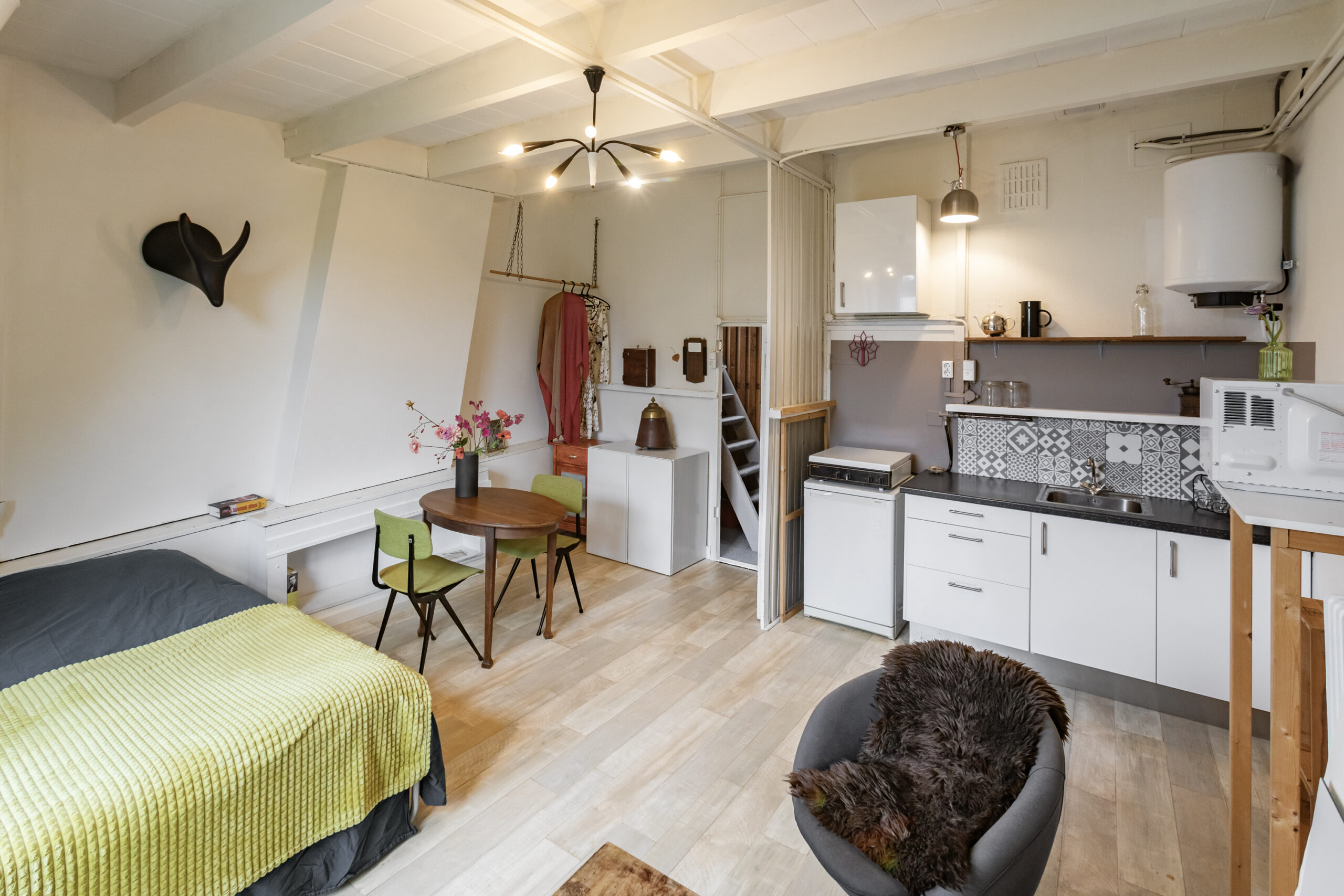 Studio op de 4e etage bestaande uit een woon- slaapkamer met open keukenblok en toilet en douche op de overloop.