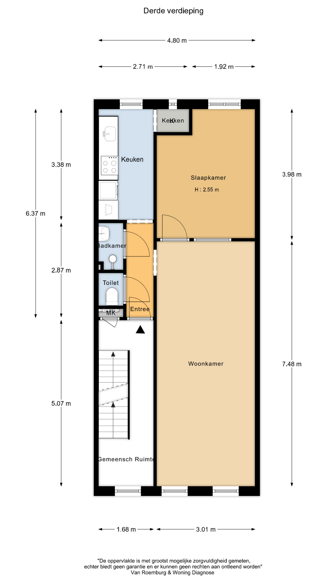 Het pand bestaat uit 5 woonlagen en 3 zelfstandige woonruimten. Alleen de woning op 3e verdieping wordt verhuurd opgeleverd; de studio op zolder is voor een tijdelijke periode verhuurd.