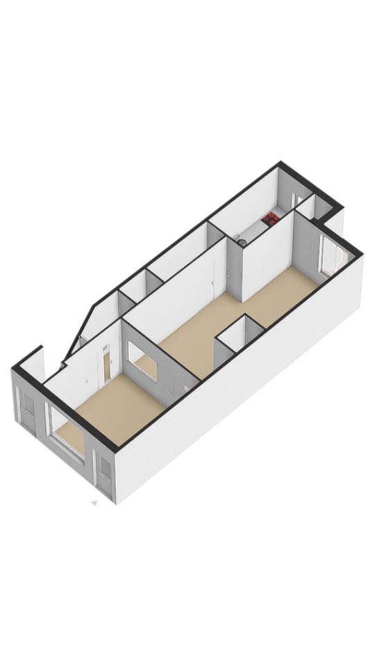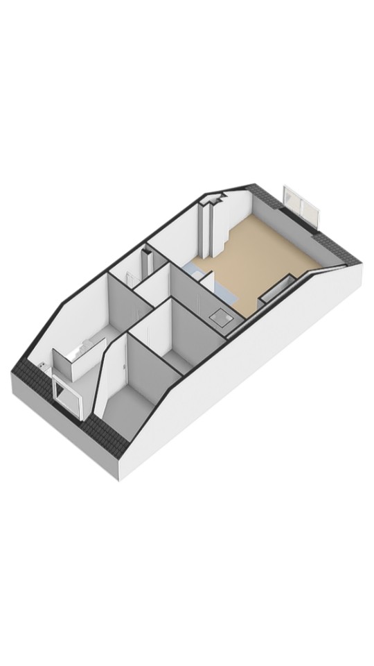 Woning op de 3e etage bestaande uit een woonkamer, slaapkamer, eenvoudige badkamer, toilet en keuken.