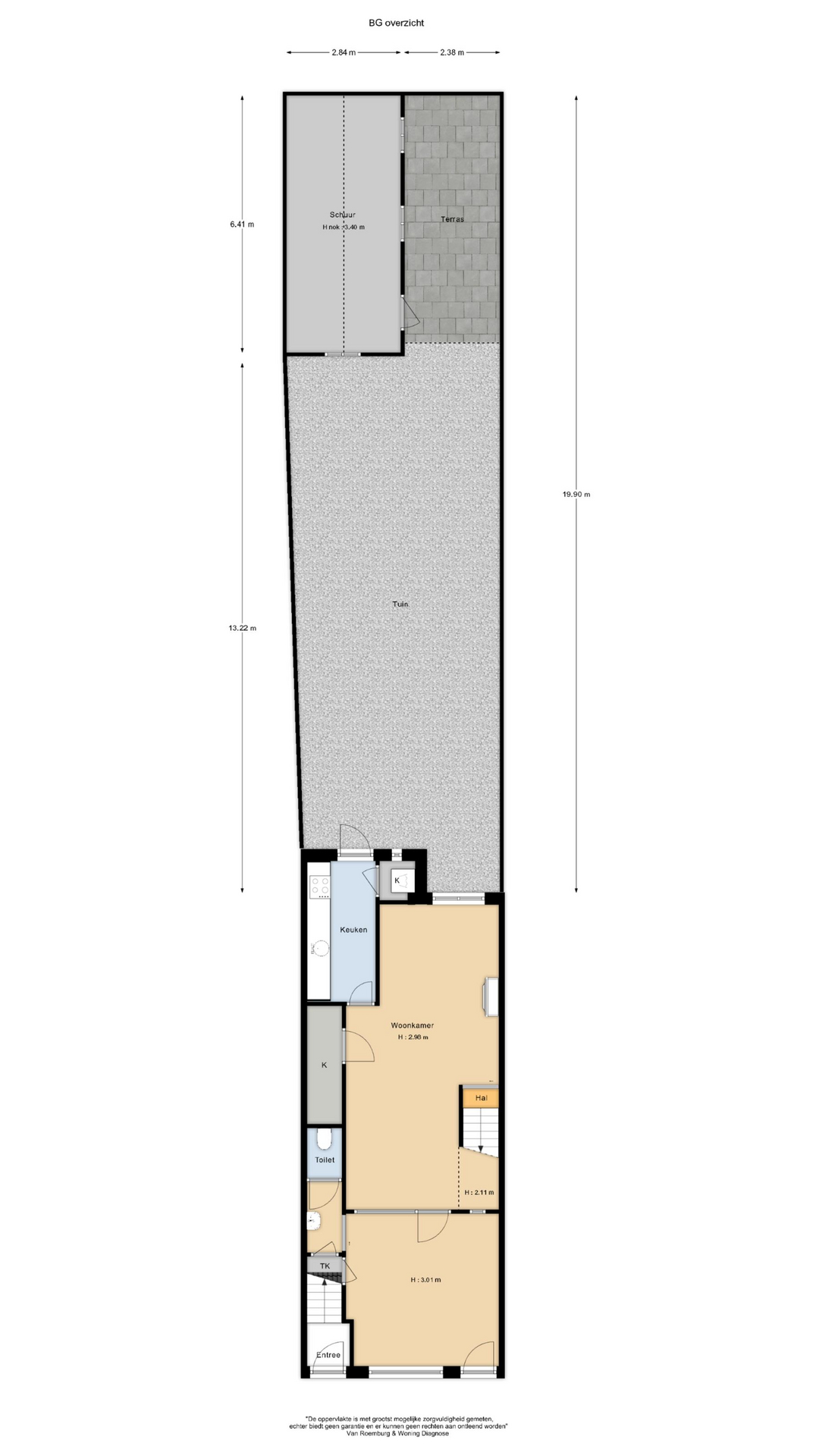Begane grond bestaat uit een eigen entree met toegang tot de melkwinkel, deze wordt momenteel als garderobe/hal gebruikt. Vervolgens loop je door naar de woonkamer met een gedeeltelijke open keuken, toilet, inpandige bergkast en toegang naar de 20 meter diepe tuin. In de tuin bevindt zich een zeer ruime schuur op een betonnen fundering.