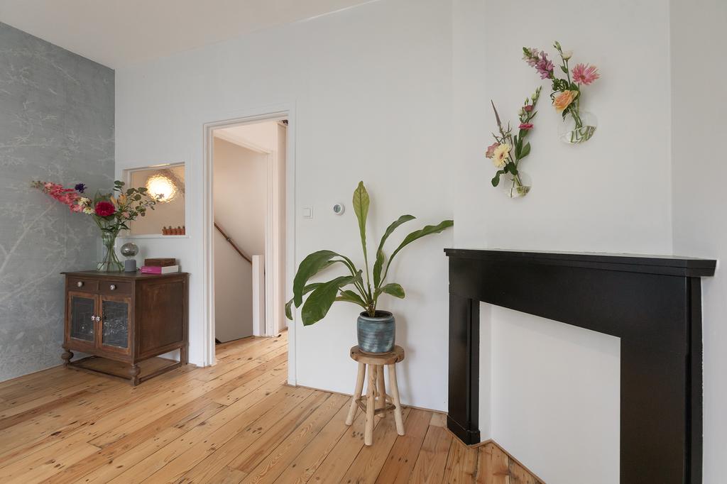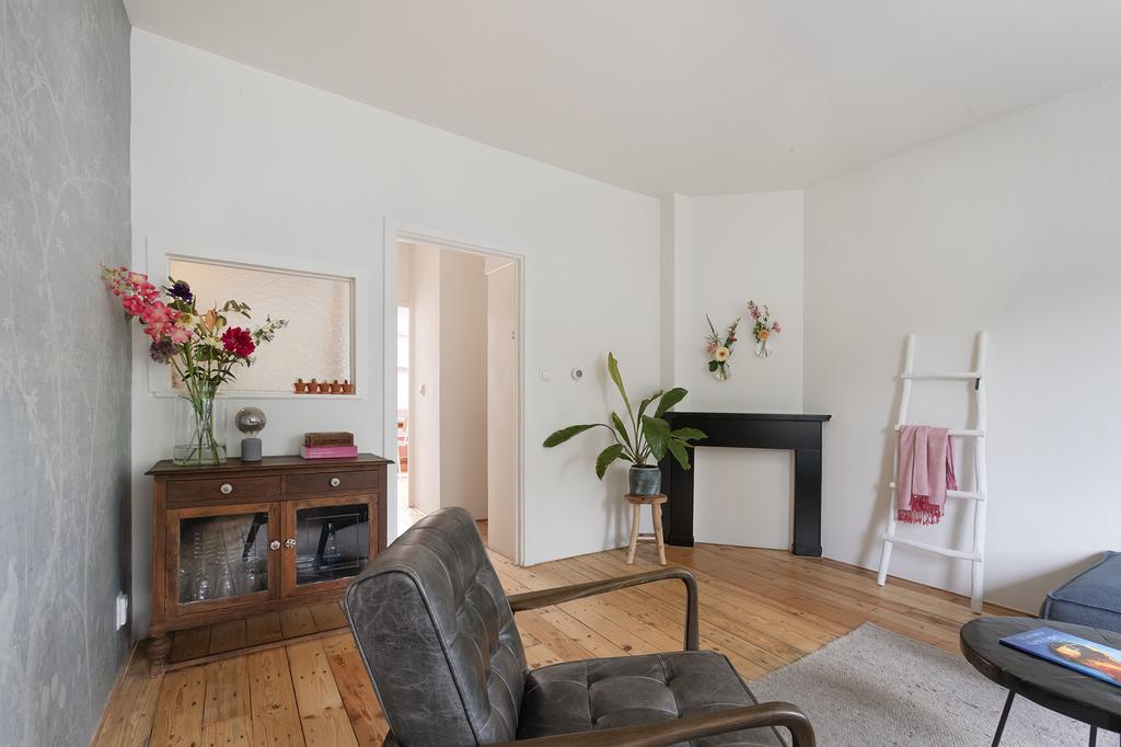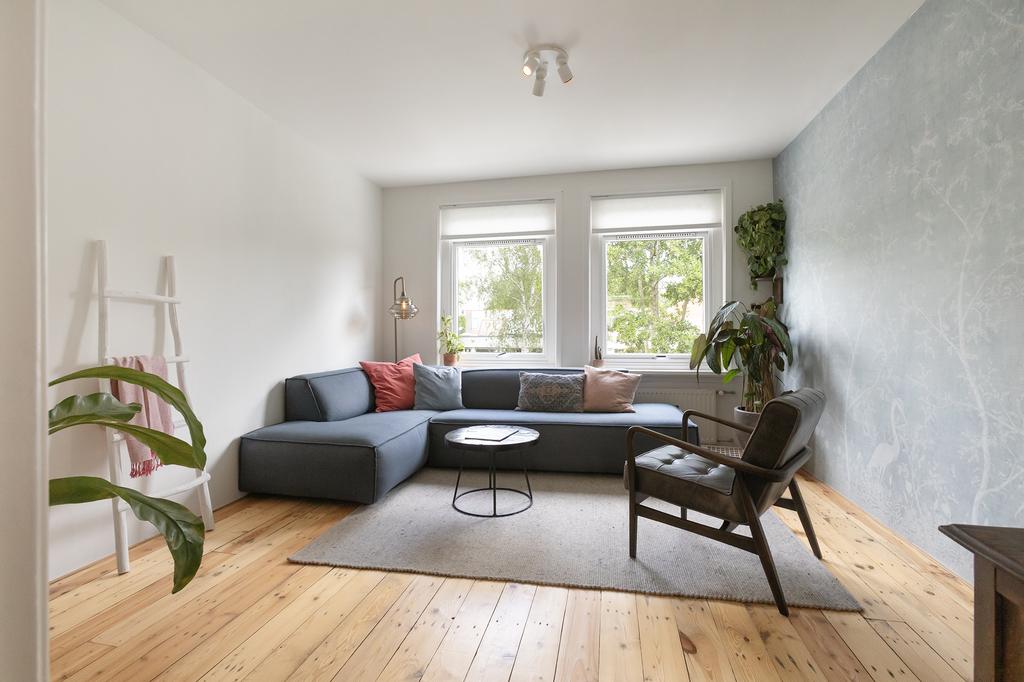 Aan de achterzijde ligt de lichte woonkamer, met grote ramen en een rustige uitstraling. De ruimte biedt volop plek voor een comfortabele zithoek en eventueel een werkplek of leeshoek.