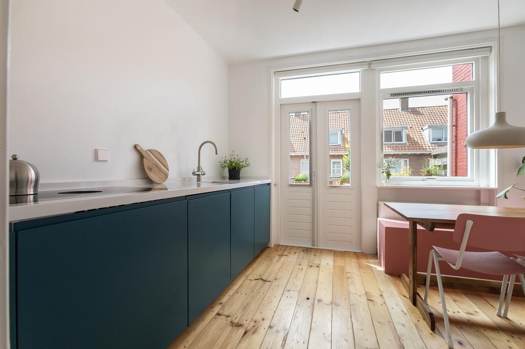 Aan de voorzijde bevindt zich een apart gelegen leefkeuken met voldoende ruimte voor een grote eettafel. De eethoek staat in directe verbinding met de keuken, waardoor dit een heerlijke plek is om uitgebreid te koken én samen te komen. Via openslaande deuren heb je direct toegang tot het royale en zonnige terras.