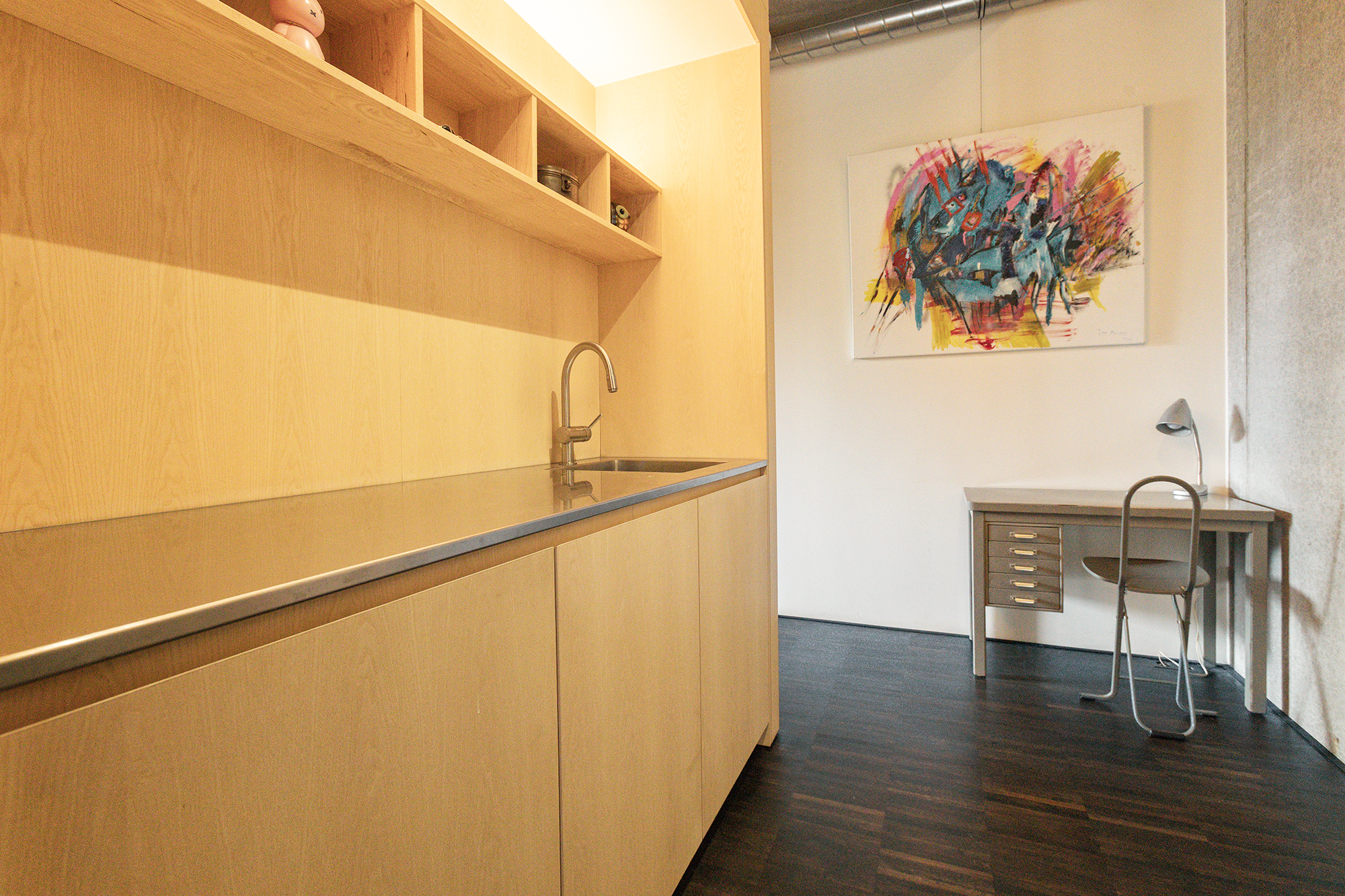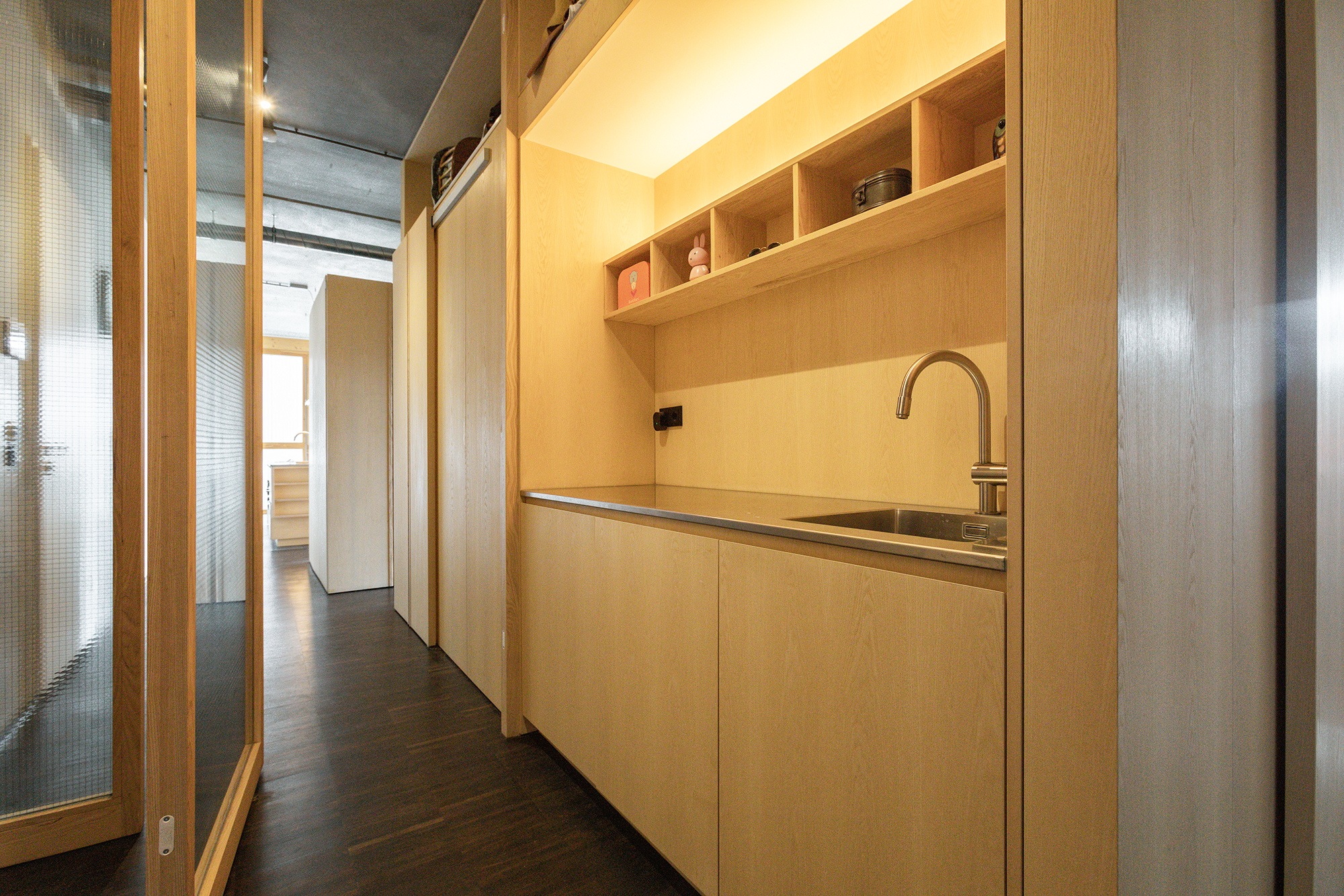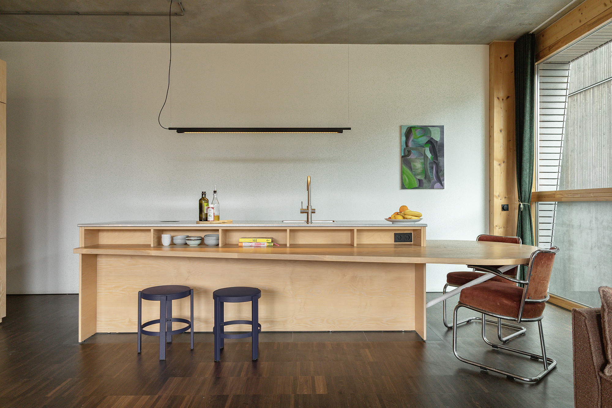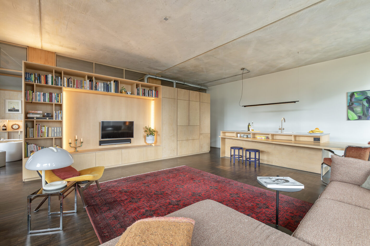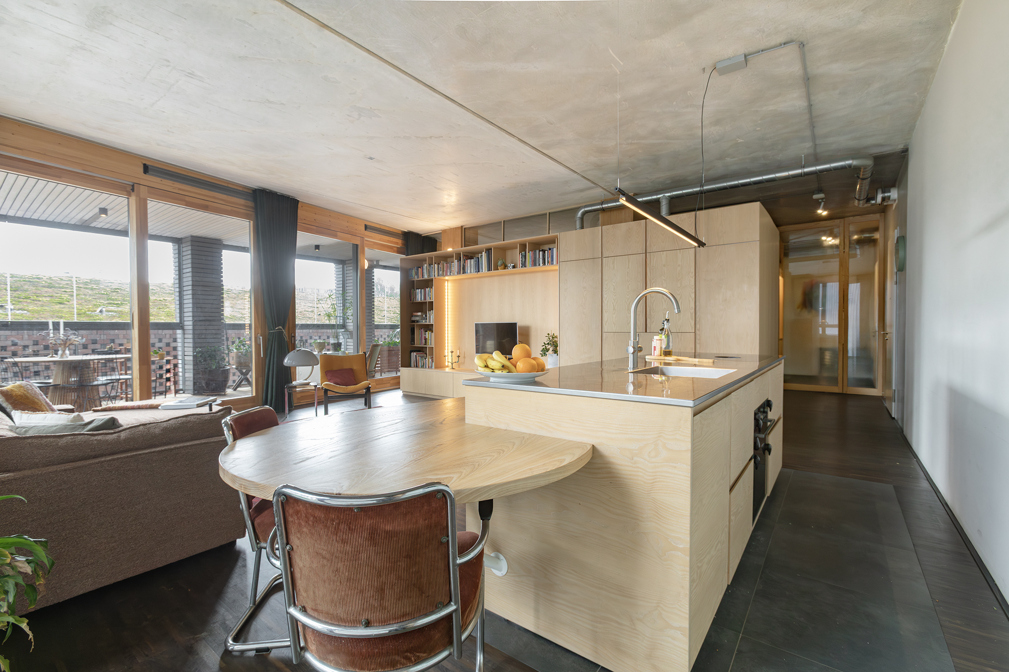 The interior is understated yet rich: ash wood cabinets and a smoked oak floor bring warmth, while the concrete ceiling adds a bold contrast. The open character offers a sense of freedom without sacrificing coziness.