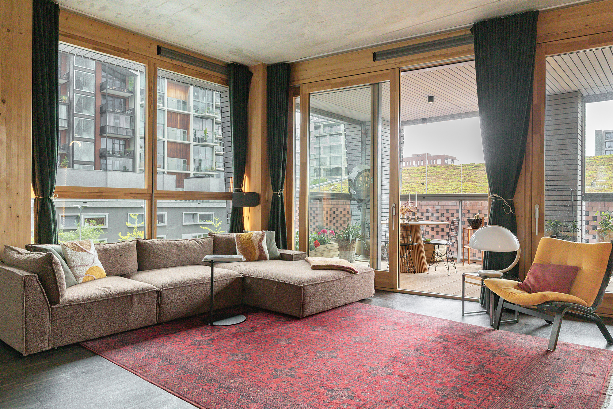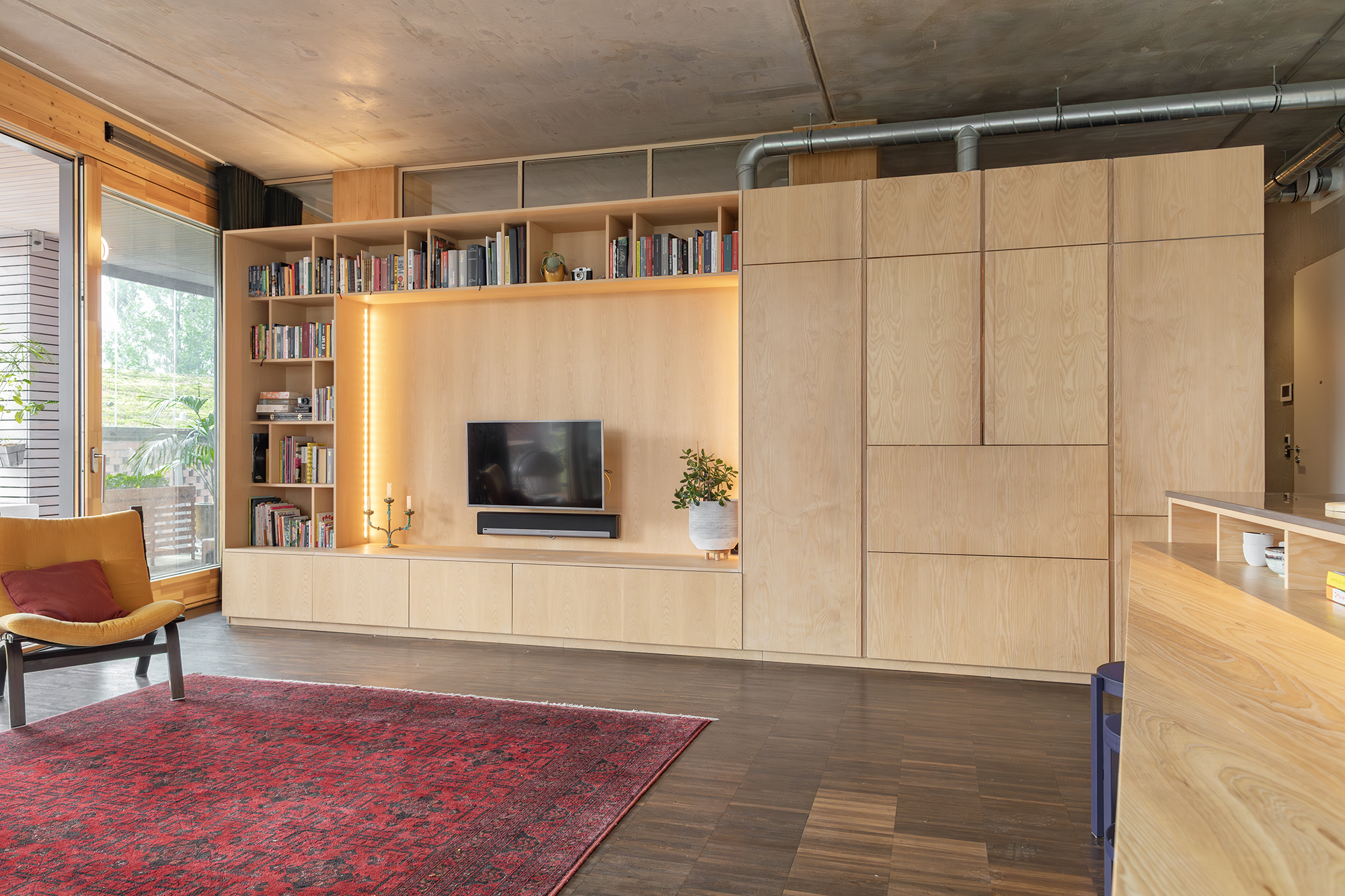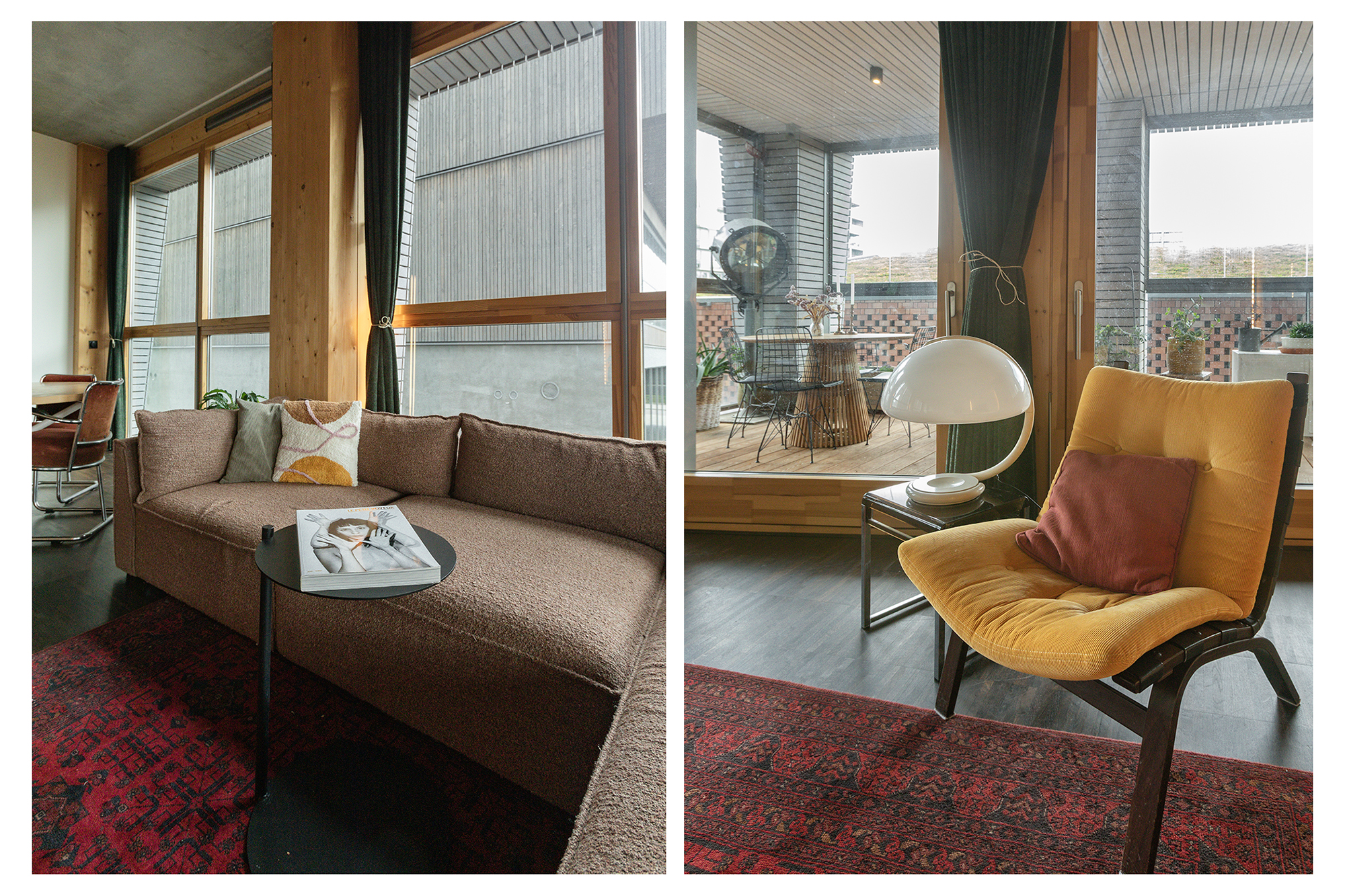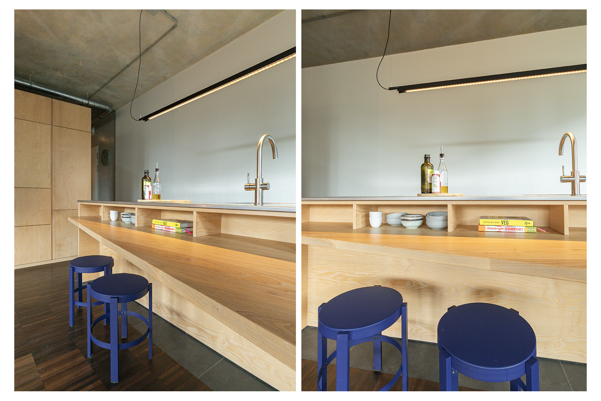 The interior is understated yet rich: ash wood cabinets and a smoked oak floor bring warmth, while the concrete ceiling adds a bold contrast. The open character offers a sense of freedom without sacrificing coziness.