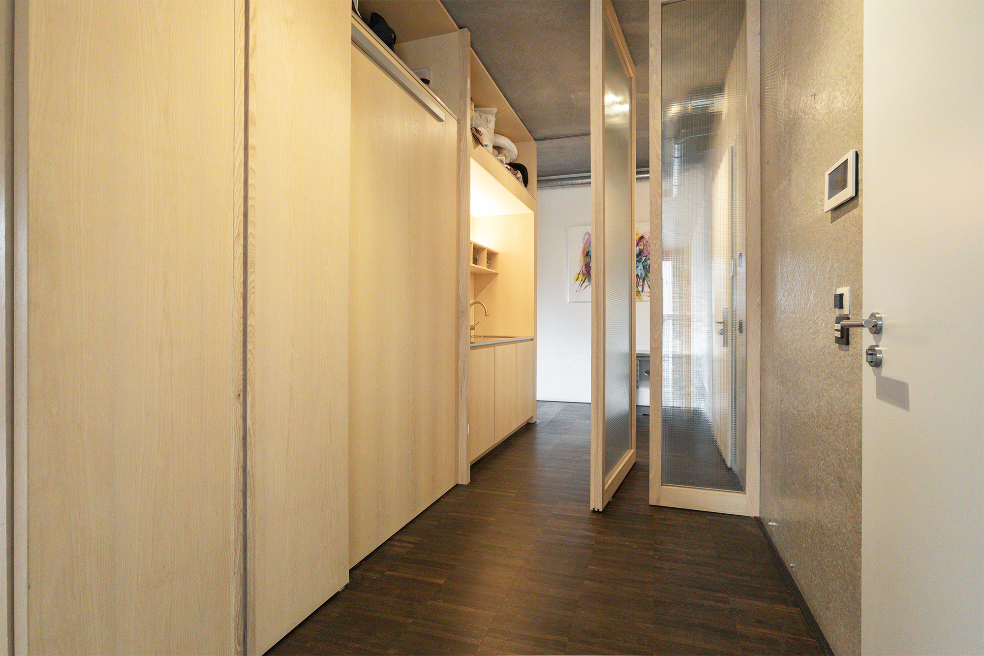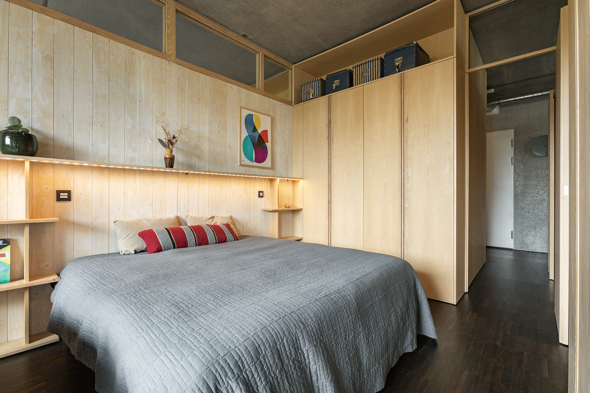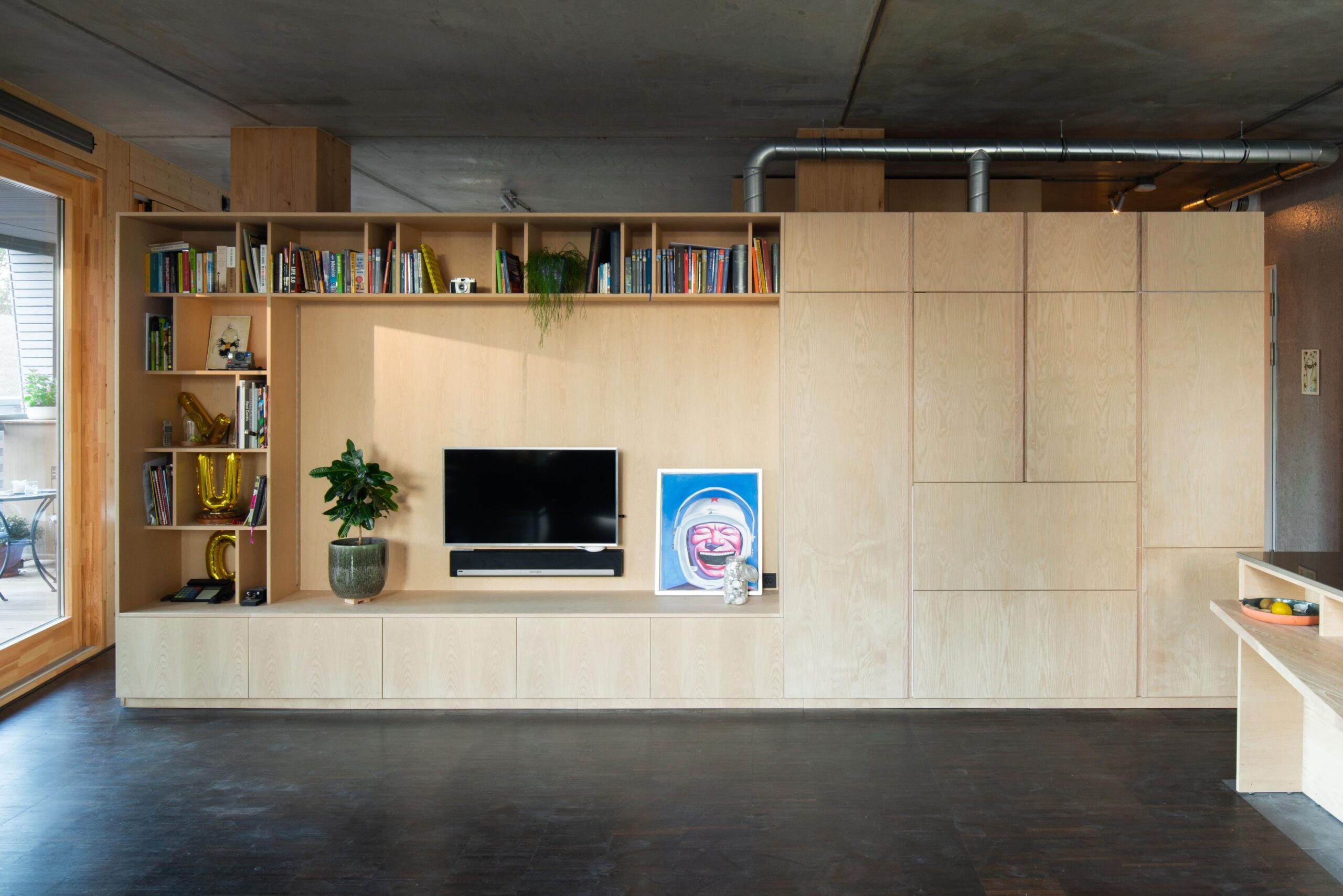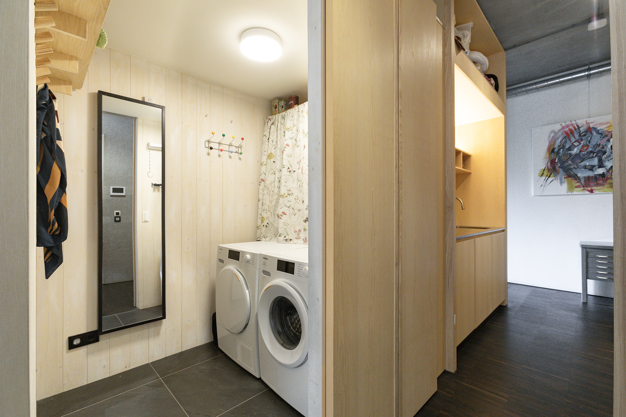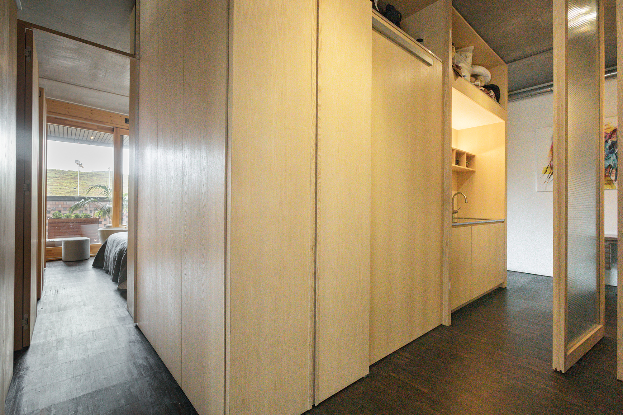 The interior is understated yet rich: ash wood cabinets and a smoked oak floor bring warmth, while the concrete ceiling adds a bold contrast. The open character offers a sense of freedom without sacrificing coziness.