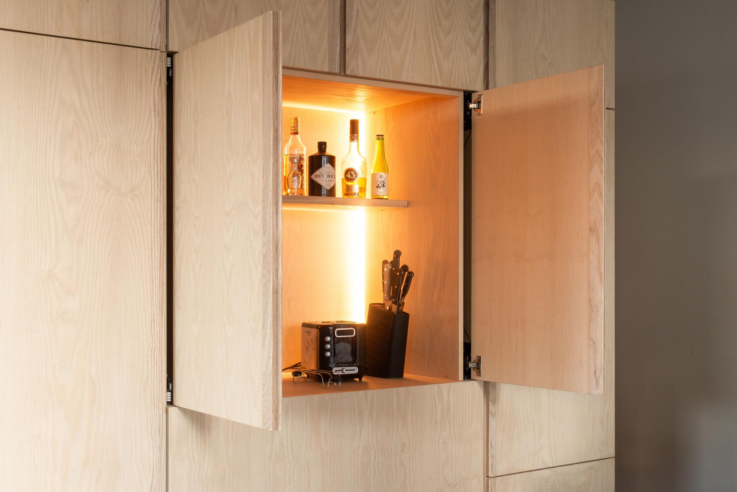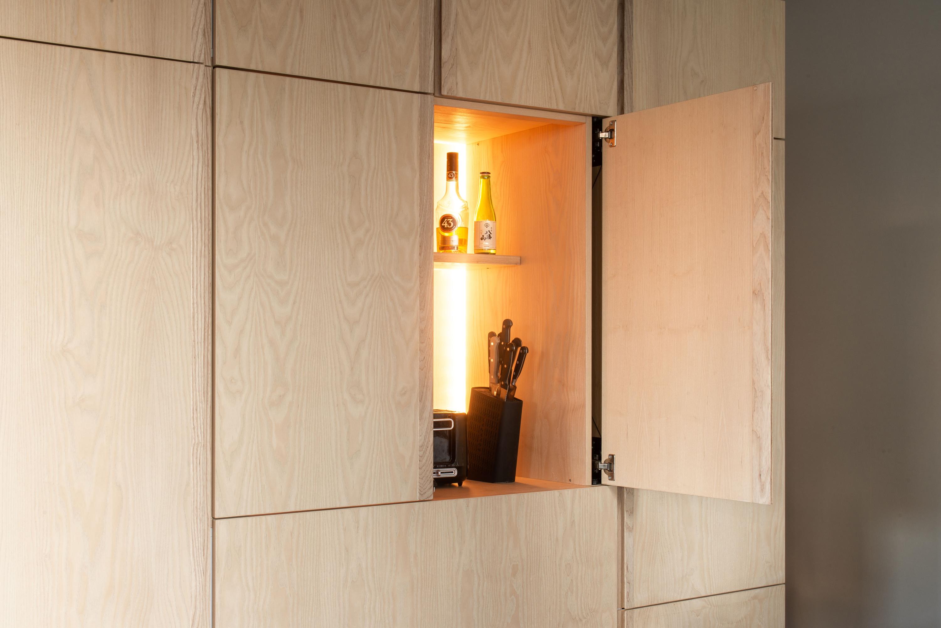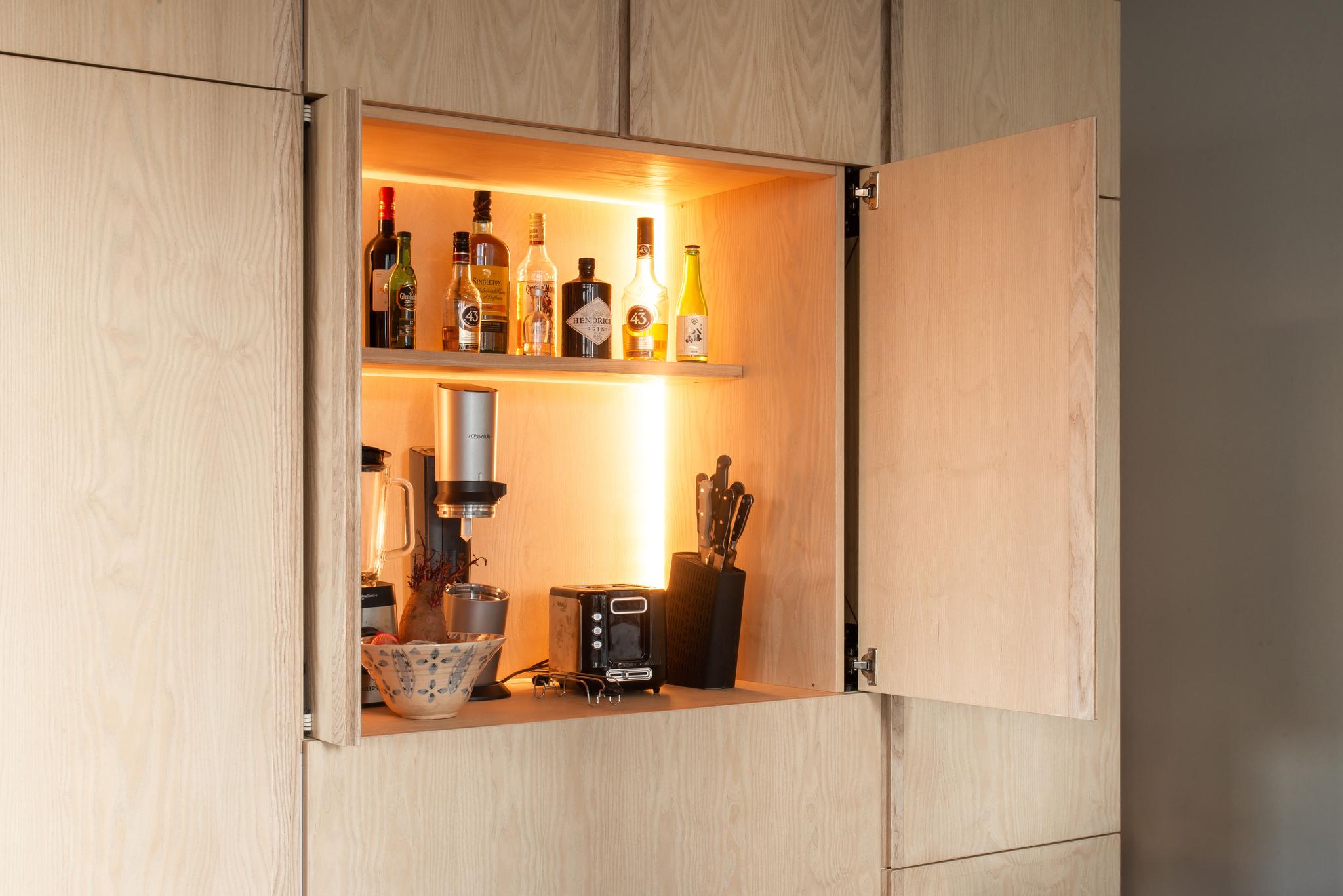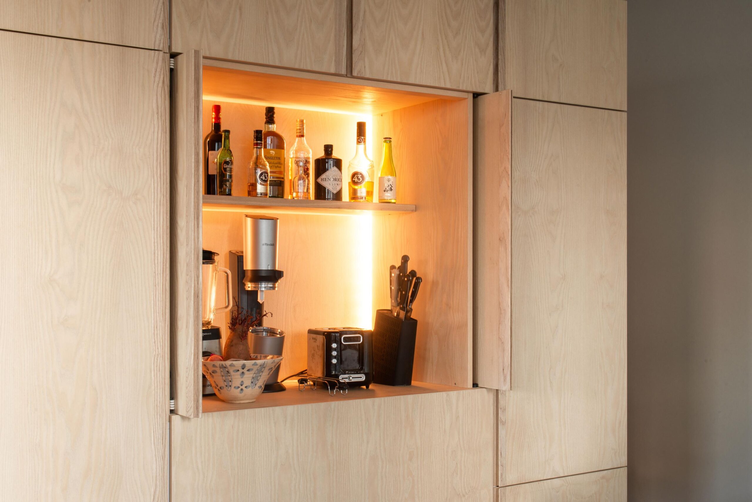De luxe en op maat gemaakte keuken is naadloos geïntegreerd en voorzien van alle moderne gemakken: een inductiekookplaat, kokendwaterkraan, oven en inbouwkoelkast met vriesvak. De houten open planken en de subtiele verlichting maken het een rustige maar stijlvolle werkplek – ideaal voor wie van koken houdt zonder in te leveren op uitstraling.