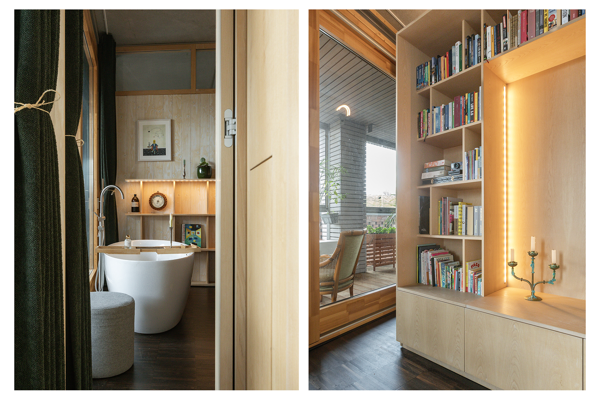 The luxury, custom-built kitchen is seamlessly integrated and equipped with all modern conveniences: an induction cooktop, boiling-water tap, oven, and built-in fridge with freezer compartment. Open wooden shelves and subtle lighting create a calm yet stylish workspace – perfect for those who love cooking without compromising on aesthetics.