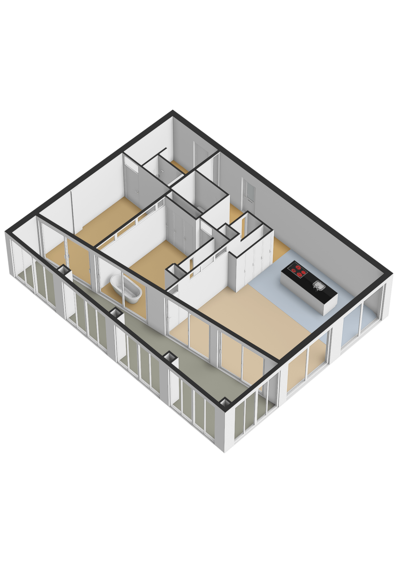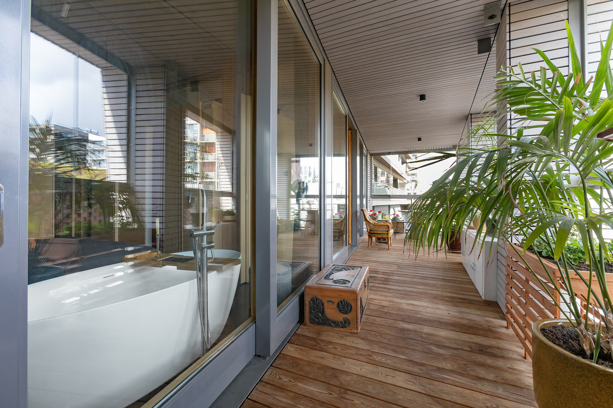Aan de noordwestzijde van de woning bevindt zich een royale loggia van maar liefst 31 m² – een buitenruimte die voelt als een extra woonkamer. Dankzij de grote glazen schuifpui kun je deze ruimte op zomerse dagen volledig openen, waardoor binnen en buiten naadloos in elkaar overlopen.