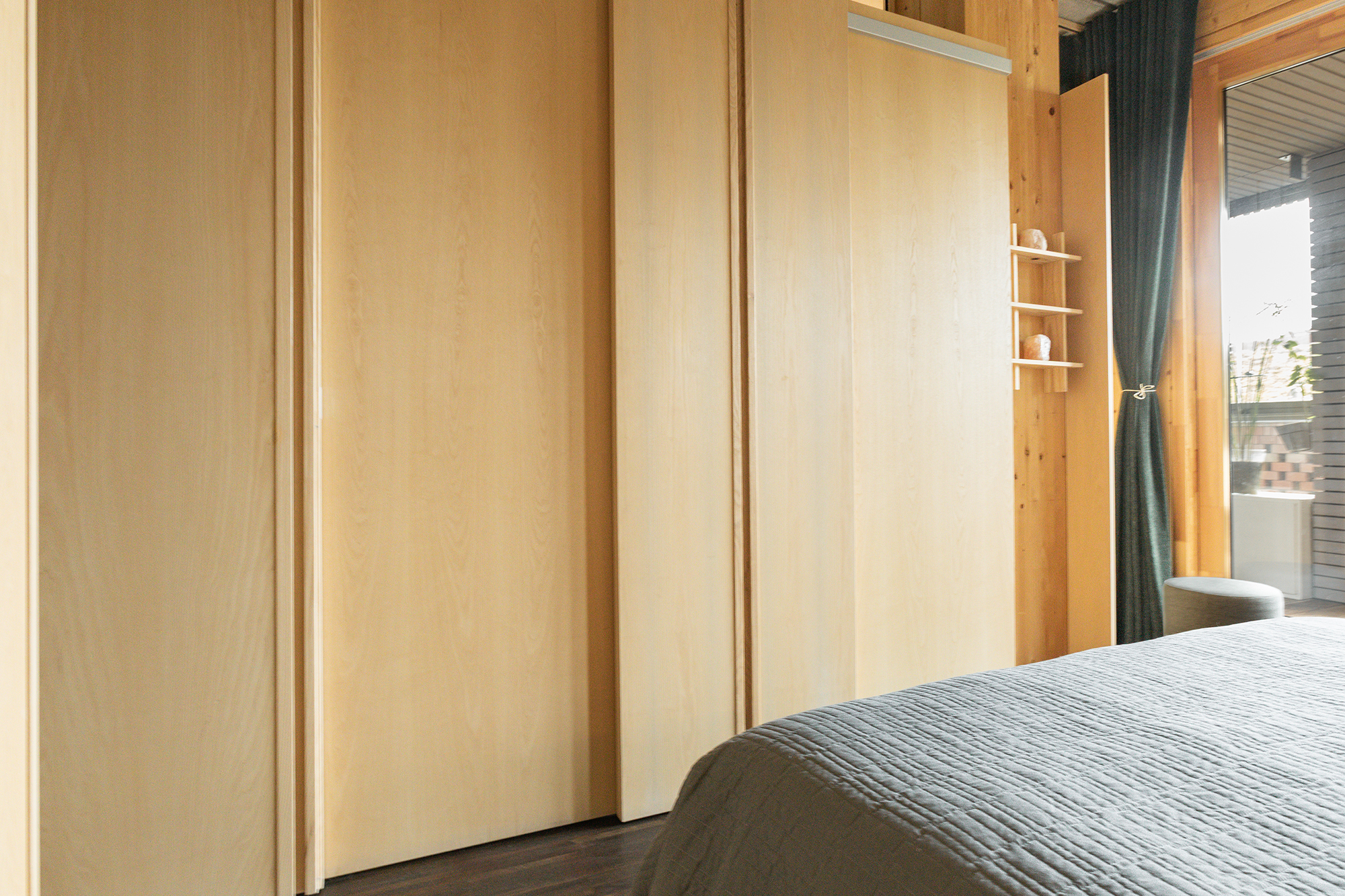 Het interieur is ingetogen maar rijk: essenhouten kasten en een gerookt eikenhouten vloer geven warmte, terwijl het betonnen plafond een stoer contrast biedt. Het open karakter zorgt voor vrijheid, zonder aan geborgenheid in te boeten.