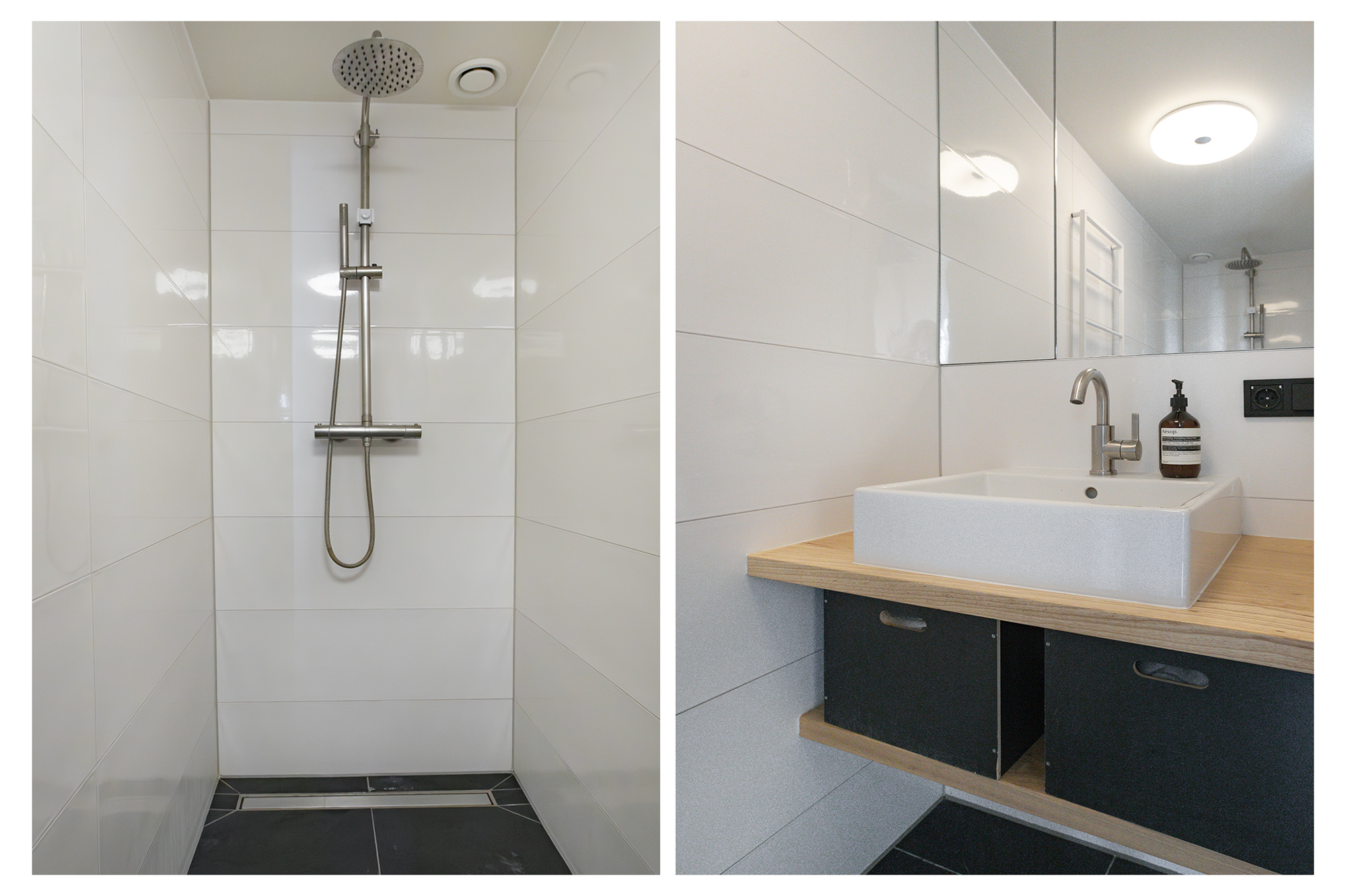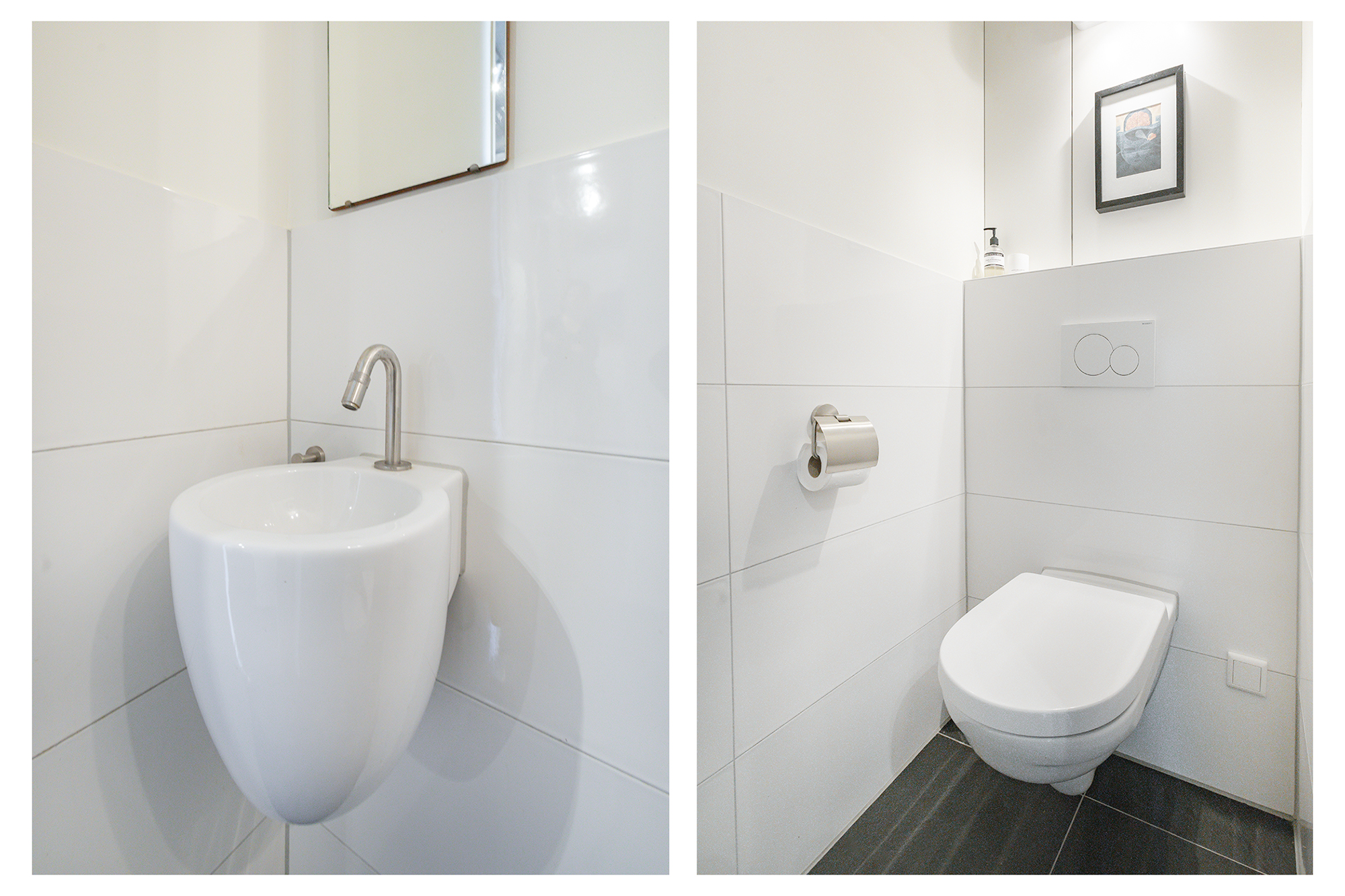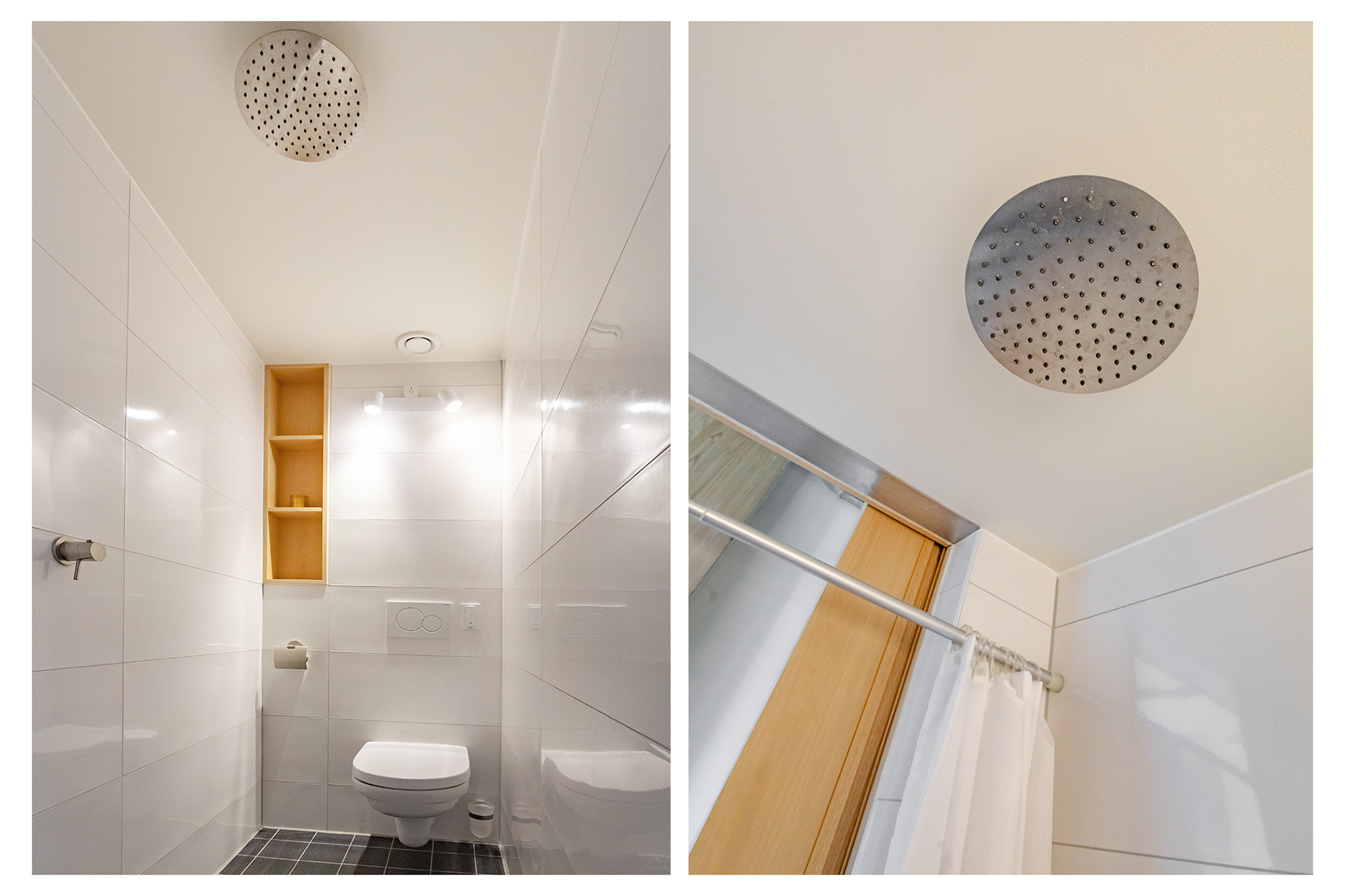 De slaapkamers zijn ingericht als intieme, rustige ruimtes aan de achterzijde van de woning, met zachte overgangen naar de woon, bad- en werkgedeelten. Beide slaapkamers beschikken over directe toegang tot een eigen badkamer, wat zorgt voor extra comfort en privacy. De badkamers zijn strak vormgegeven, met een inloopdouche, een stijlvol wastafelmeubel en natuurlijke materialen. De toiletten zijn separaat en, net als de rest van het interieur, afgewerkt in de serene stijl van de woning.