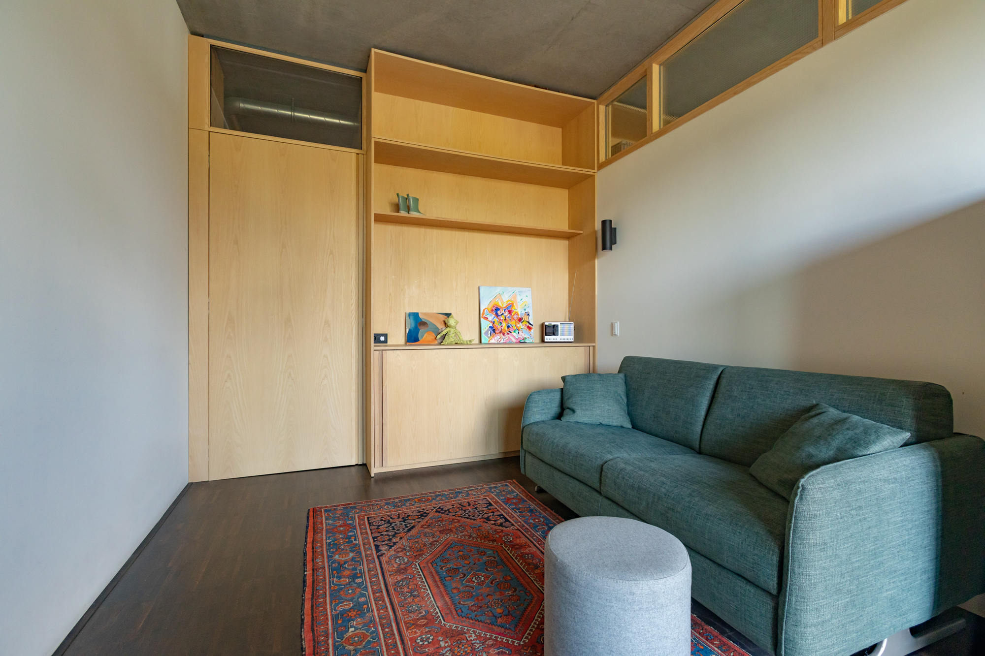 Bij binnenkomst ervaar je direct de rust, het licht en de hoogte van deze unieke woning. De woning is ontworpen als een hybride loft met een open indeling, waarin drie vrijstaande boxen (meubelelementen) de functies van keuken, badkamer, opslag en sanitair huisvesten. Hierdoor ontstaan vloeiende ruimtes tussen de boxen, die flexibel zijn in gebruik – van slaapruimte tot thuiswerkplek tot leefruimte.
