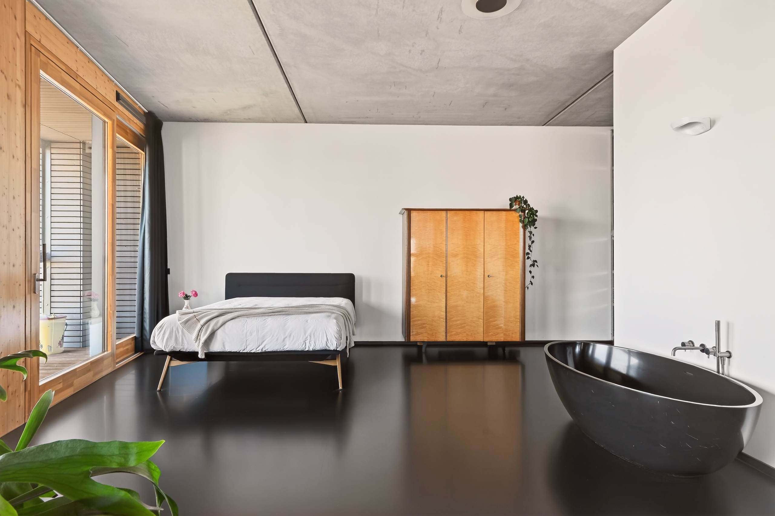 The bed and freestanding bathtub are positioned centrally in the space, giving the loft its distinctive and expressive character.