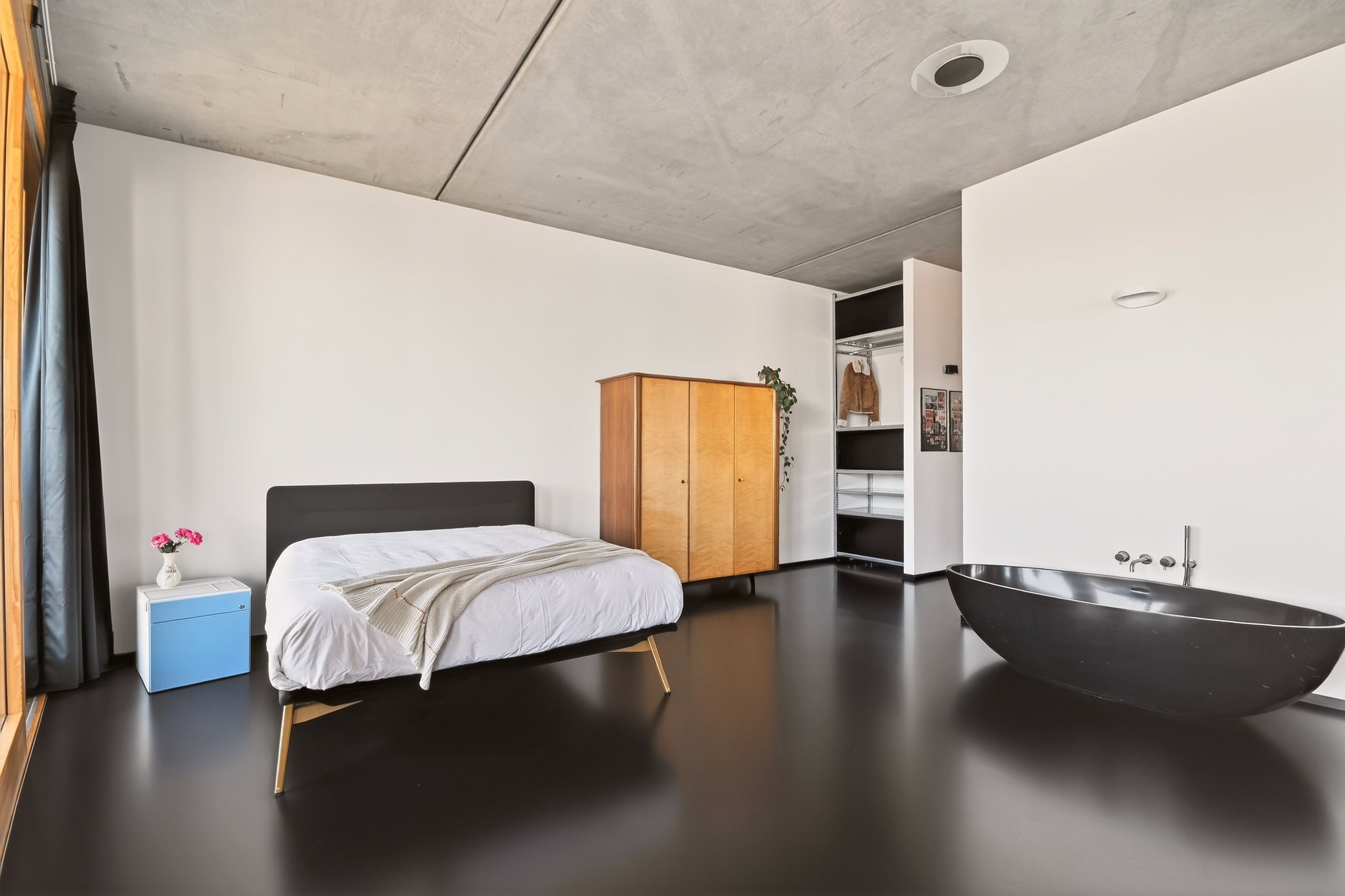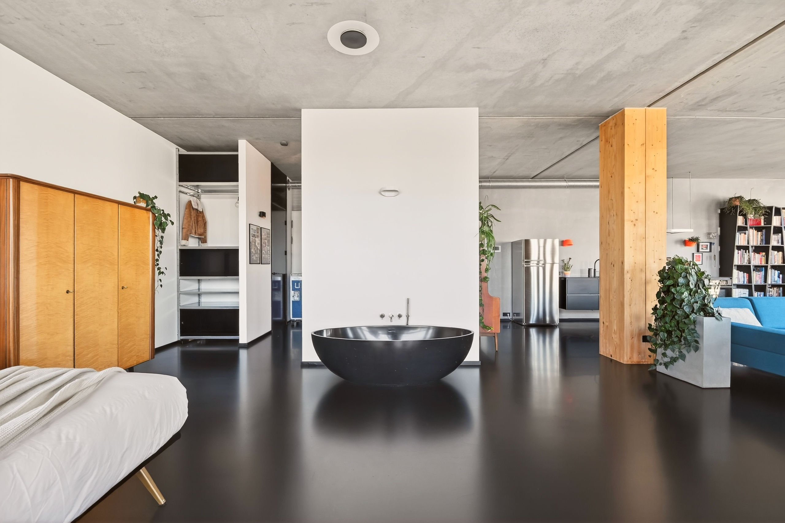 Het bed en het vrijstaande bad staan centraal in de ruimte en geven de loft zijn uitgesproken karakter. De aparte badkamer beschikt over een ruime inloopdouche en er is een separaat toilet.