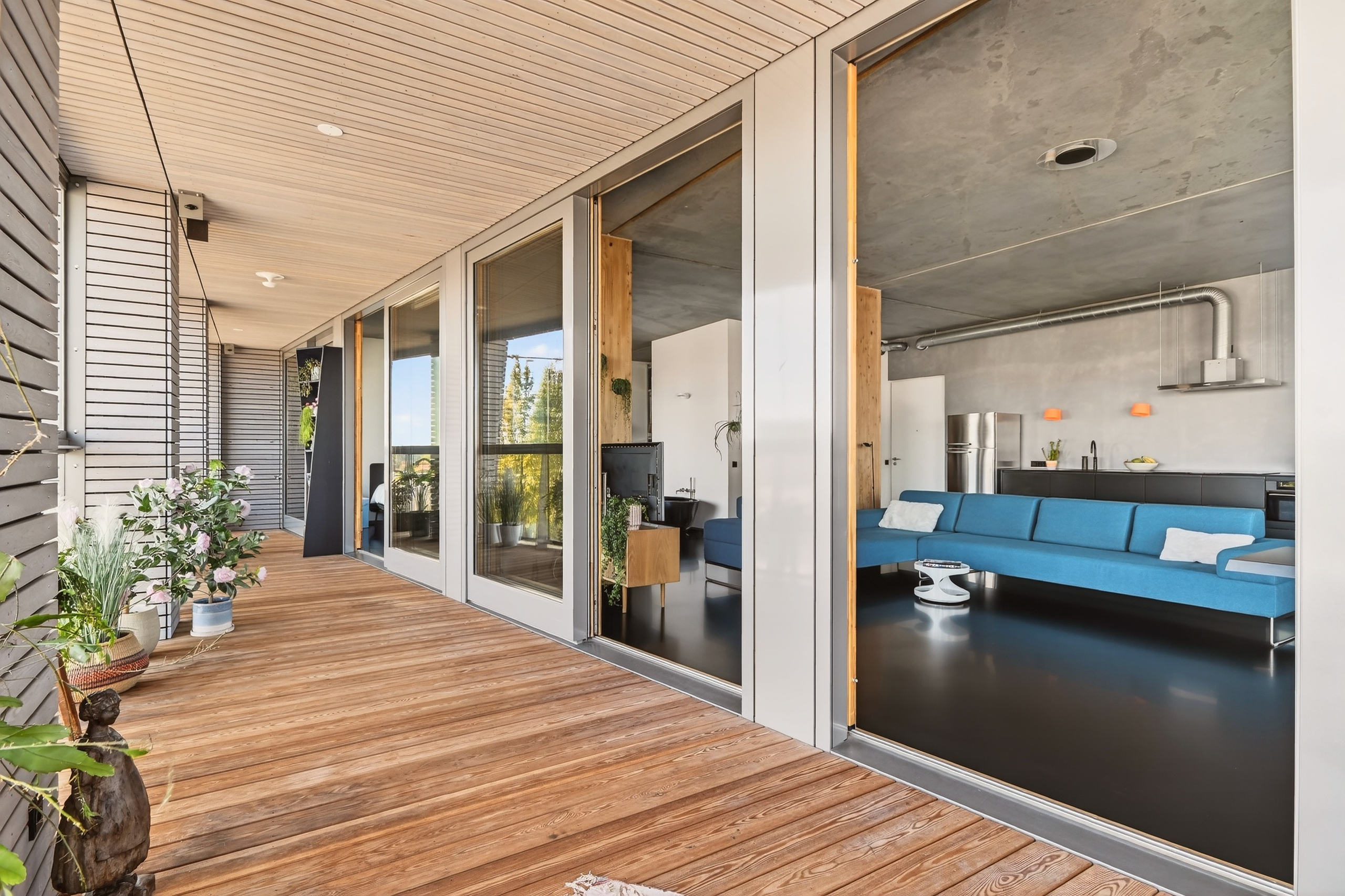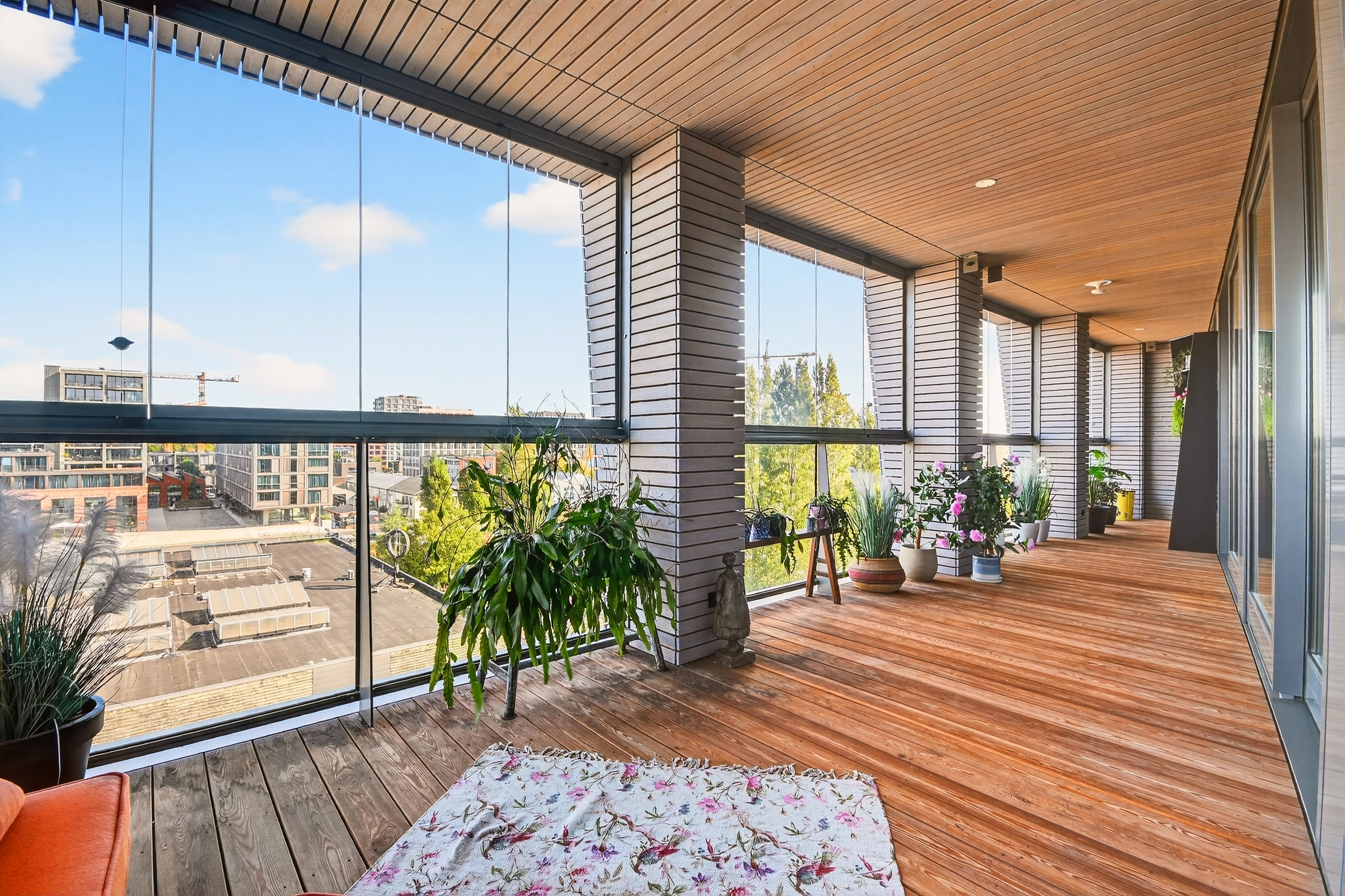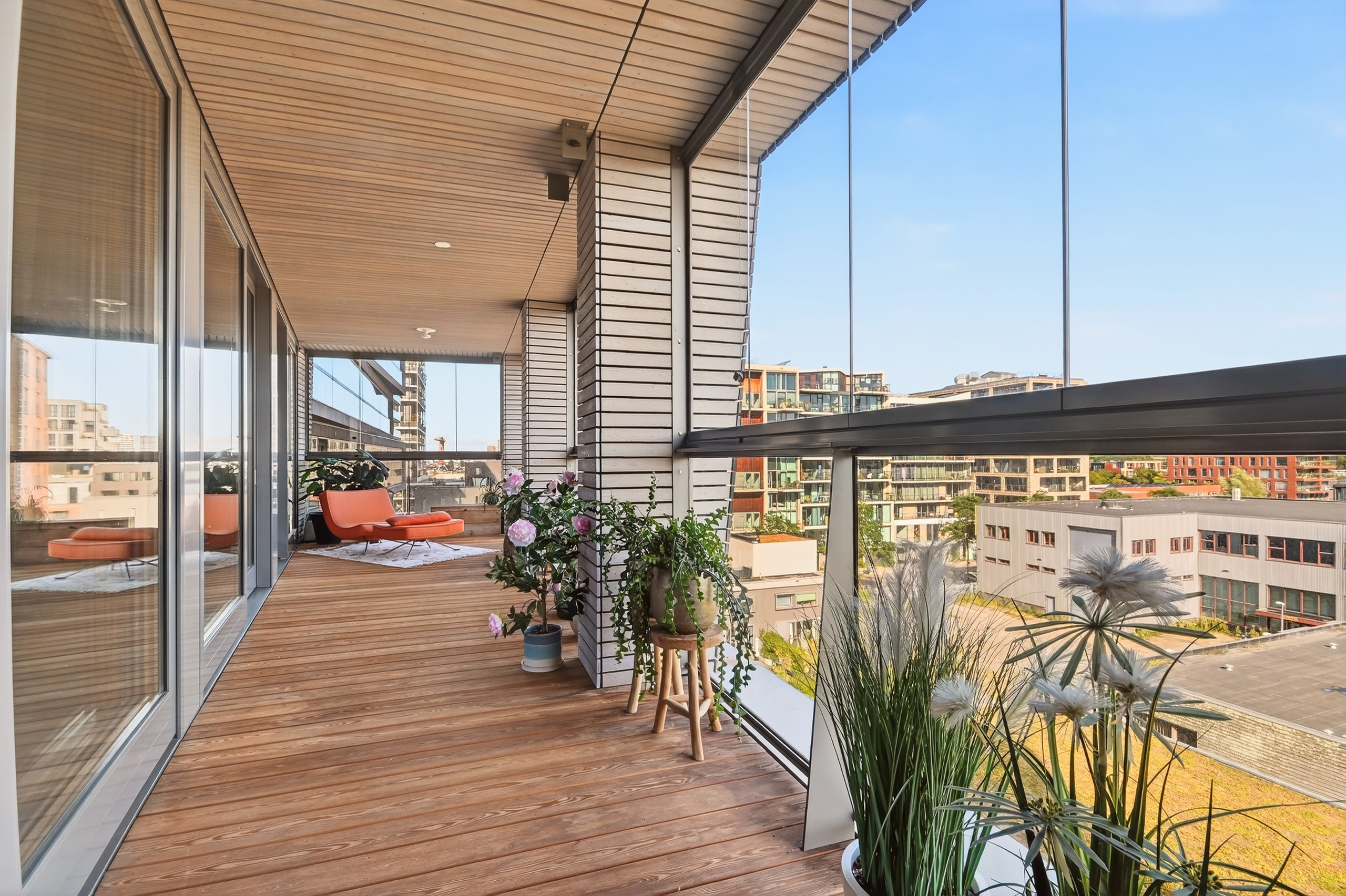De loggia van circa 32 m² is een absolute eyecatcher. Dankzij de glazen schuifwanden gebruik je deze ruimte precies zoals jij wilt. Open in de zon, beschut als het frisser is. Deze ruimte voelt dit als een volwaardige extra kamer. Van het vroege voorjaar tot laat in de herfst.