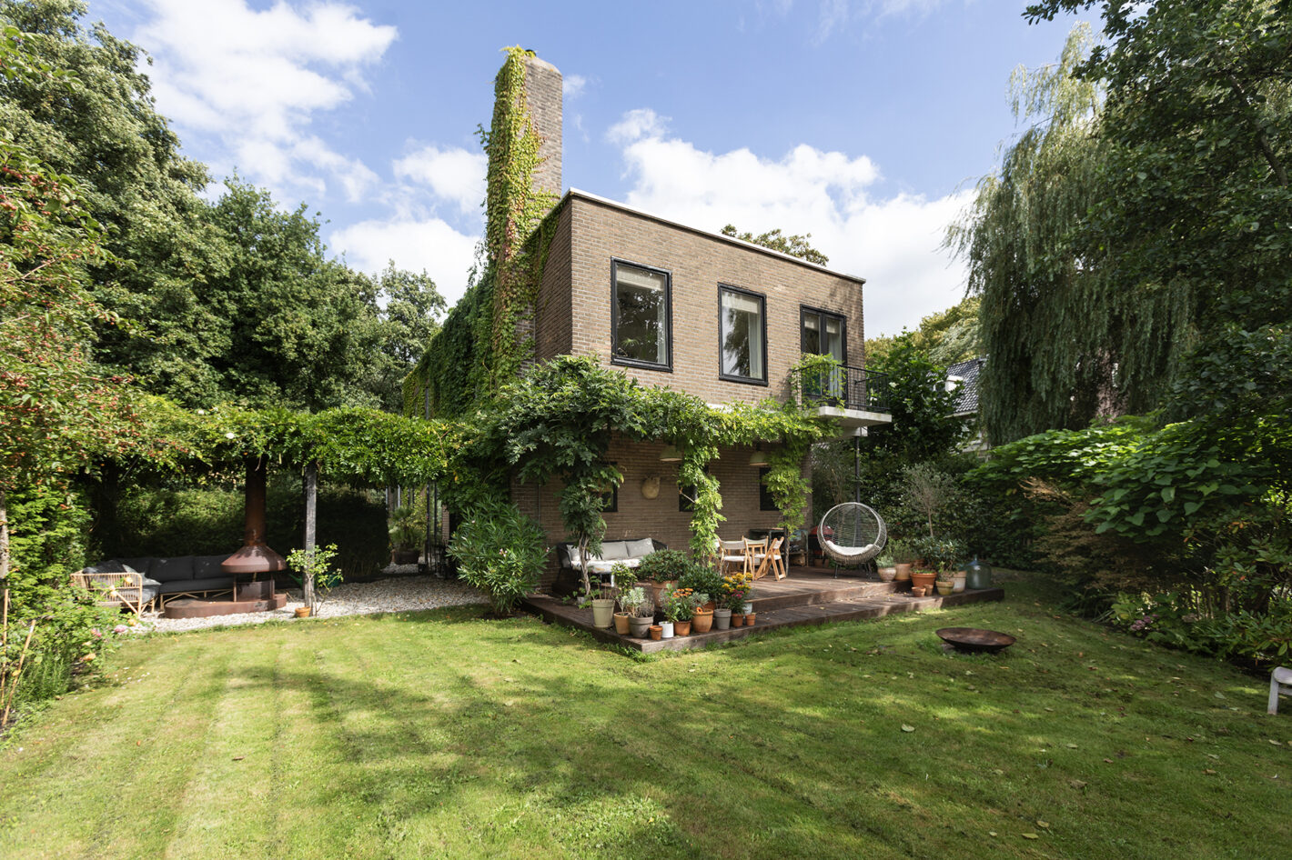 De tuin ligt op het westen en is ruim opgezet. Er zijn meerdere terrassen, een overkapping van oude scheepsvloerdelen, een vuurplaats, elektra en een buitenkraan. Je kunt er zitten, spelen, tuinieren of juist ontspannen. Naast de tuin zijn er ook meerdere balkons en een dakterras — altijd een plek in de zon of juist in de schaduw, afhankelijk van het moment van de dag.