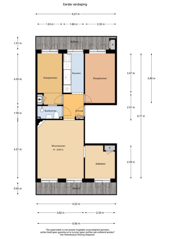 Het woonoppervlakte bedraagt 51 m2. De beide balkons bedragen samen 6m2. De woning is door een extern bureau ingemeten conform NEN2580. Het meetrapport is beschikbaar.