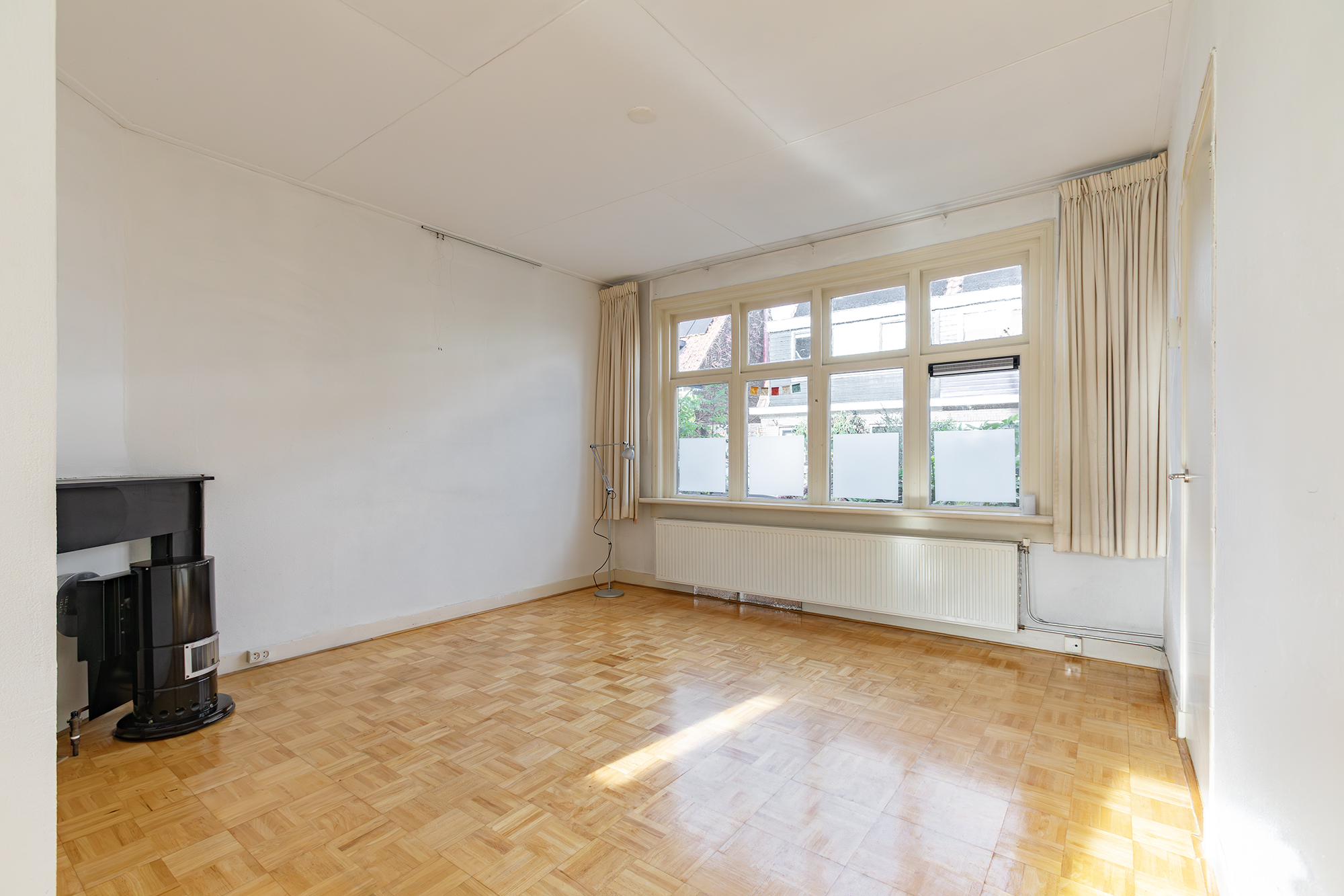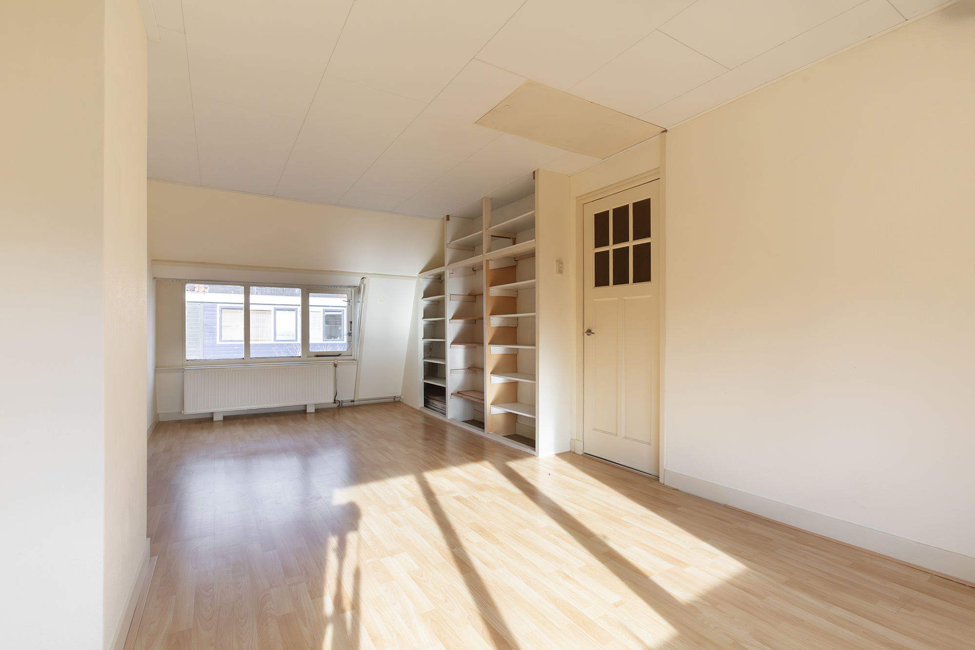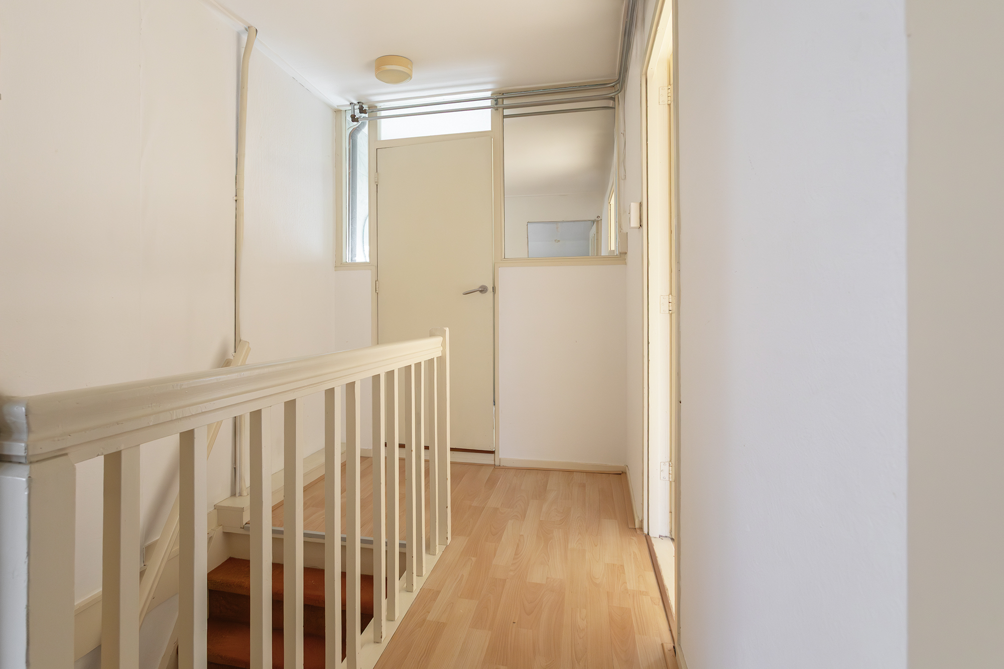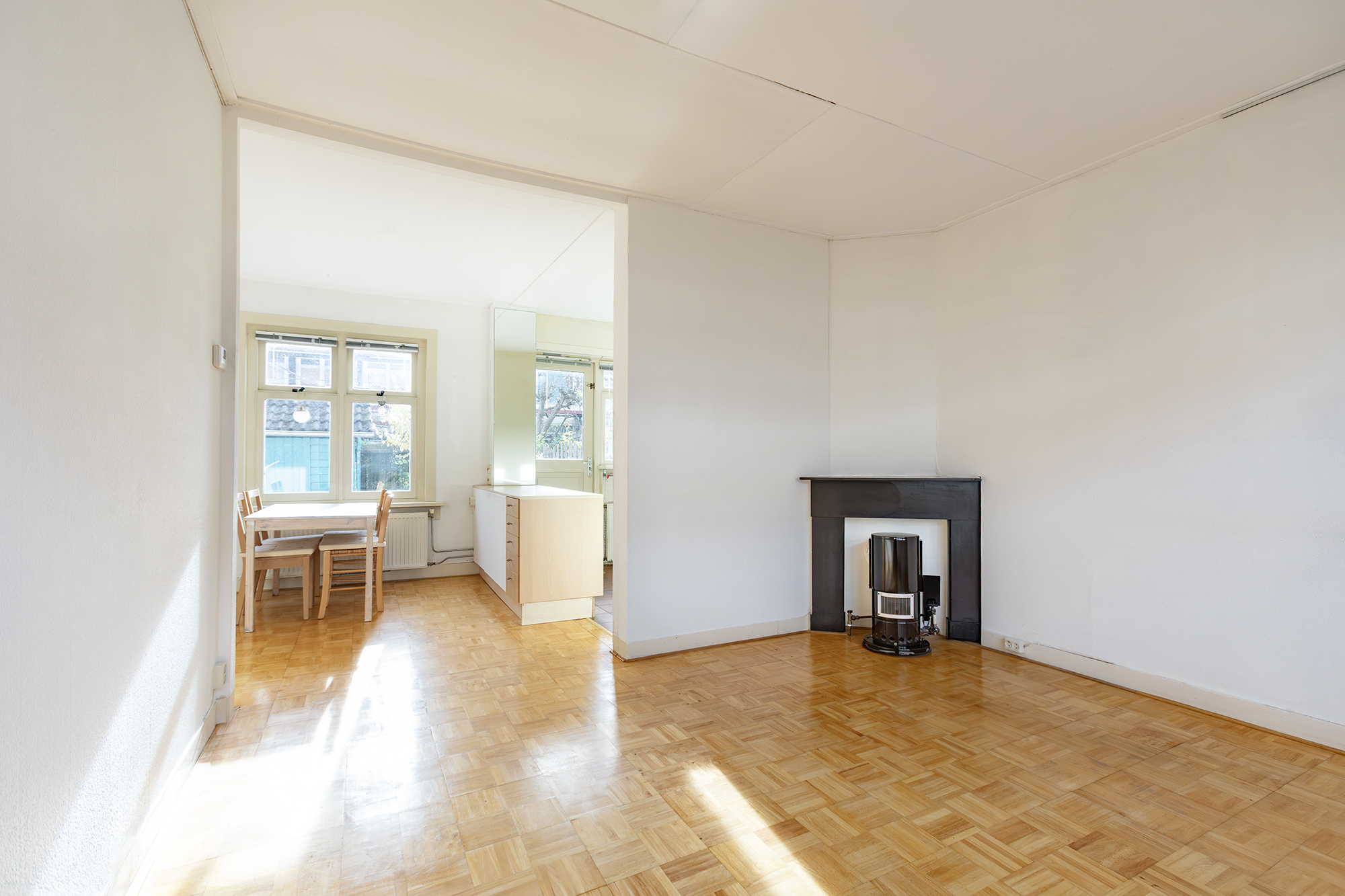 You enter through the side entrance into a hall with a stair closet and separate toilet. At the front of the house is the cosy living room — a comfortable place to relax, overlooking the quiet street. At the garden side you find the dining kitchen, with a dining table and a bar setup. This space forms the heart of the home and offers plenty of possibilities to redesign the kitchen as you like. The property was internally renovated before 2000 and is currently vacant. The fixed staircase to the attic gives you extra potential: from a workspace to a hobby room or even an additional bedroom.