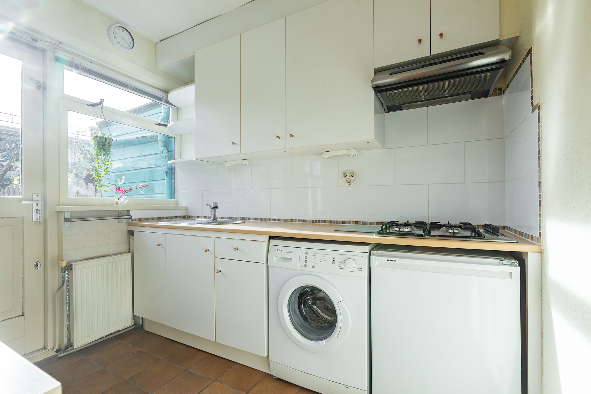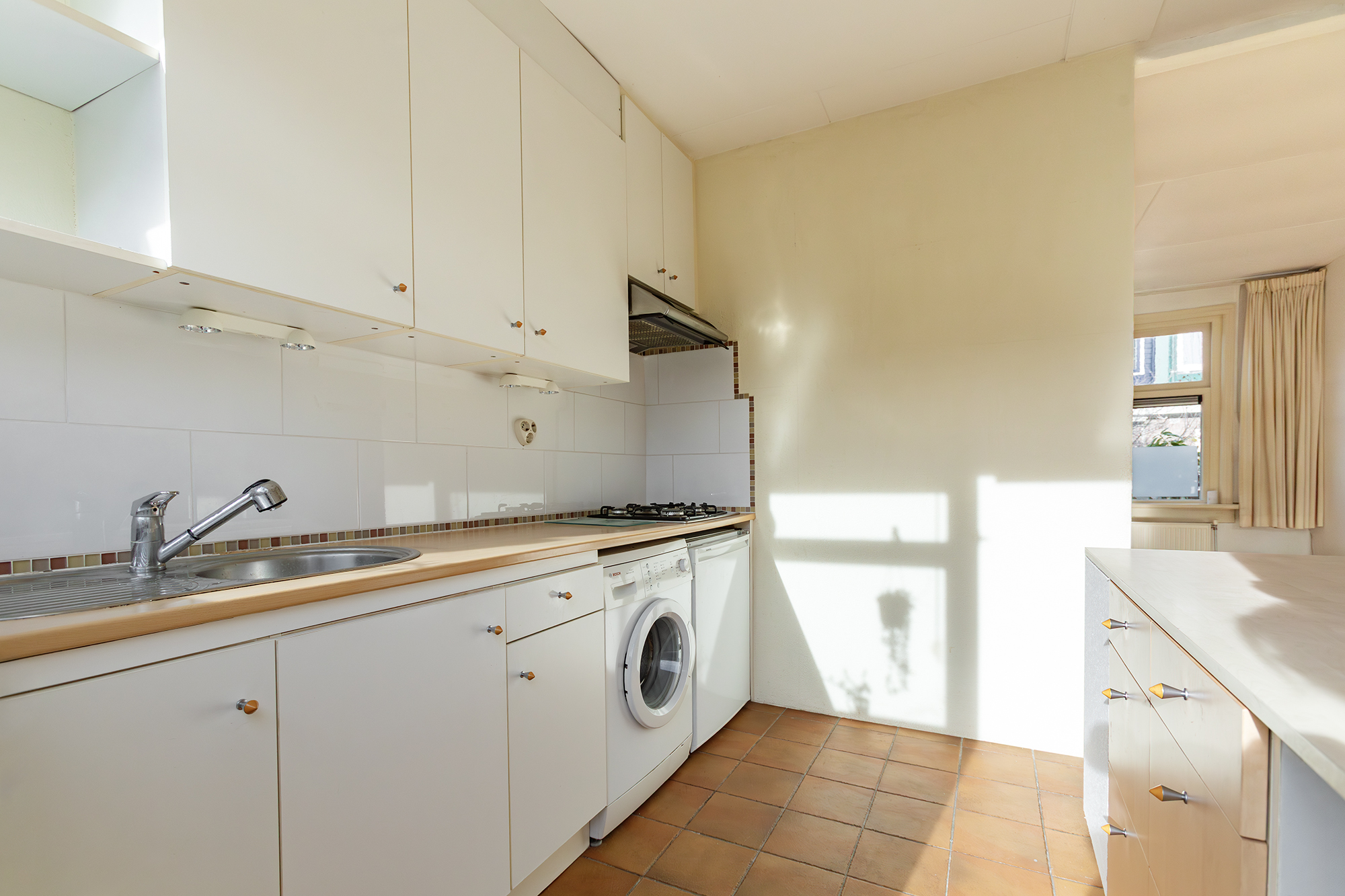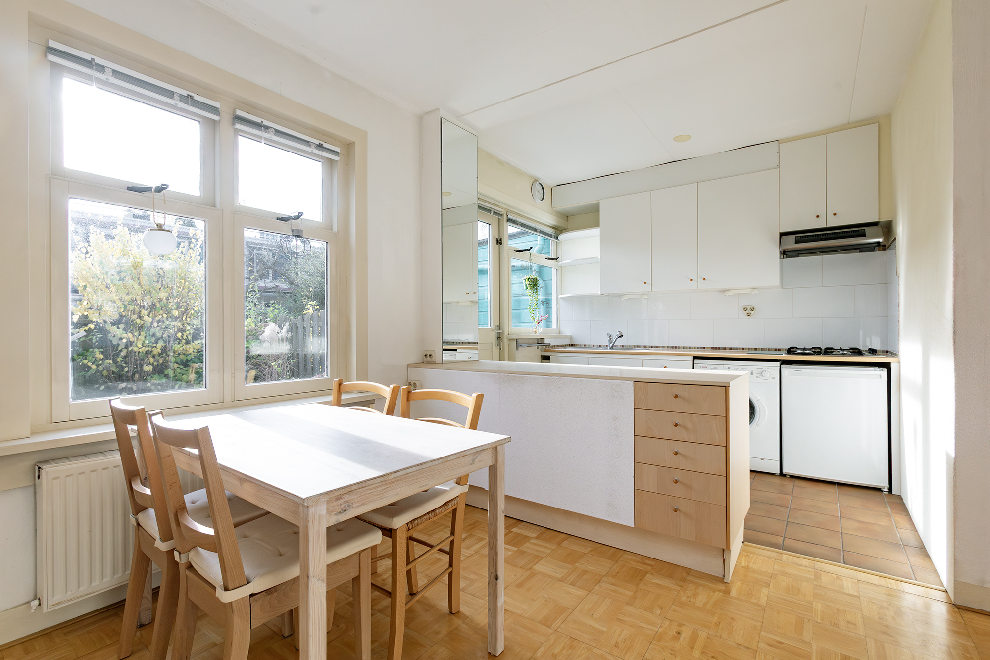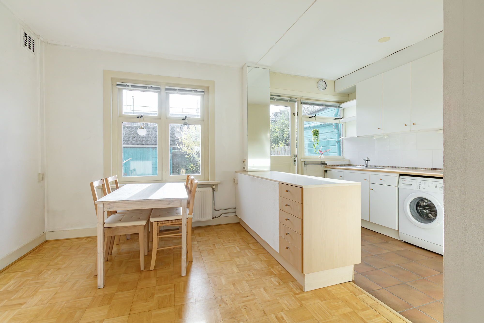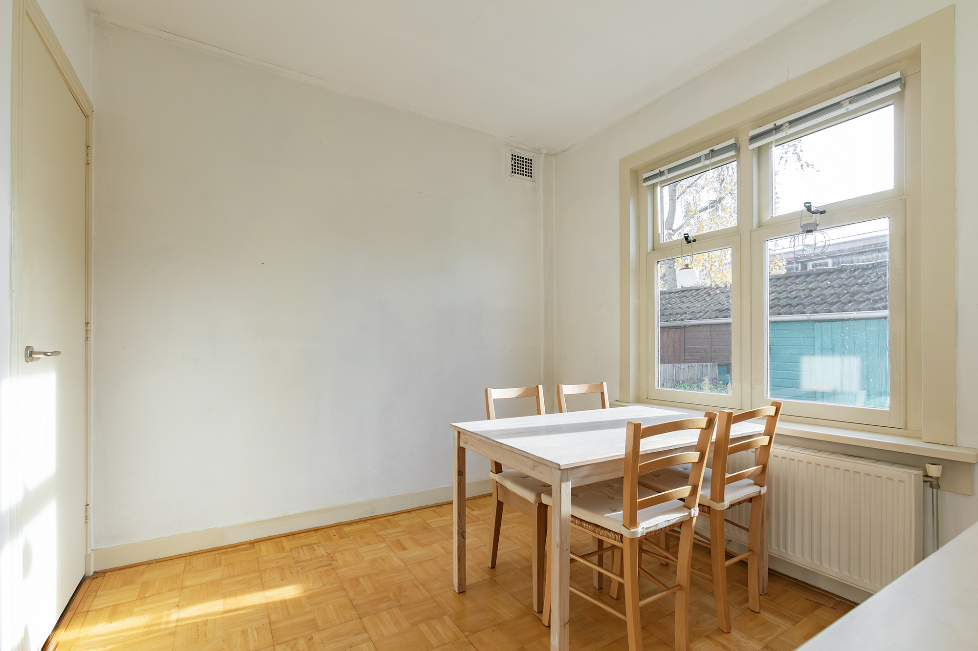 De eetkeuken aan de tuinzijde is ruim en licht, met zicht op het groen. Er is voldoende plek voor een eettafel en een baropstelling of keukeneiland. De keuken is netjes maar eenvoudig, en biedt volop mogelijkheden voor een moderne, open leefkeuken met directe verbinding naar de tuin.