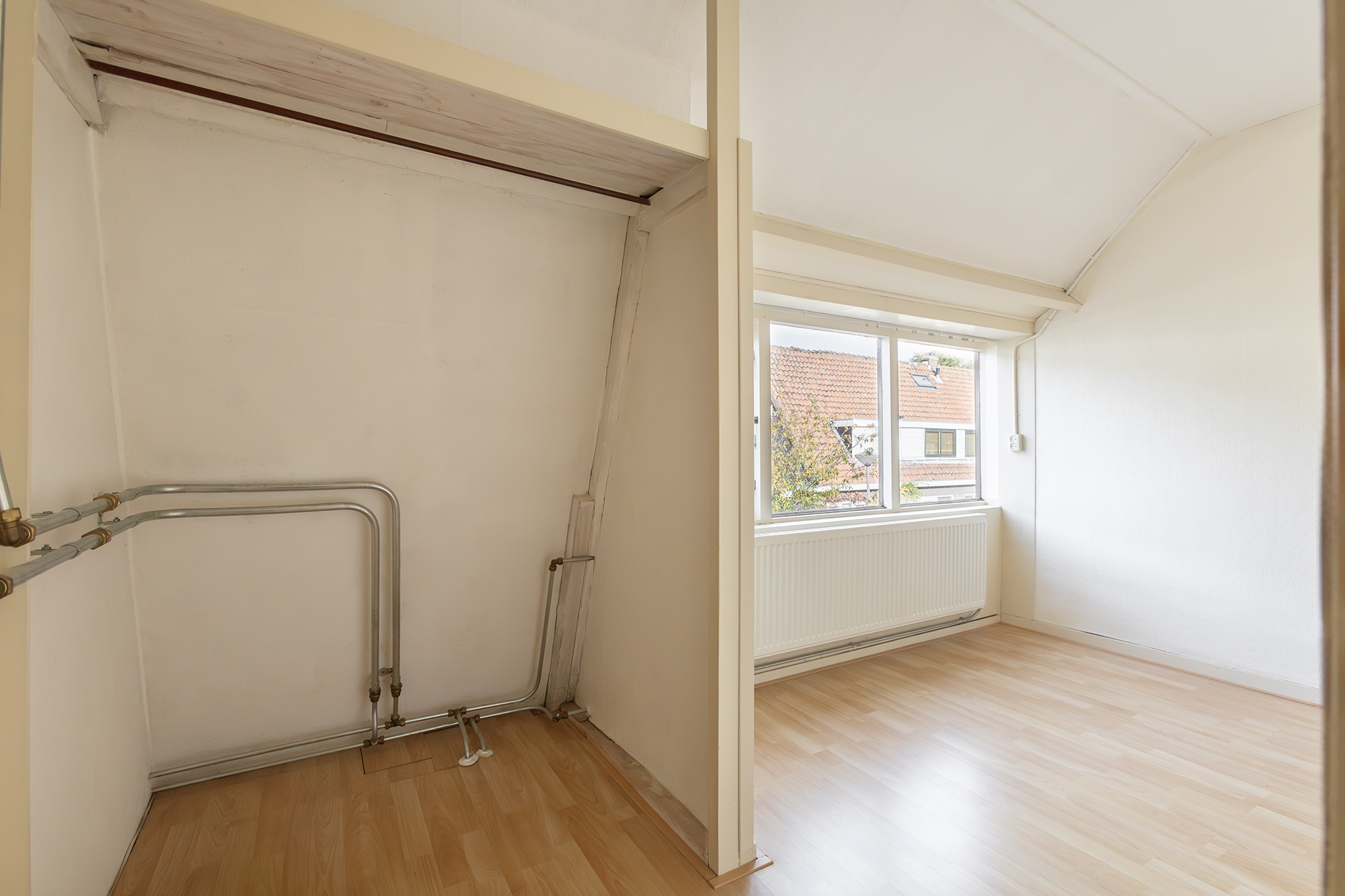 Op de eerste verdieping vind je nu nog 2 slaapkamers. De grootste kamer waren voorheen 2 kamers en is betrekkelijk eenvoudig terug te brengen naar de originele situatie. Dan ontstaan er drie fijne slaapkamers. Alle kamers zijn goed bemeten – ideaal voor gezin, werkplek of logeerfunctie. De badkamer is eenvoudig ingericht en functioneert prima; hier kun je direct in wonen of later upgraden naar jouw stijl. Via de vlizo trap kom je op de zolderverdieping, die met een dakvenster verrijkt kan worden voor extra gebruiksruimte.