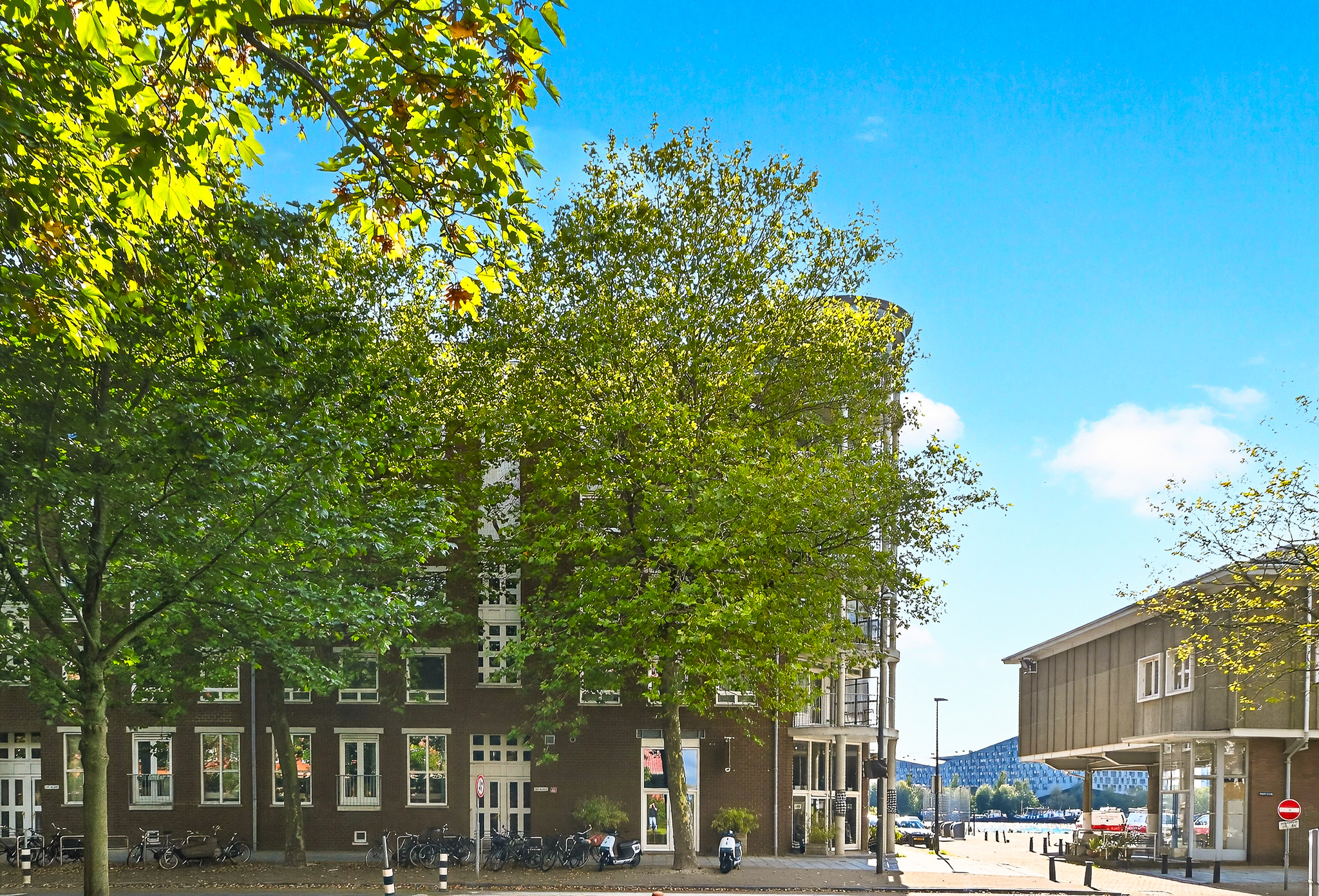 Via het verzorgde trappenhuis met grote verhuisramen bereik je de woning op de derde verdieping. De lichte woonkamer heeft grote ramen en een deur naar het balkon met uitzicht over het IJ, een heerlijke plek om van de avondzon te genieten. De massief eiken vloer en speelse indeling zorgen voor een warme en open sfeer. Aan de achterzijde ligt de ruime woonkeuken met een smaakvolle keuken voorzien inbouwapparatuur. De keuken is afgewerkt met betonverf en een werkblad van beton ciré en kijkt uit op de fraai begroeide gemeenschappelijke binnentuin.