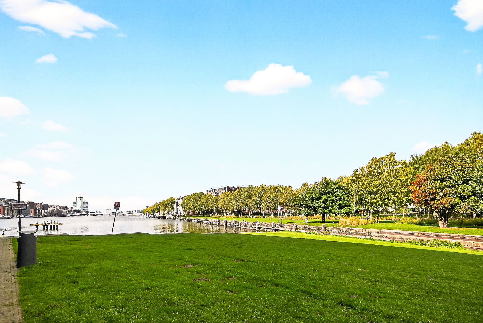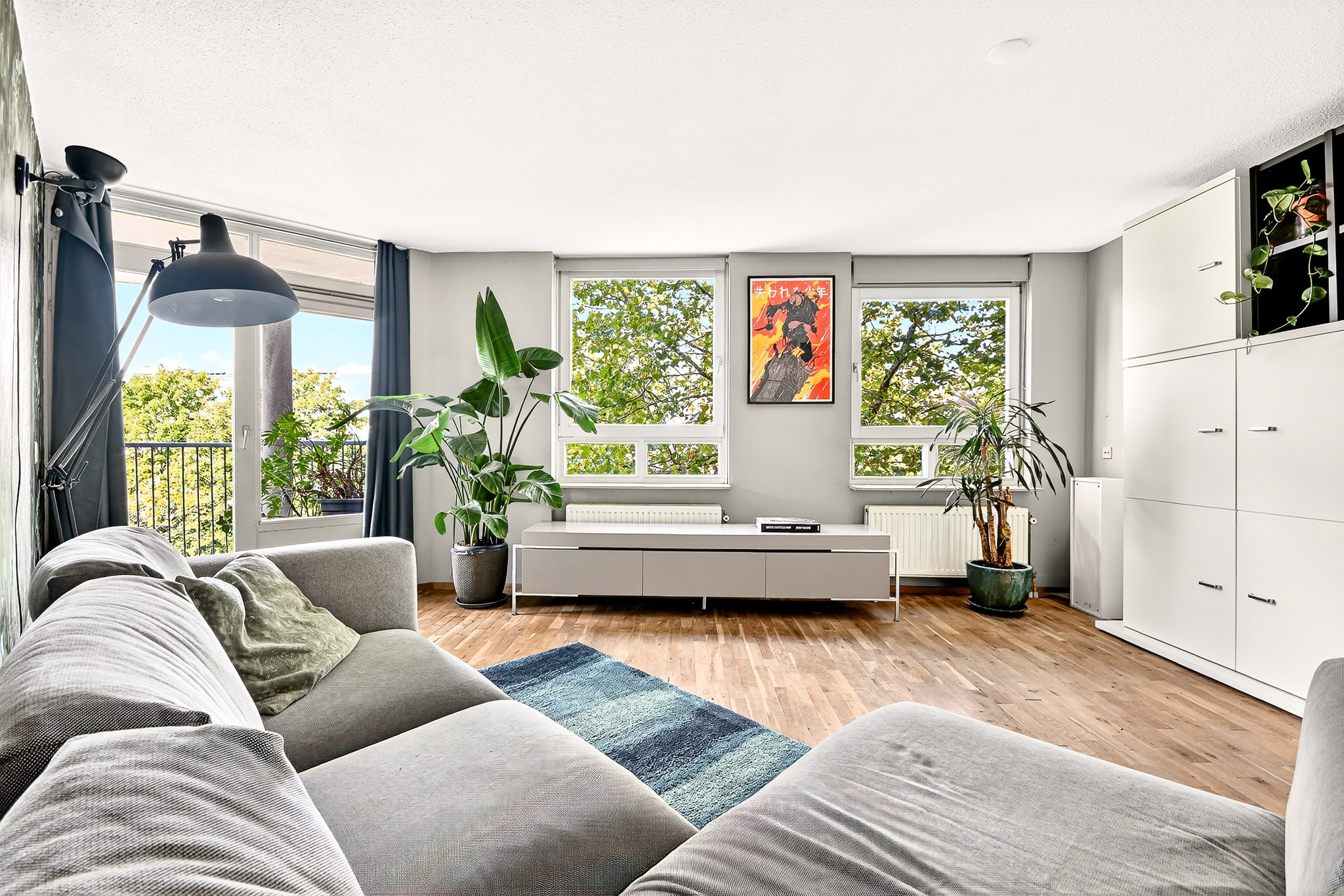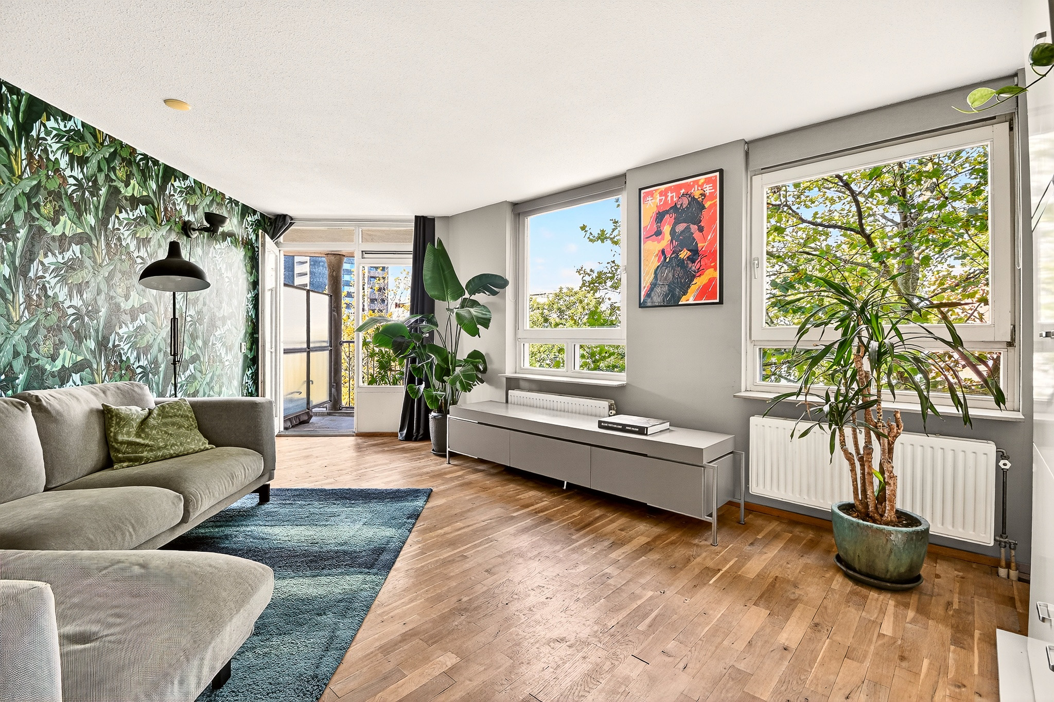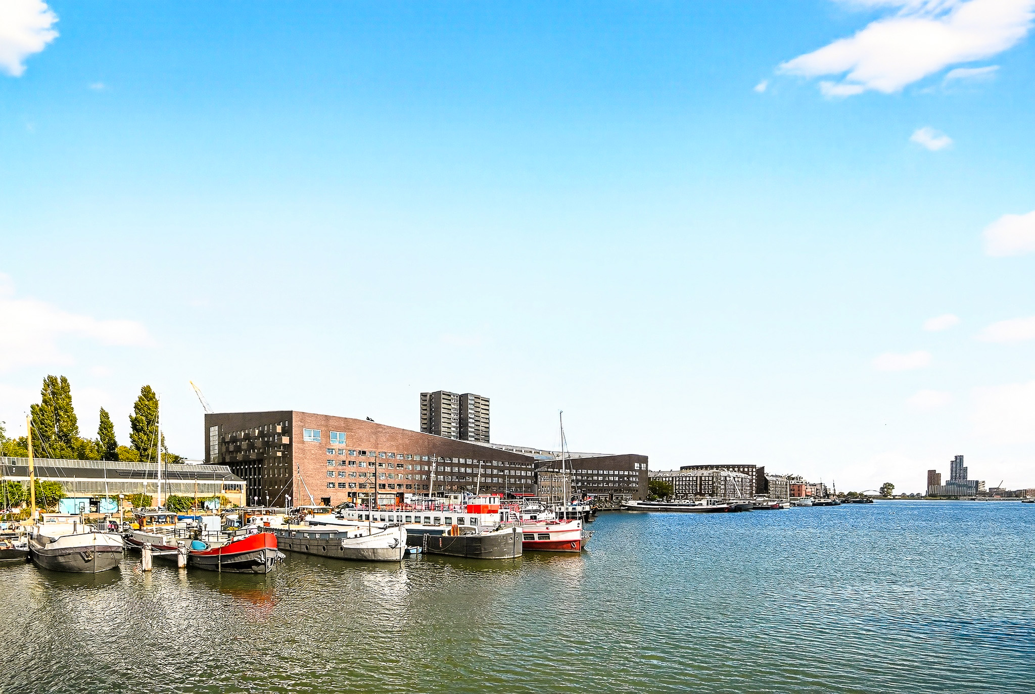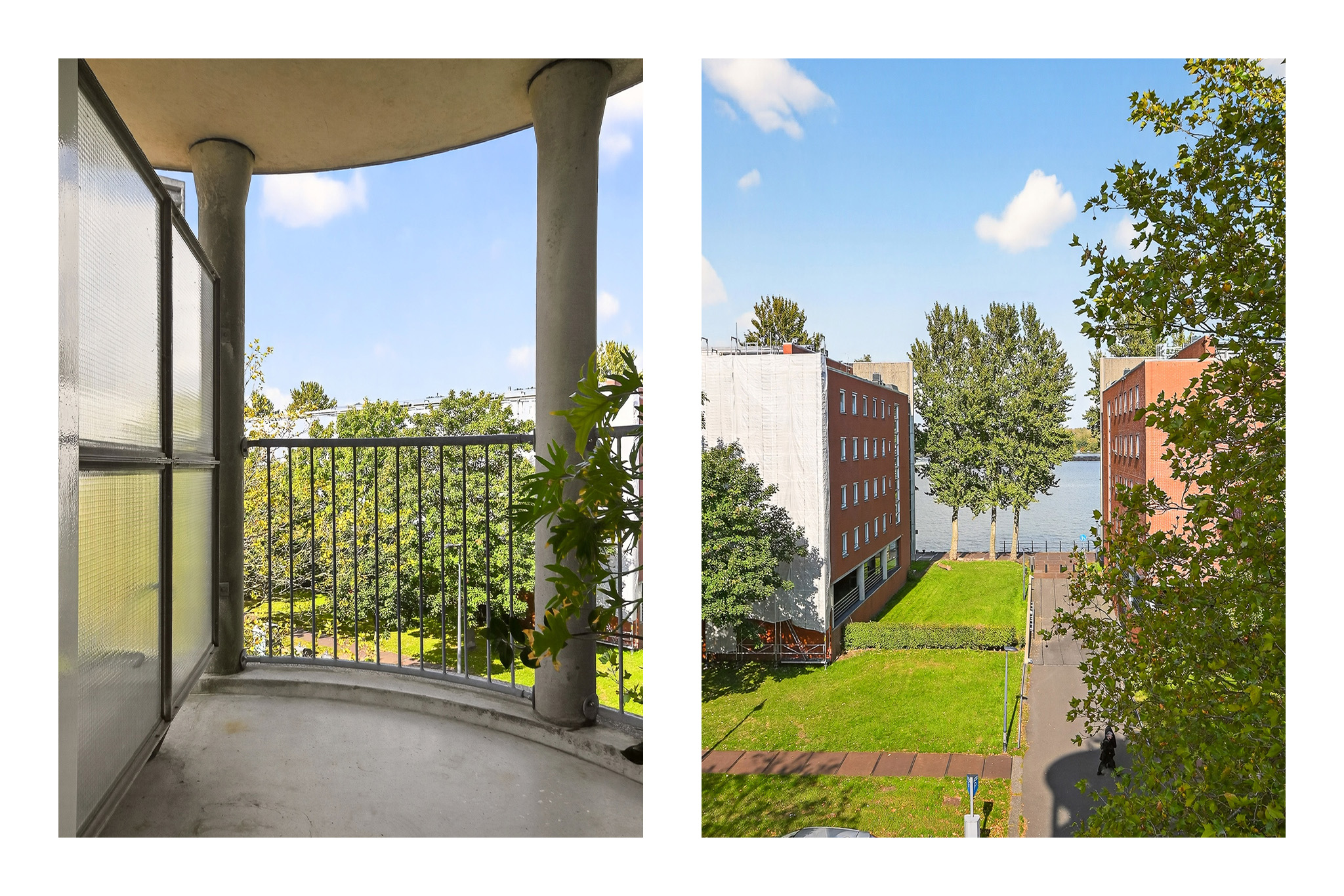 The well-maintained staircase with large moving windows leads to the third-floor flat. The bright living room has large windows and a door to the balcony with a view over the IJ, a wonderful place to enjoy the evening sun. The solid oak floor and playful layout create a warm and open atmosphere. At the rear is the spacious kitchen with a tasteful kitchen equipped with built-in appliances. The kitchen is finished with concrete paint and a concrete ciré worktop and overlooks the beautifully landscaped communal courtyard garden.