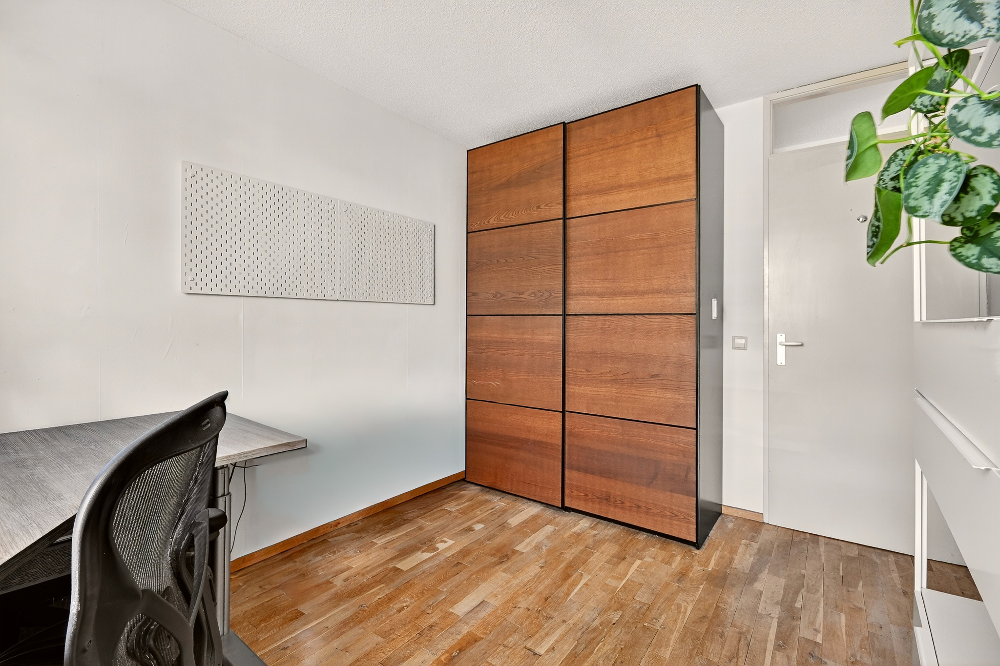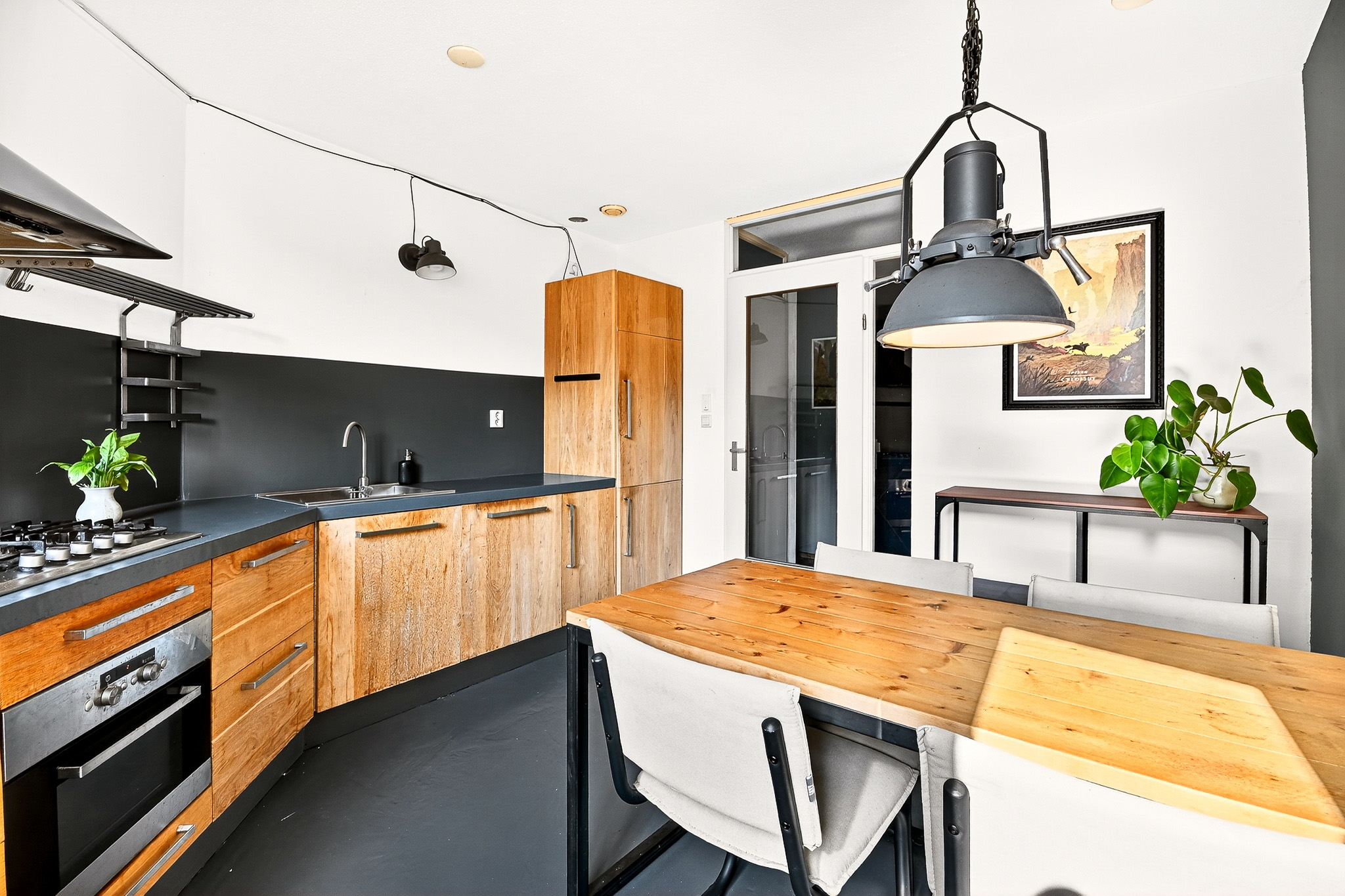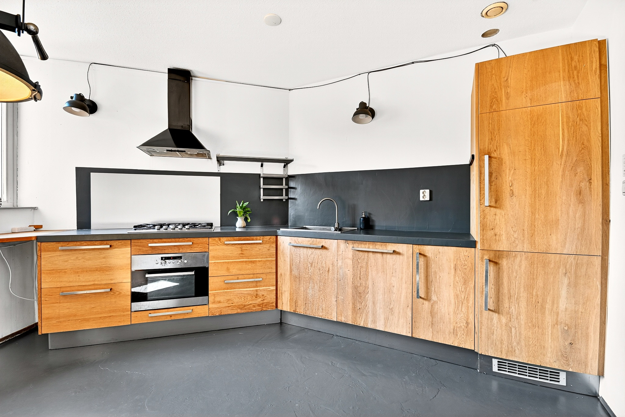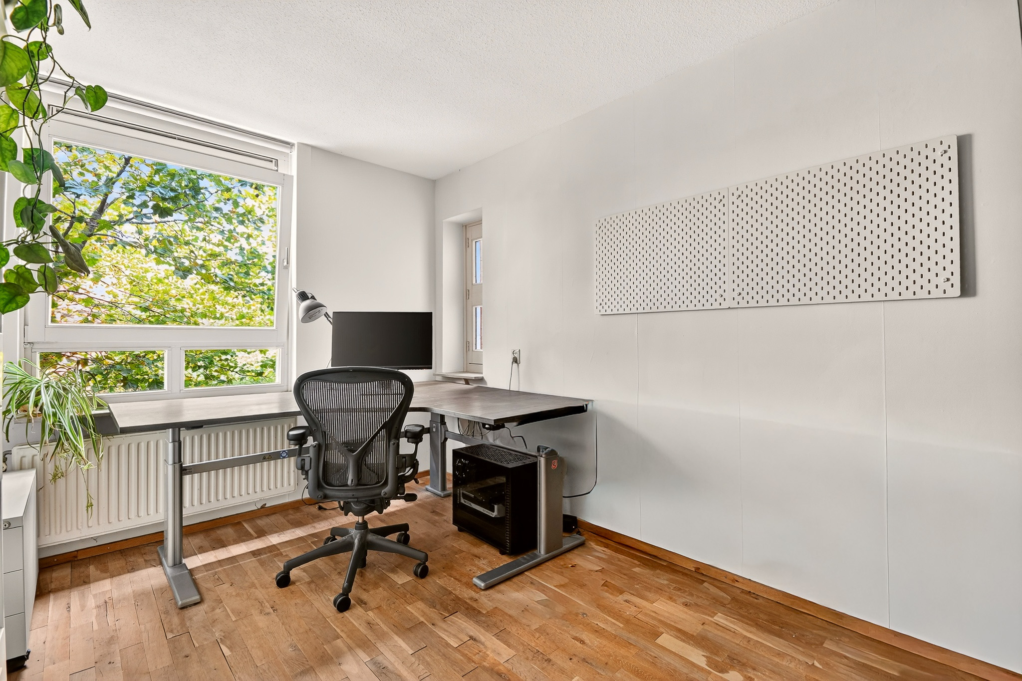 The well-maintained staircase with large moving windows leads to the third-floor flat. The bright living room has large windows and a door to the balcony with a view over the IJ, a wonderful place to enjoy the evening sun. The solid oak floor and playful layout create a warm and open atmosphere. At the rear is the spacious kitchen with a tasteful kitchen equipped with built-in appliances. The kitchen is finished with concrete paint and a concrete ciré worktop and overlooks the beautifully landscaped communal courtyard garden.