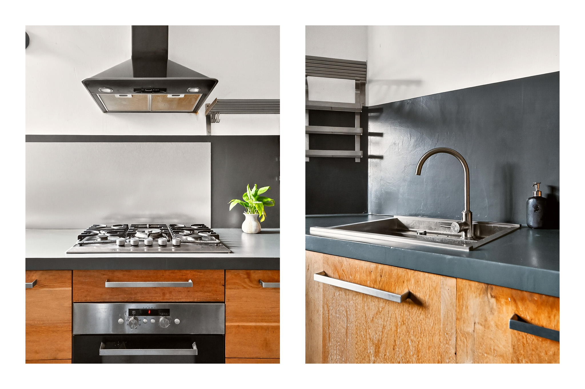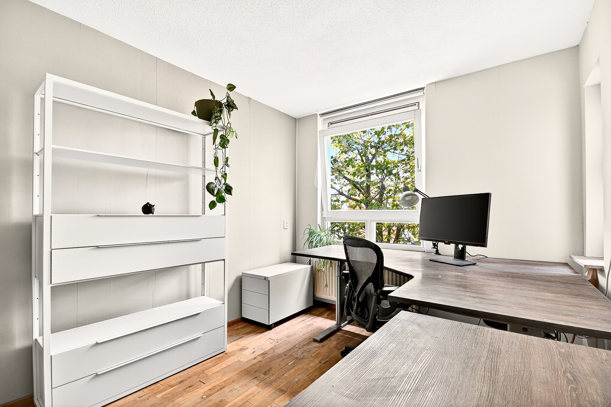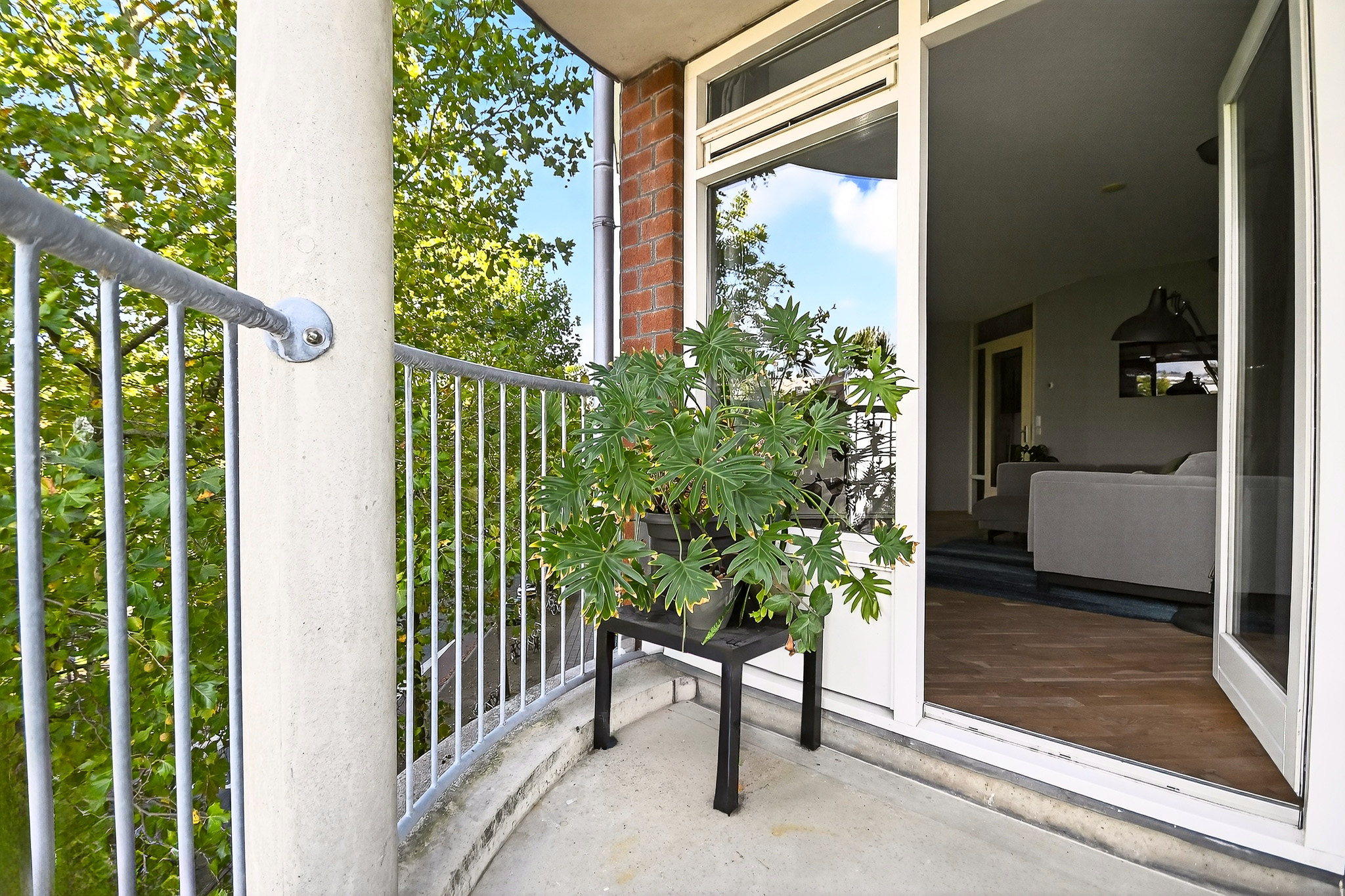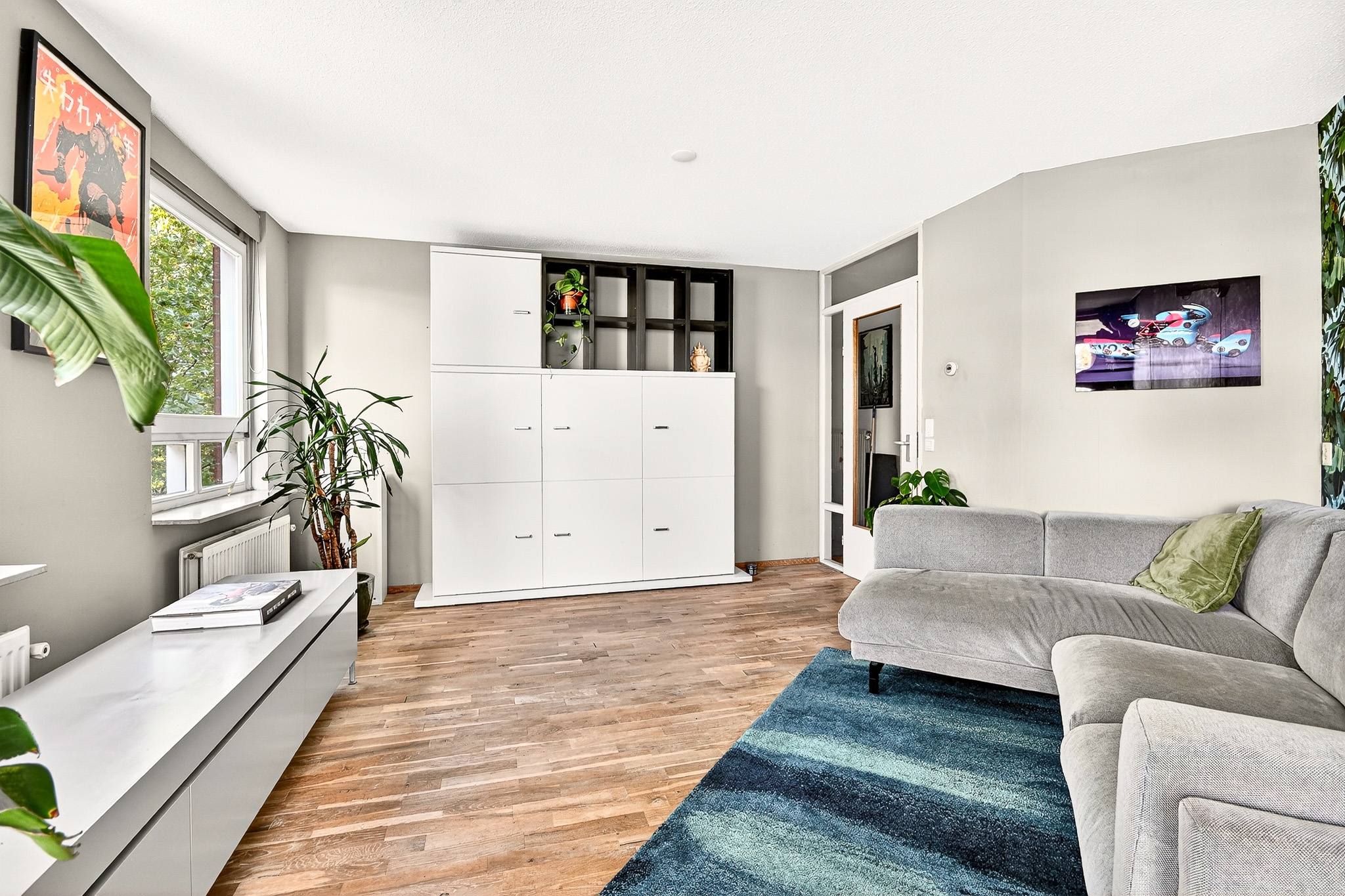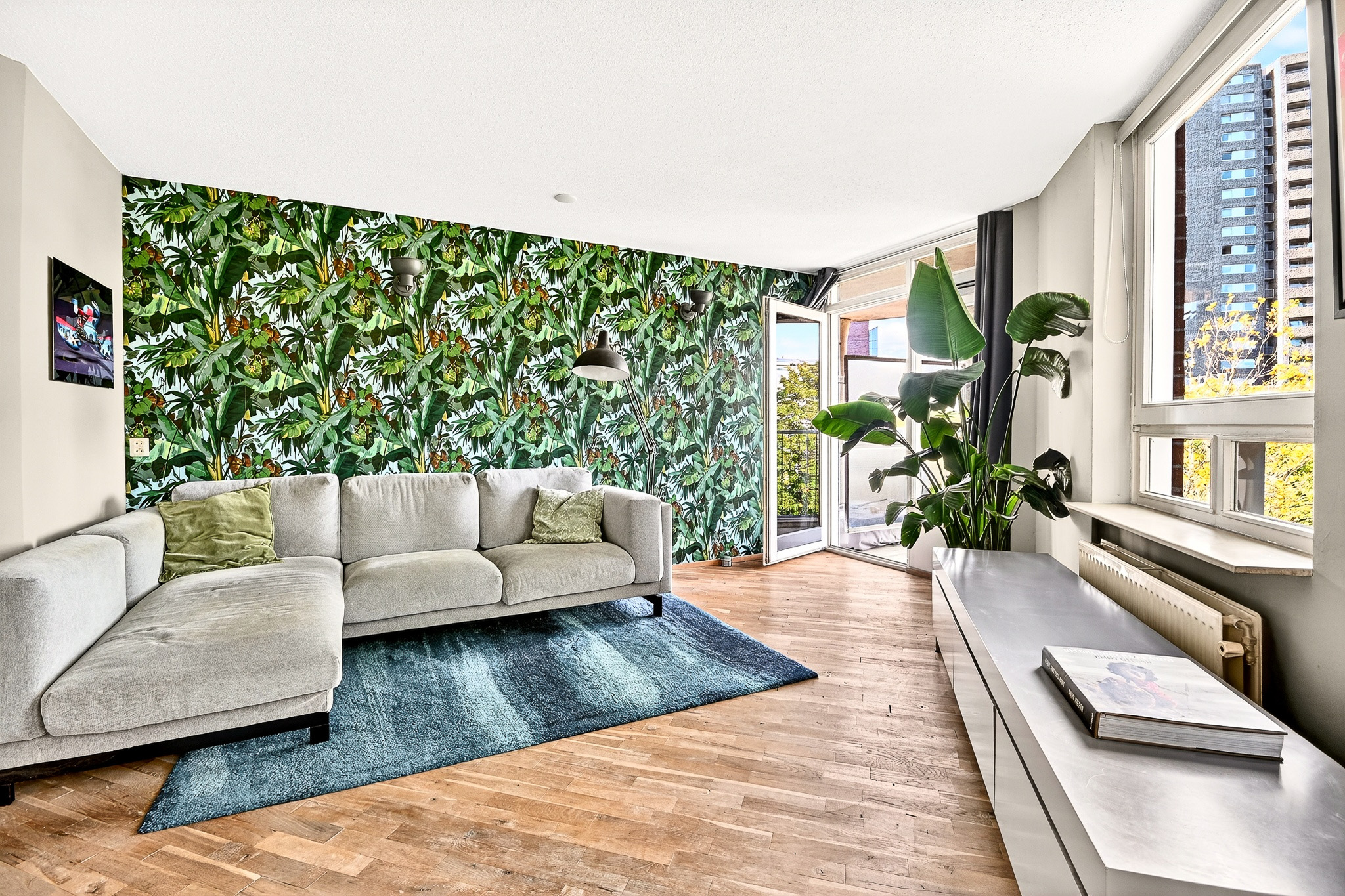 The well-maintained staircase with large moving windows leads to the third-floor flat. The bright living room has large windows and a door to the balcony with a view over the IJ, a wonderful place to enjoy the evening sun. The solid oak floor and playful layout create a warm and open atmosphere. At the rear is the spacious kitchen with a tasteful kitchen equipped with built-in appliances. The kitchen is finished with concrete paint and a concrete ciré worktop and overlooks the beautifully landscaped communal courtyard garden.