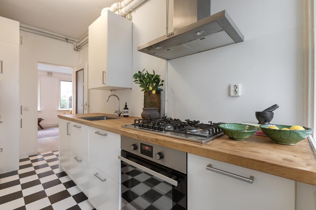 De moderne keuken is slim ontworpen en combineert functionaliteit met stijl. Het massief houten aanrechtblad geeft de keuken een warme uitstraling, terwijl de zwart-witte tegels een tijdloze en speelse touch toevoegen. De keuken grenst direct aan de tuin, wat ideaal is als je op een zonnige dag lekker buiten wilt eten.