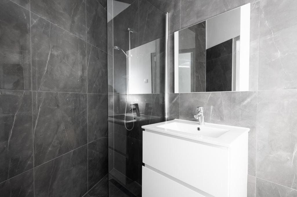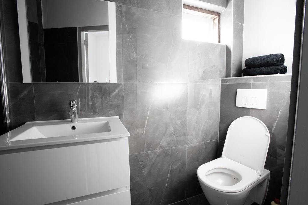 De moderne badkamer heeft een inloopdouche, wastafel en toilet.