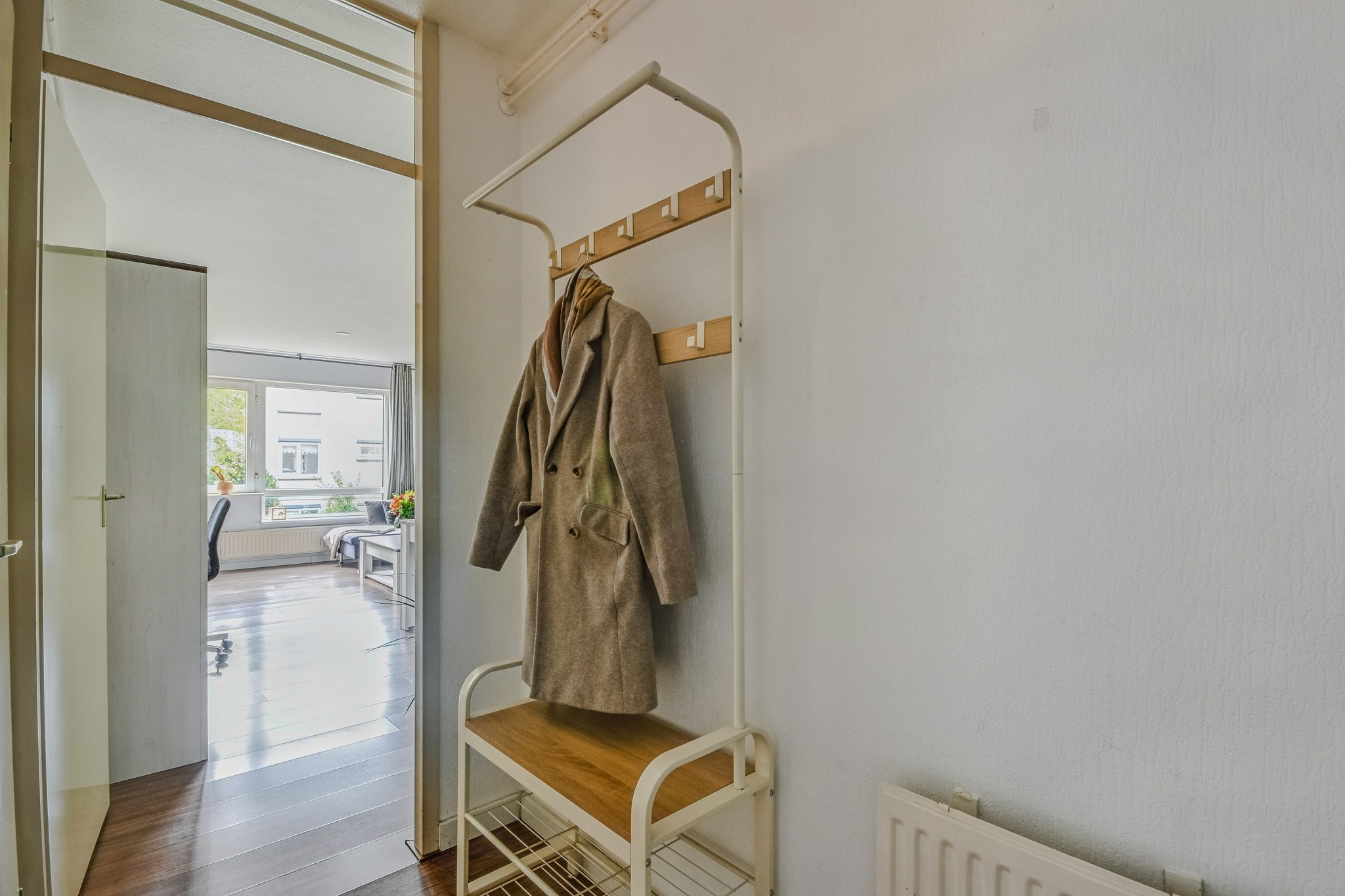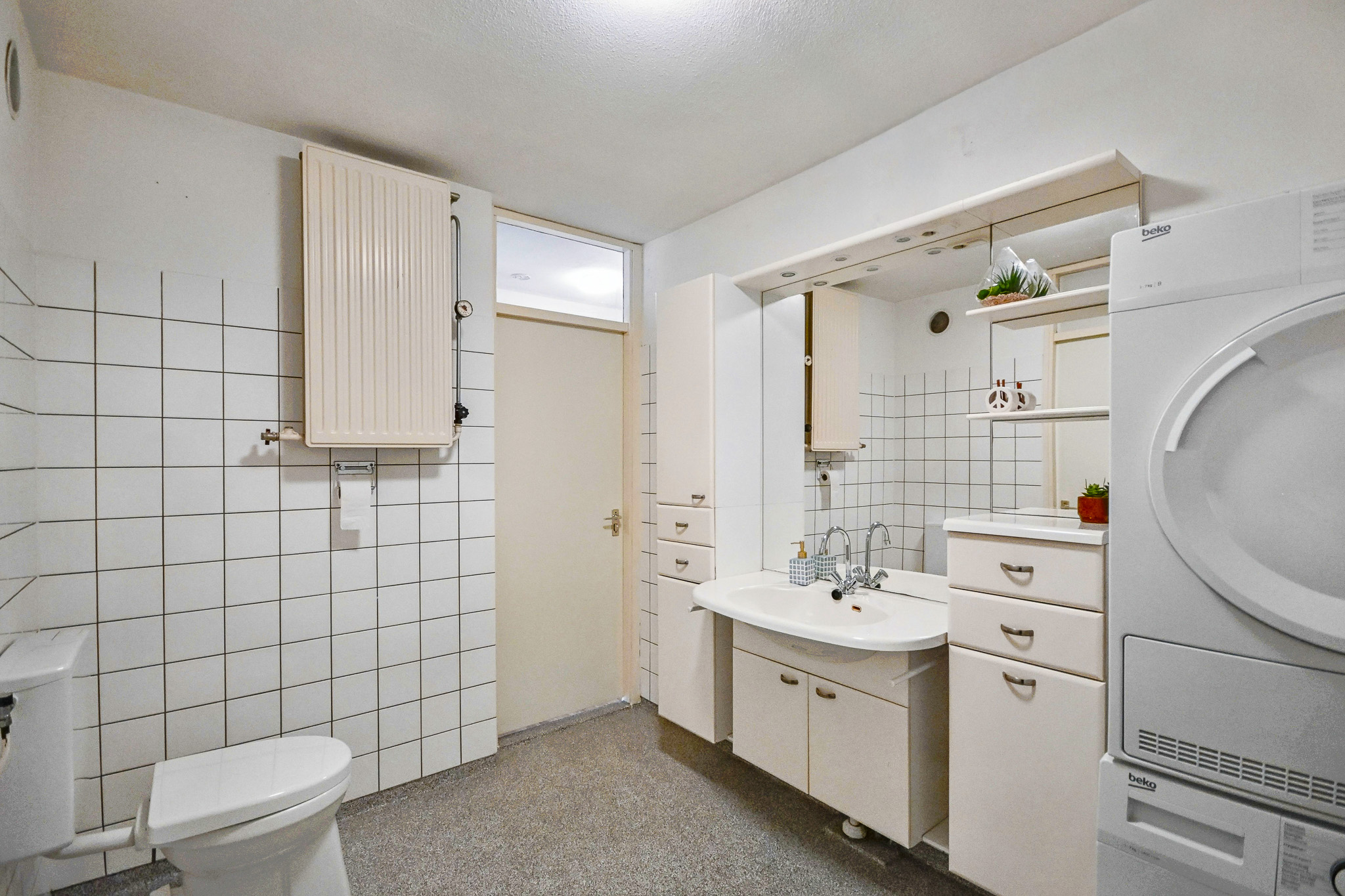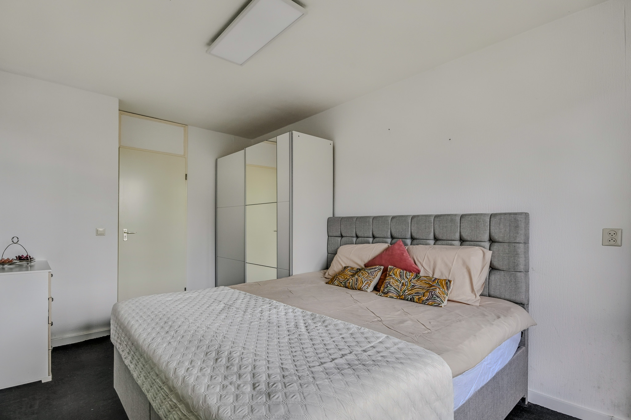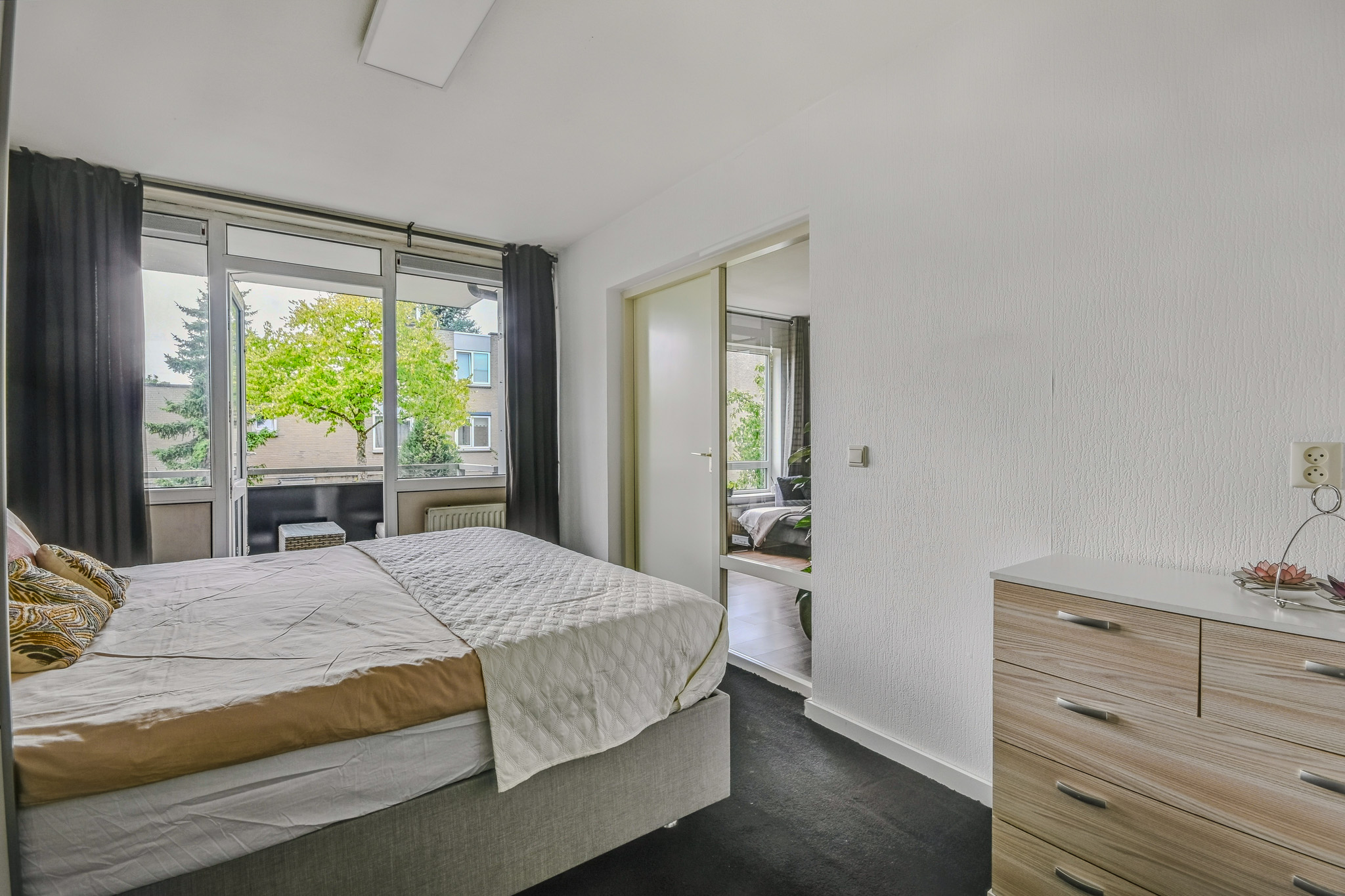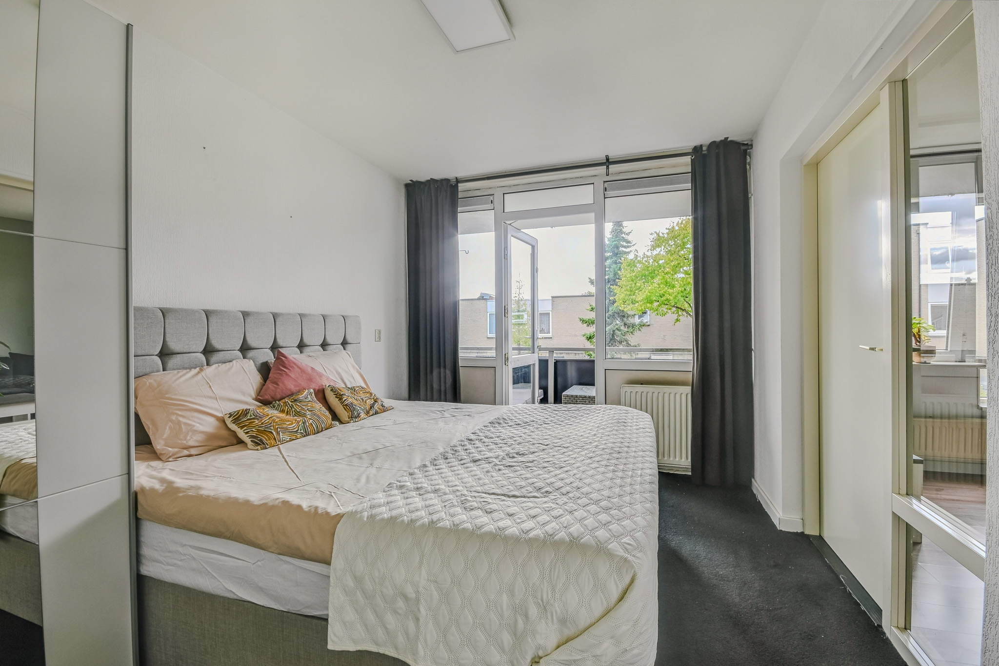 De ruime slaapkamer grenst direct aan het balkon: perfect om ’s ochtends de deuren open te gooien. De badkamer is bereikbaar vanuit zowel de hal als de slaapkamer en voorzien van een douche, wastafelmeubel, toilet en aansluiting voor de wasmachine.