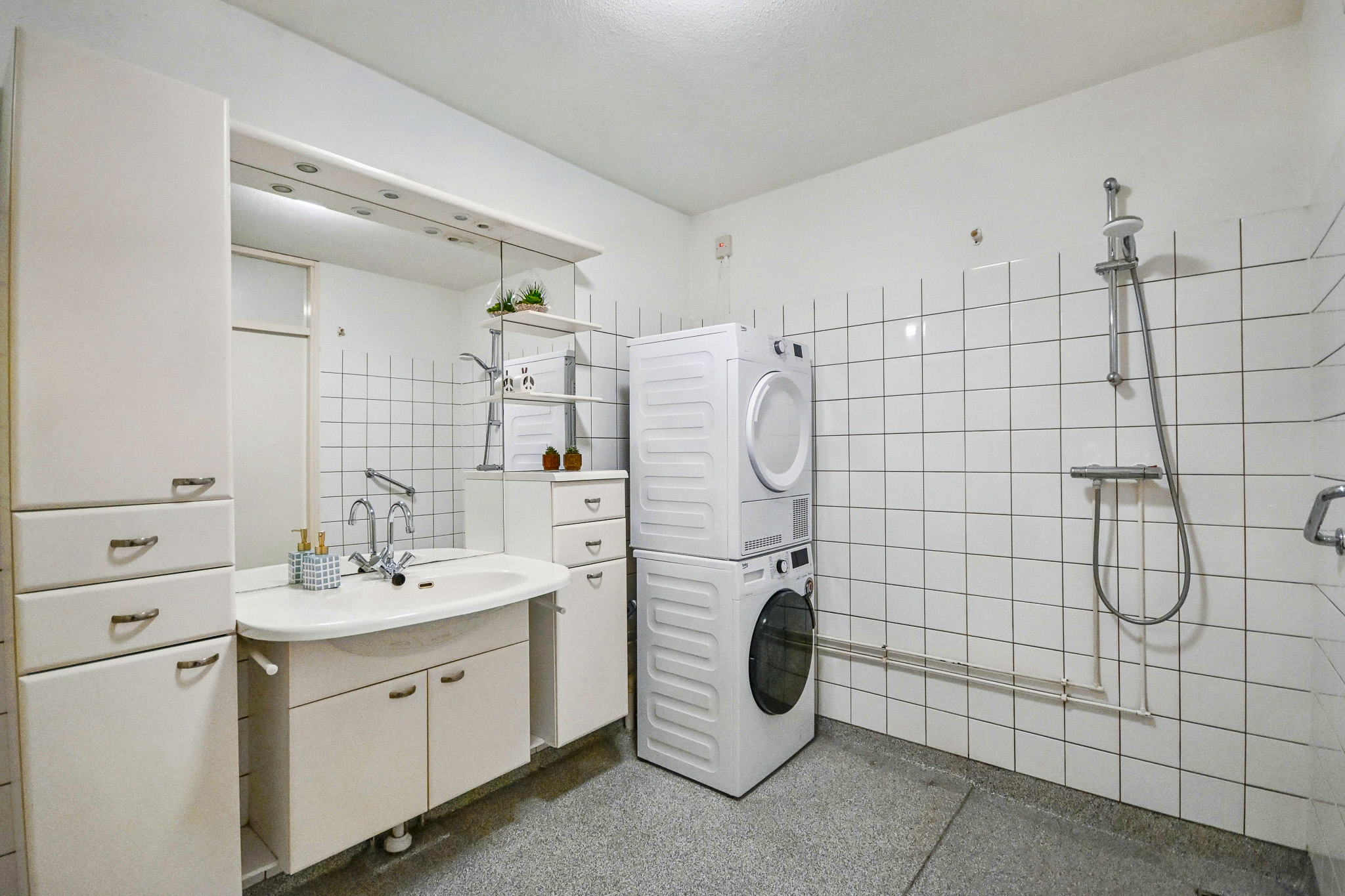 The spacious bedroom is directly adjacent to the balcony: perfect for throwing open the doors in the morning. The bathroom is accessible from both the hall and the bedroom and is equipped with a shower, washbasin, toilet and connection for a washing machine.