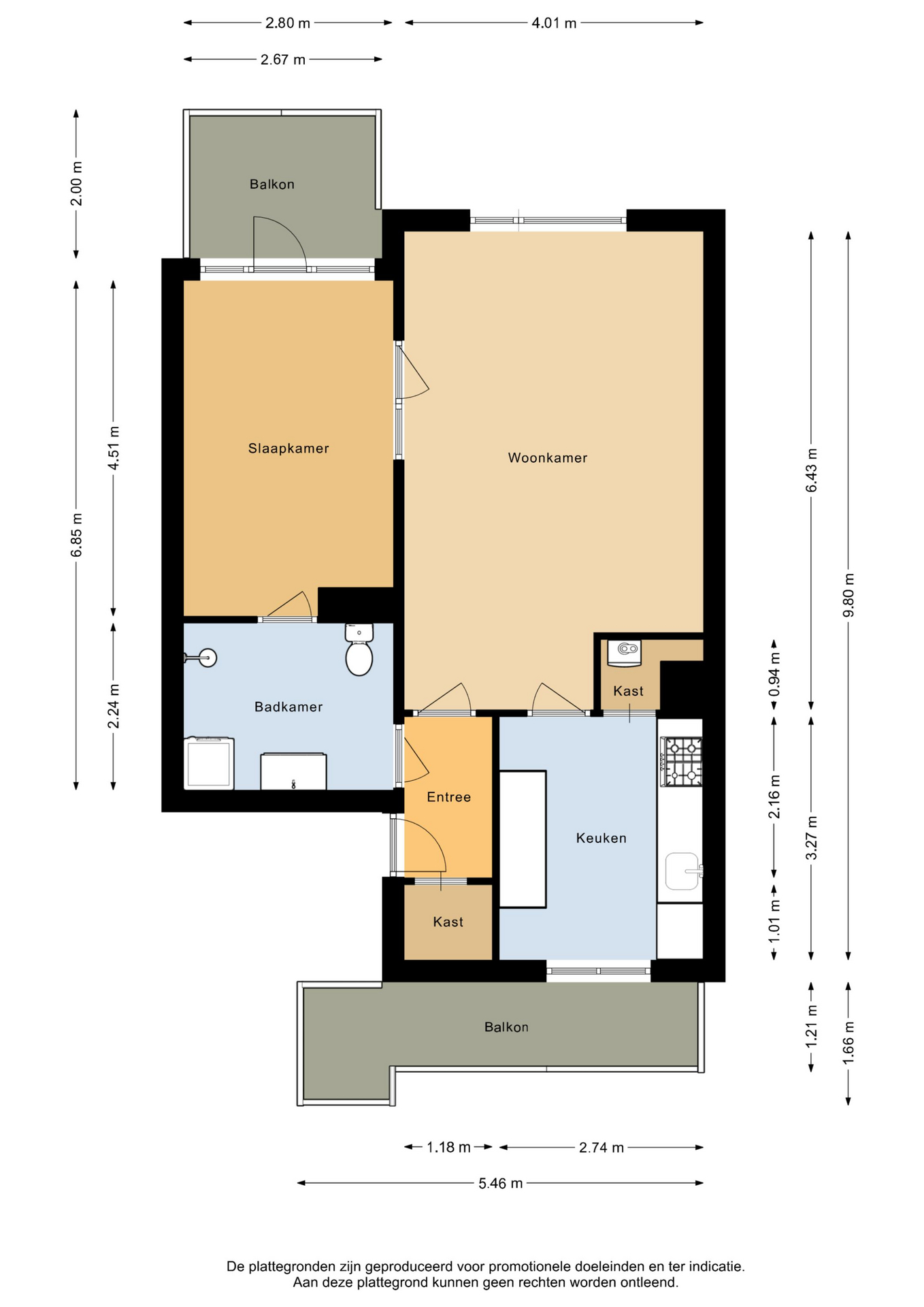 Het woonoppervlak bedraagt circa 60 m², exclusief het balkon en de berging. Meetrapport conform NEN2580 is beschikbaar.