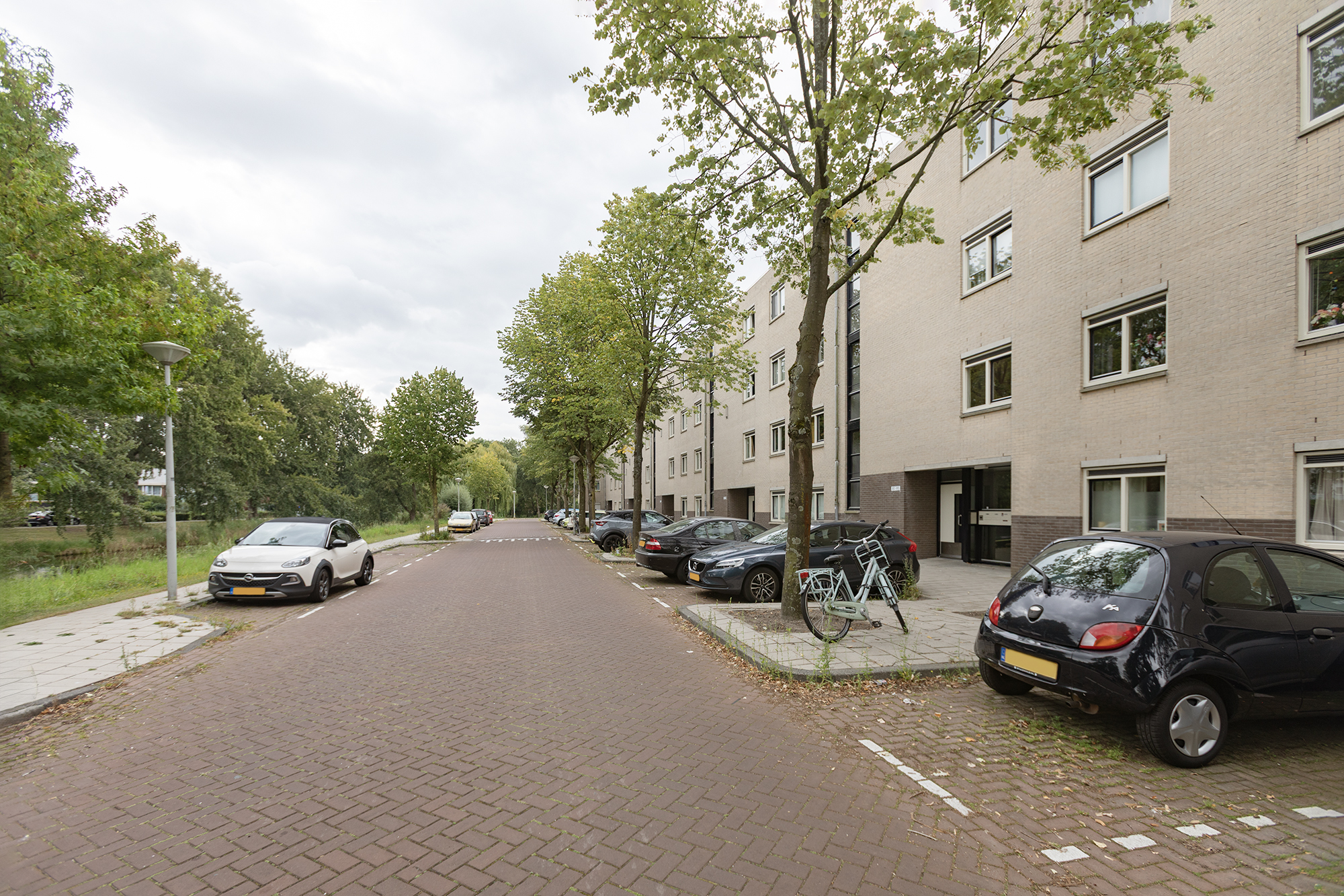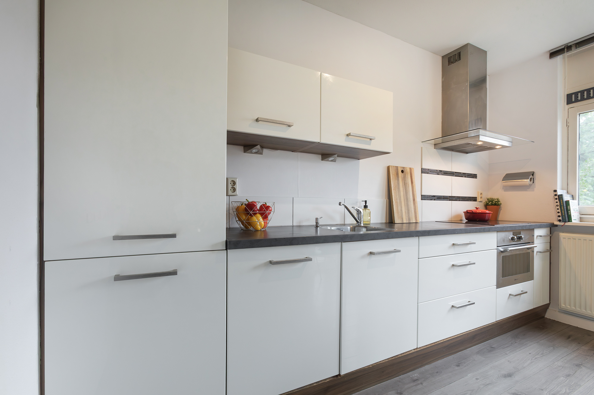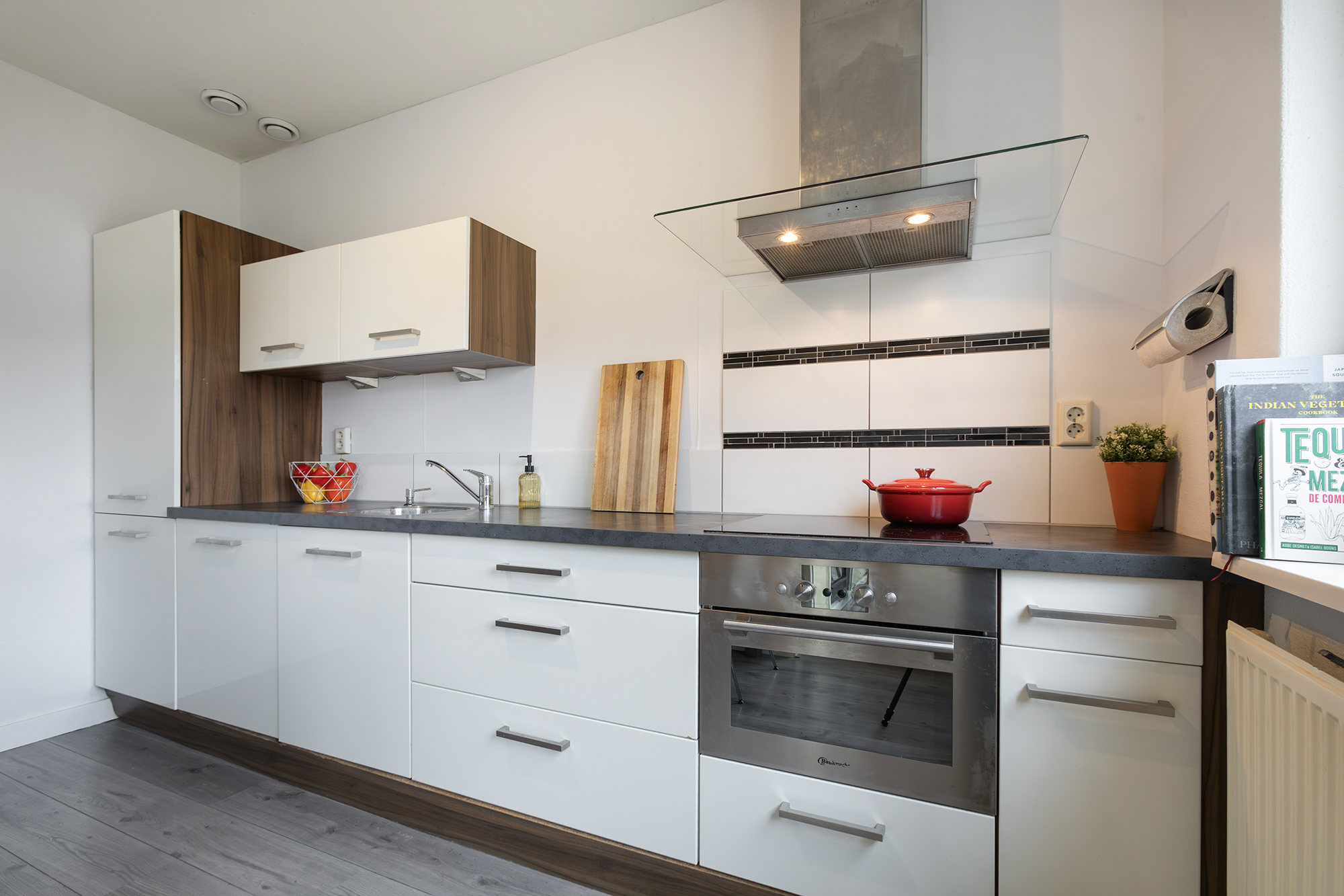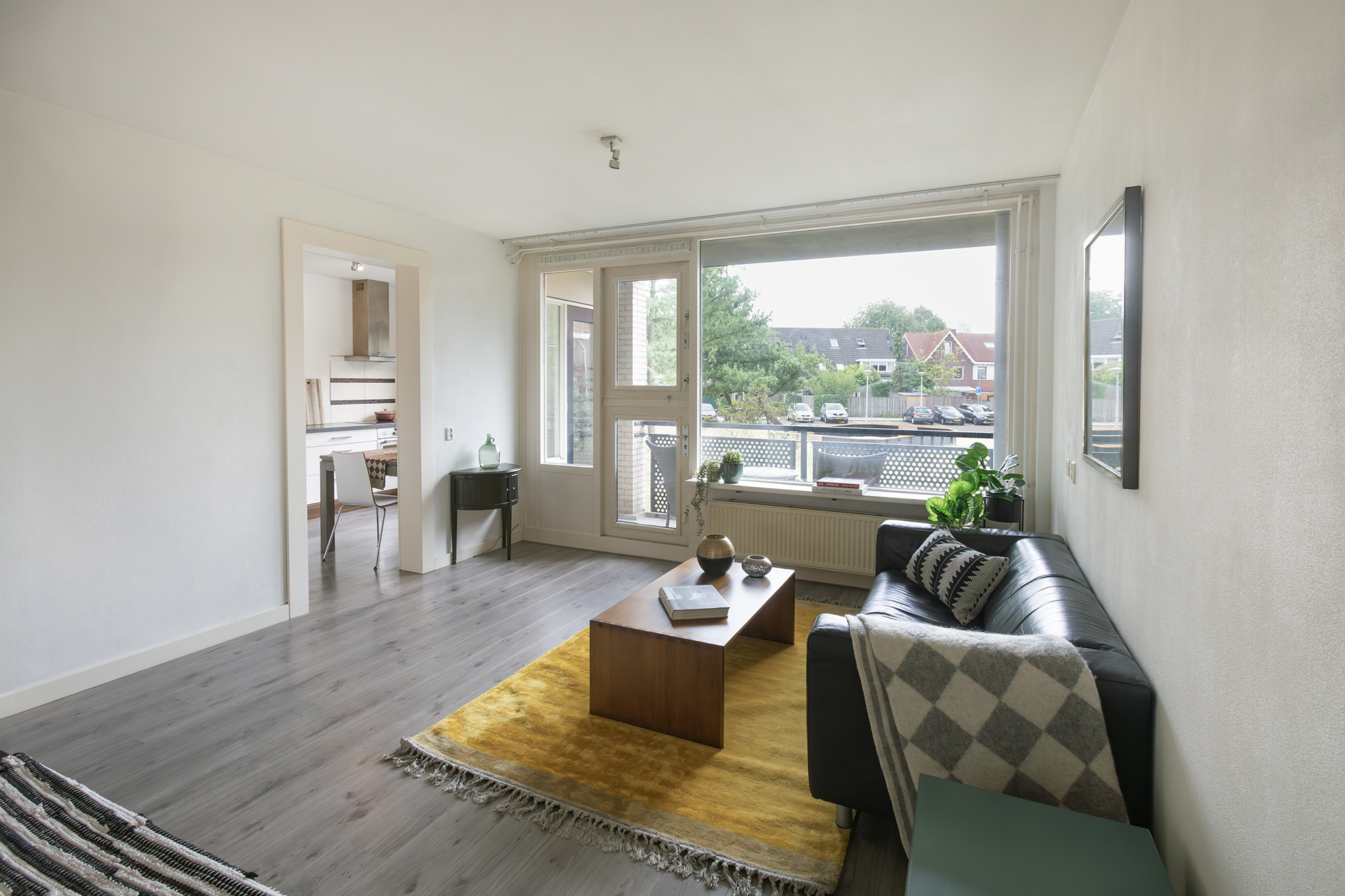 Via de gemeenschappelijke entree en trap bereik je de woning op de eerste verdieping. De hal geeft toegang tot de woonkamer, slaapkamer en badkamer. De lichte woonkamer heeft hoge plafonds en gesausde wanden, wat zorgt voor een ruimtelijk gevoel. Vanuit de woonkamer bereik je de moderne open keuken met diverse inbouwapparatuur. Er is genoeg ruimte voor een eettafel, waardoor je tijdens het bakken en koken gezellig met elkaar kunt praten.