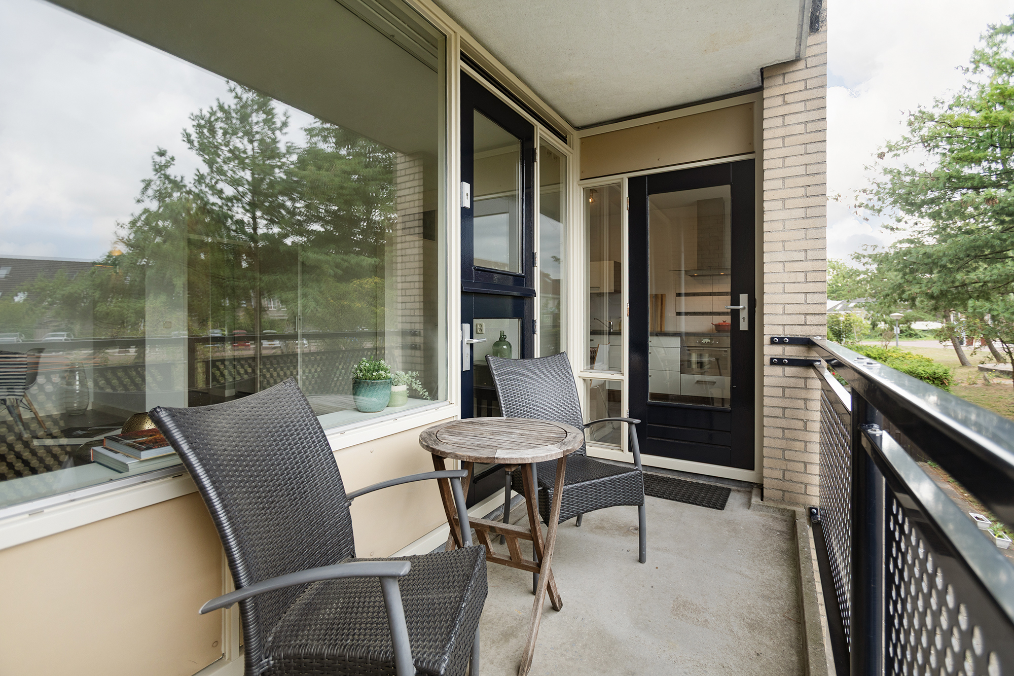 Aan de achterzijde van het complex ligt een heerlijk balkon op het zuiden. Dit balkon grenst aan de keuken en woonkamer en is vanuit beide ruimtes toegankelijk. Dankzij de ligging kun je hier heerlijk zitten van de vroege lente tot ver in de herfst.